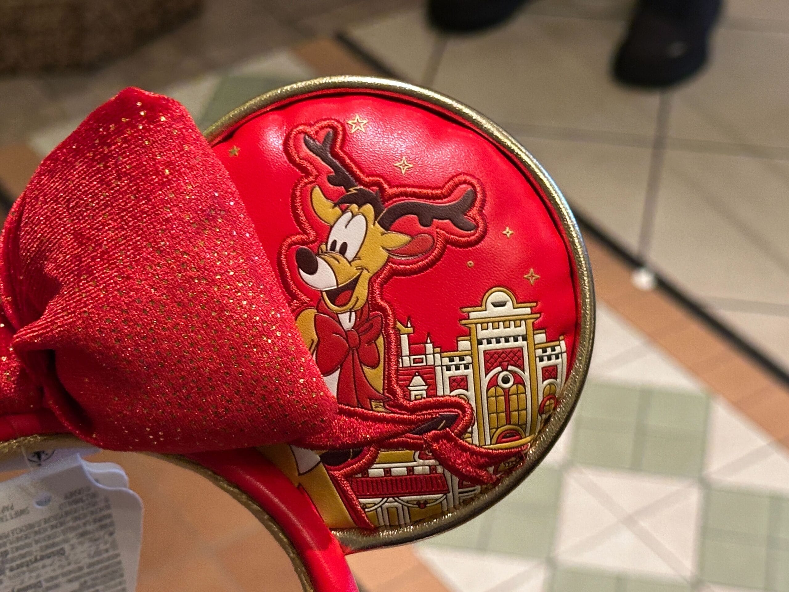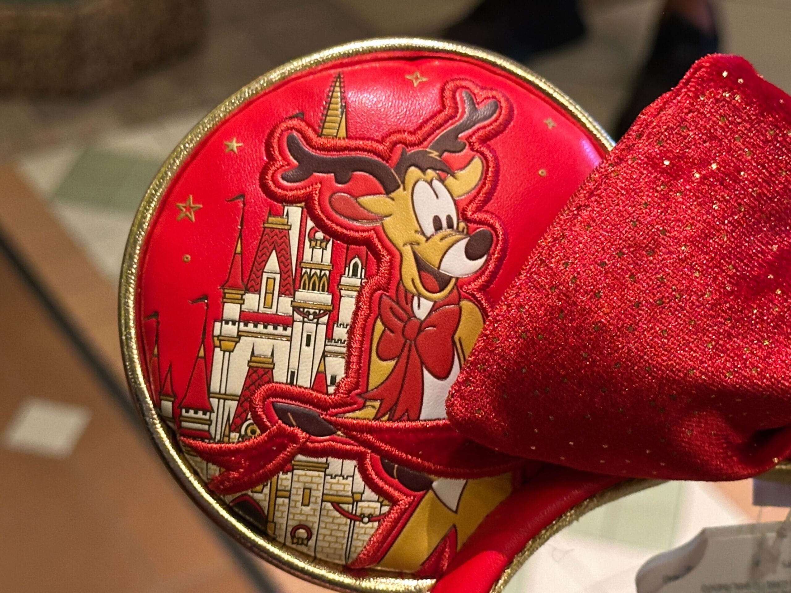The party-exclusive ear headband is made of red faux leather with a soft red velvet bow speckled with gold. Each ear has gold-colored piping and features a reindeer in front of Cinderella Castle (left) and Main Street, U.S.A. (right).
