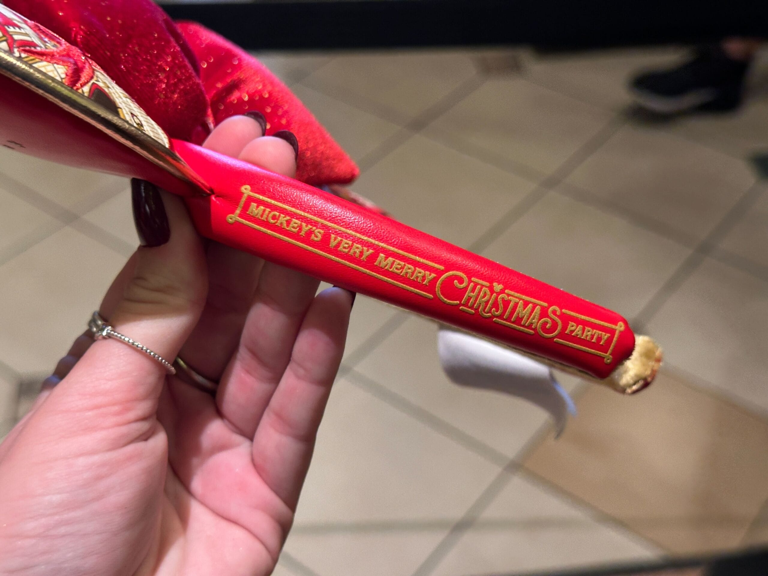 The headband is printed with a gold “2025” and Mickey’s Very Merry Christmas Party logo. The inside is lined in gold non-slip velour.