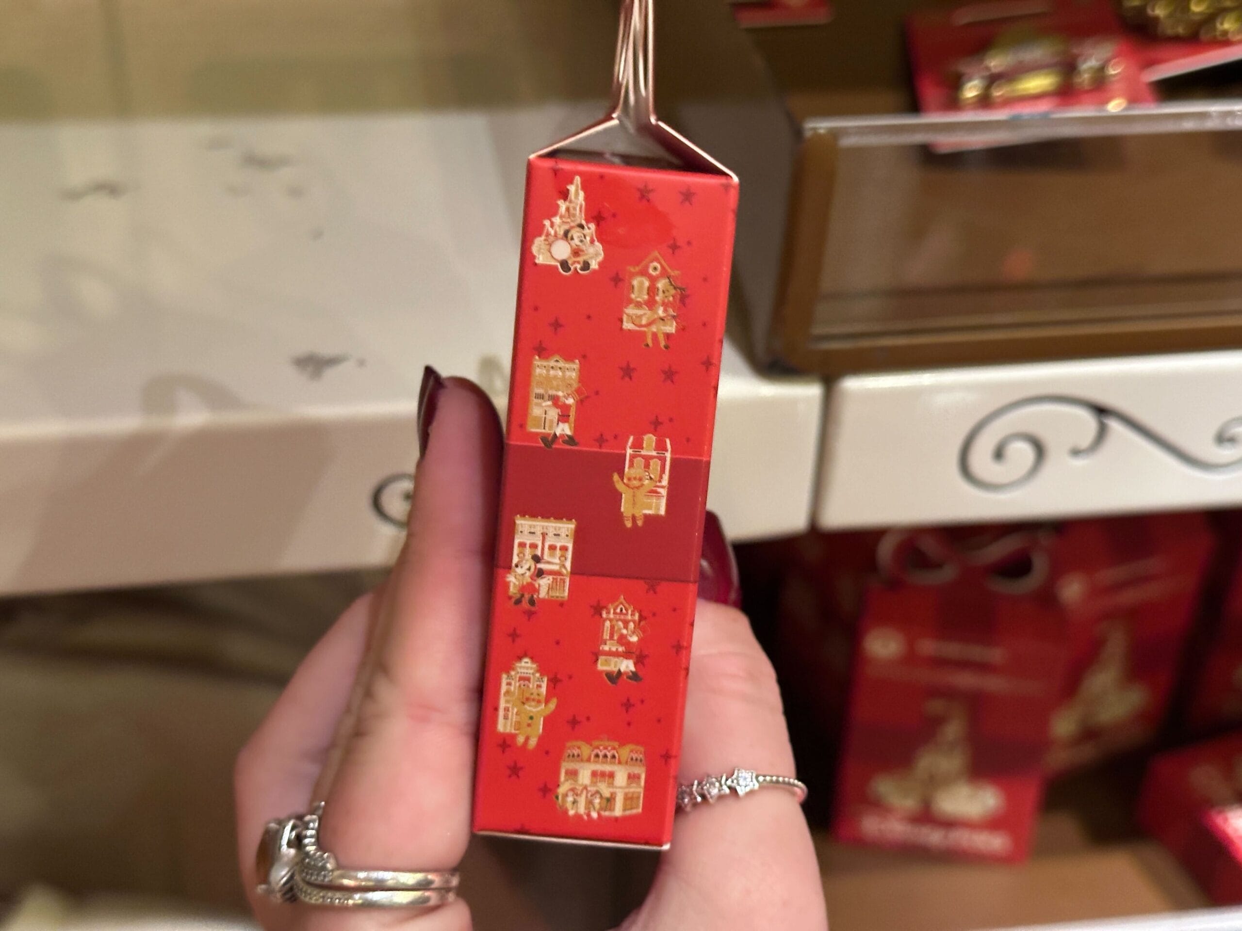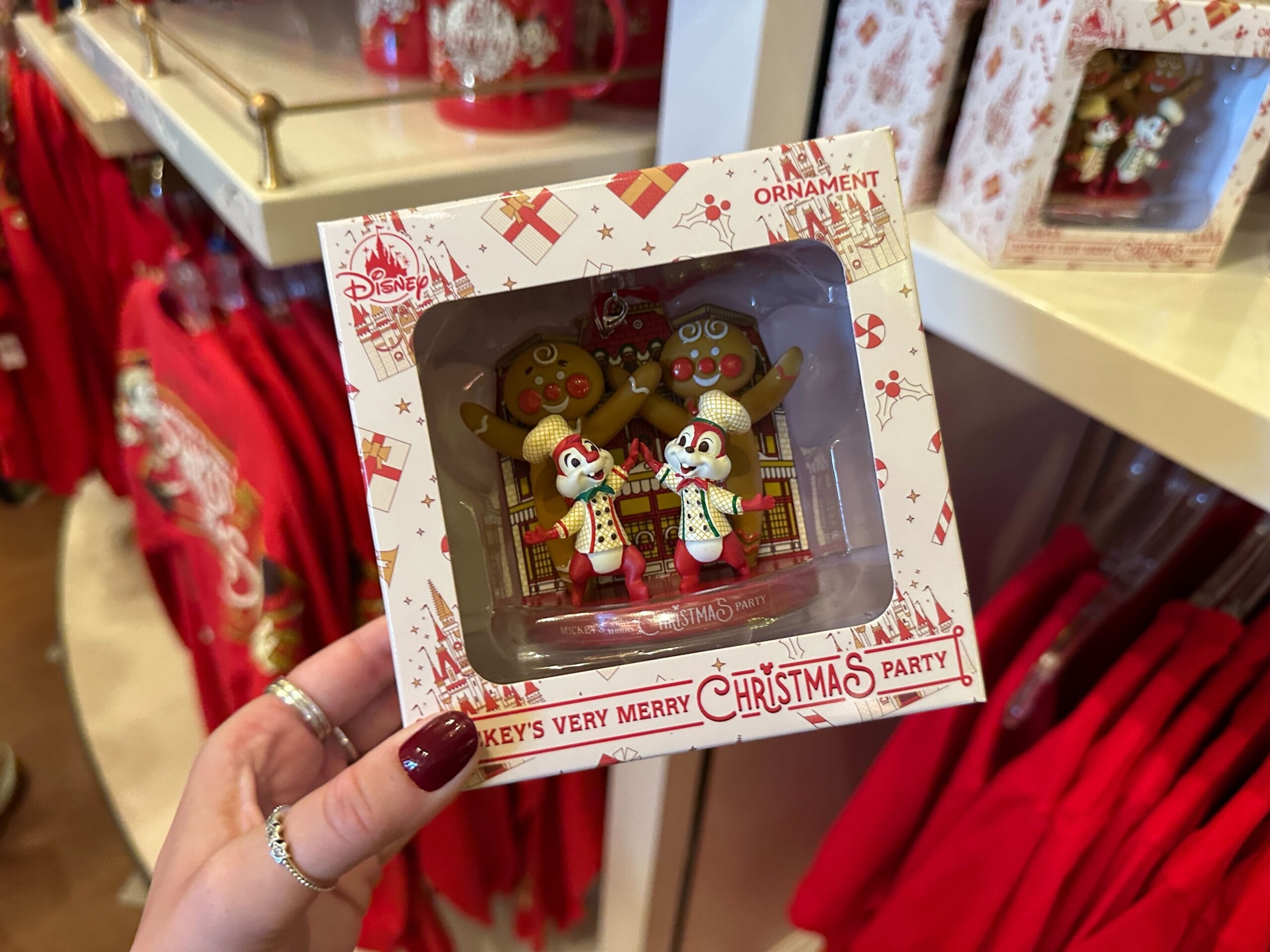 Chip and Dale come to life as Christmas chefs in this ornament. Dressed in checkered chef’s coats with red and green piping, the chipmunks high-five in front of two large gingerbread men and the Main Street Confectionery. The Mickey’s Very Merry Christmas Party logo is across the base in white.