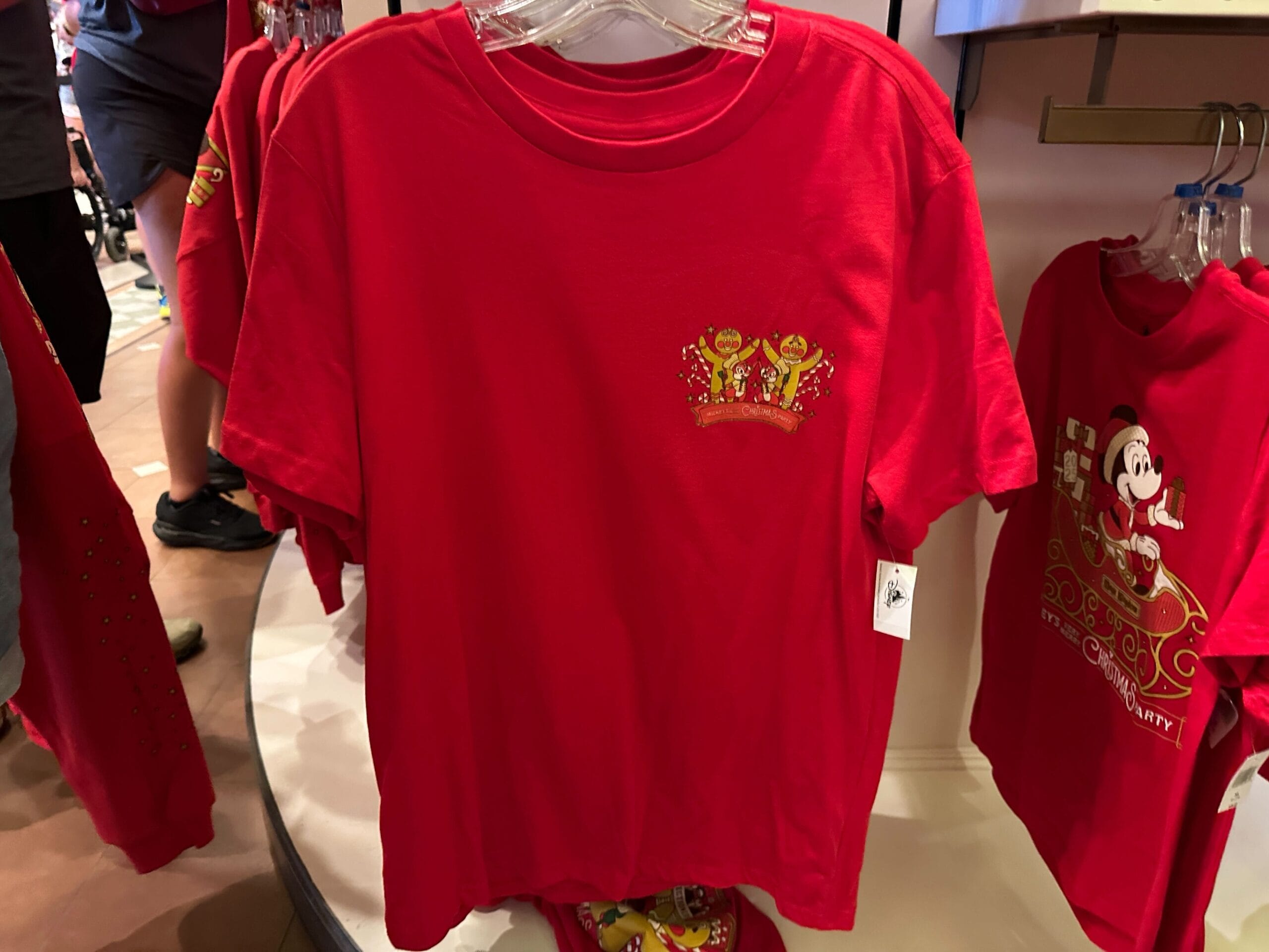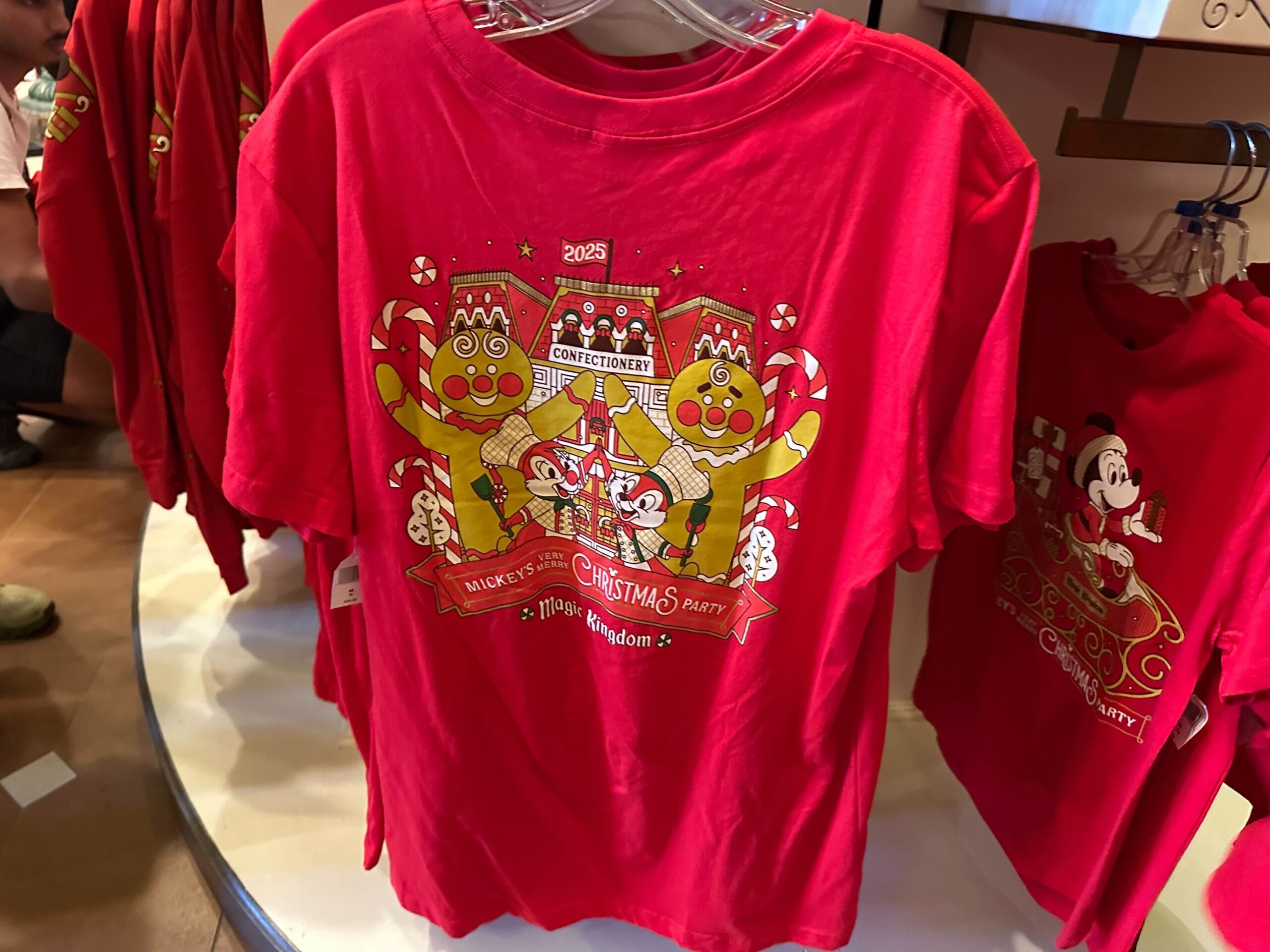 The adult red T-shirt features Chip and Dale in holiday chef outfits with two large gingerbread men. A small version is on the front left chest above a Mickey’s Very Merry Christmas Party logo banner, while it’s much larger on the back with an additional stylized background of the Main Street Confectionery facade and a small Magic Kingdom logo on the bottom.