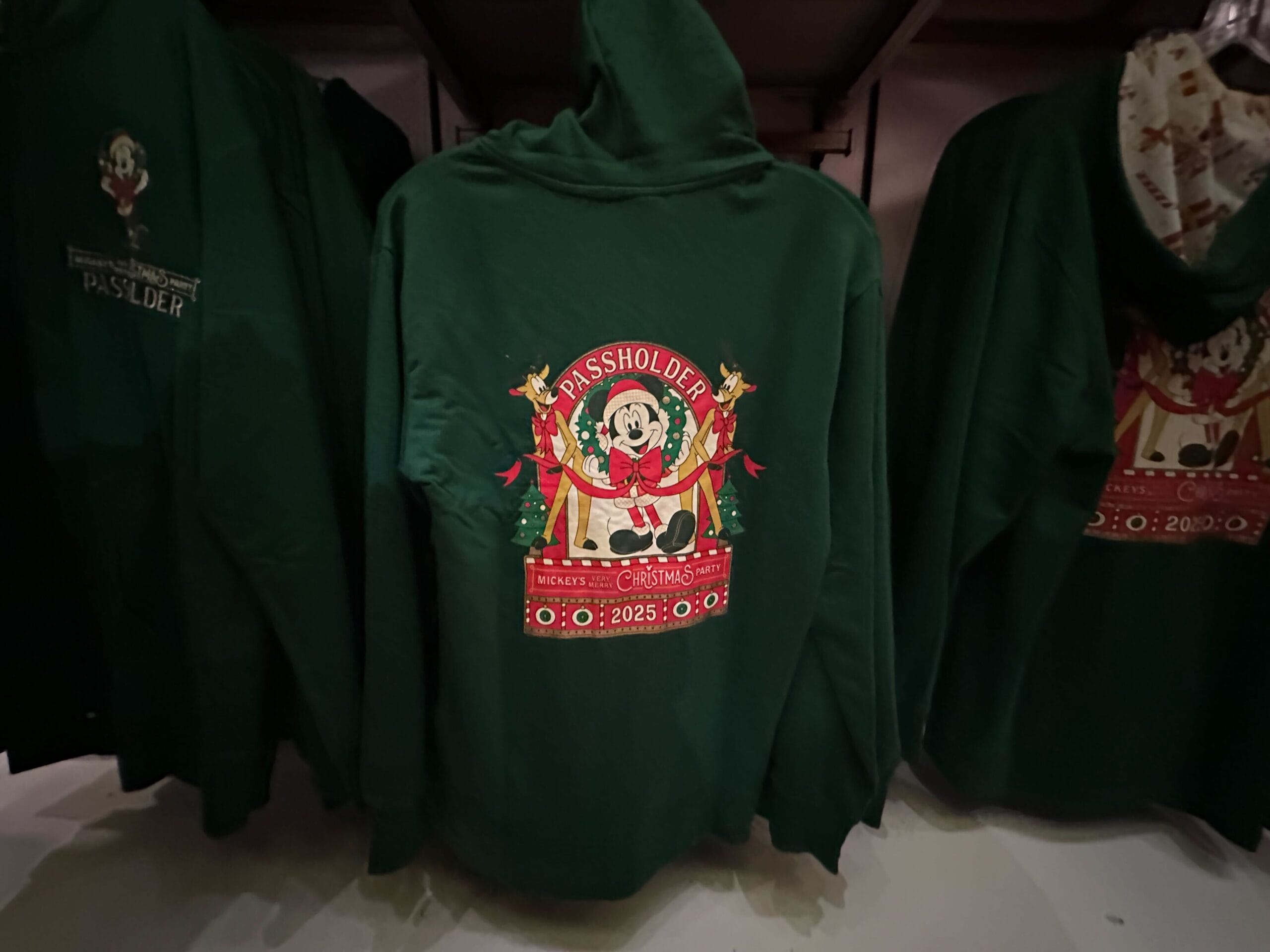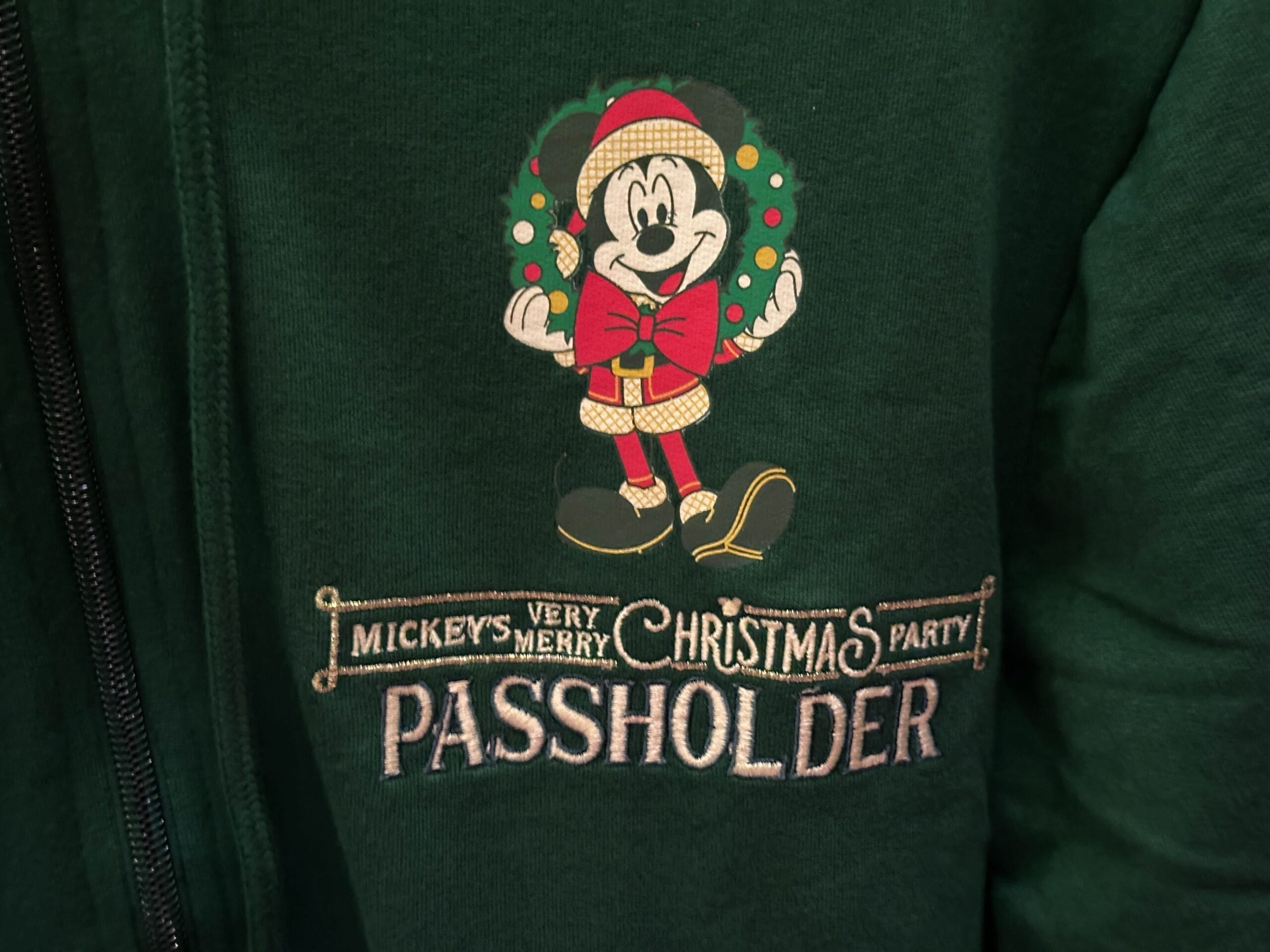 Annual Passholders can pick up this vibrant green zip-up hooded sweatshirt. The left chest has a graphic of Mickey in a Santa outfit poking his head through a wreath; he stands above the Mickey’s Very Merry Christmas Party wordmark and “Passholder.”