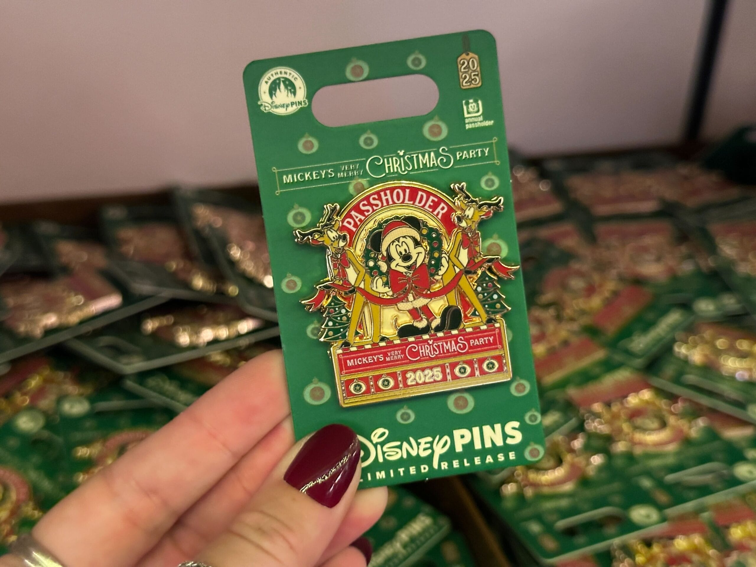 Santa Mickey is also on an exclusive pin with “Passholder” on an archway behind him and two reindeer beside him. “Mickey’s Very Merry Christmas Party” and “2025” are at the bottom of the pin. This is the same design featured on the back of the Annual Passholder event hoodie.