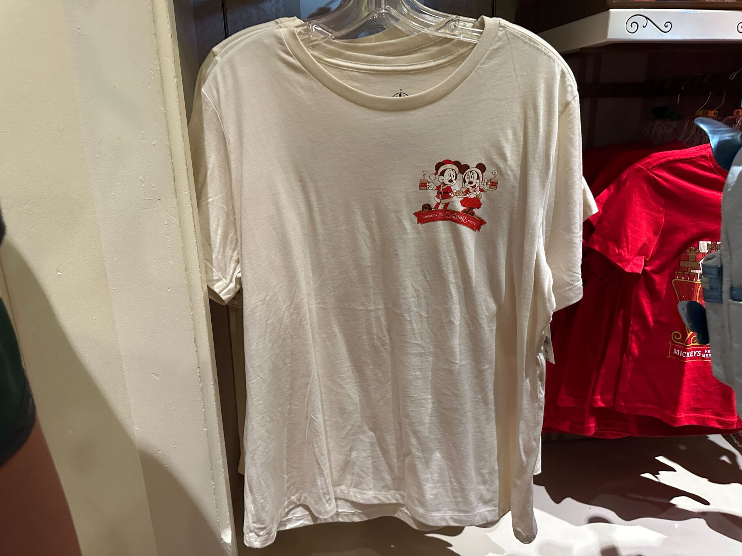 This white shirt features a drapey fit and scoop neck. On the front, Mickey and Minnie share hot cocoa and a plate of cookies above a Mickey’s Very Merry Christmas Party logo banner. The circular Mickey’s Very Merry Christmas Party logo design with Mickey, Minnie, and Cinderella Castle is on the back.