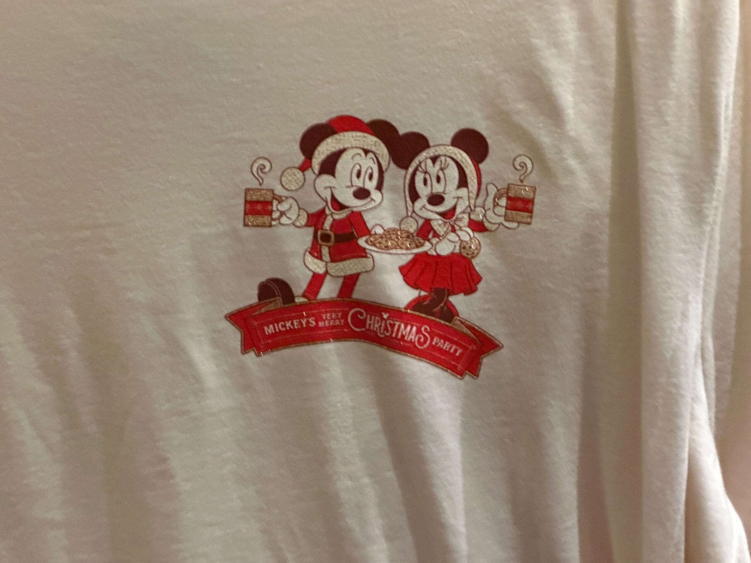 This long-sleeve shirt is white with red text and graphics. It reads Mickey’s Very Merry Christmas Party with a heart in the place of the dot on the I.
