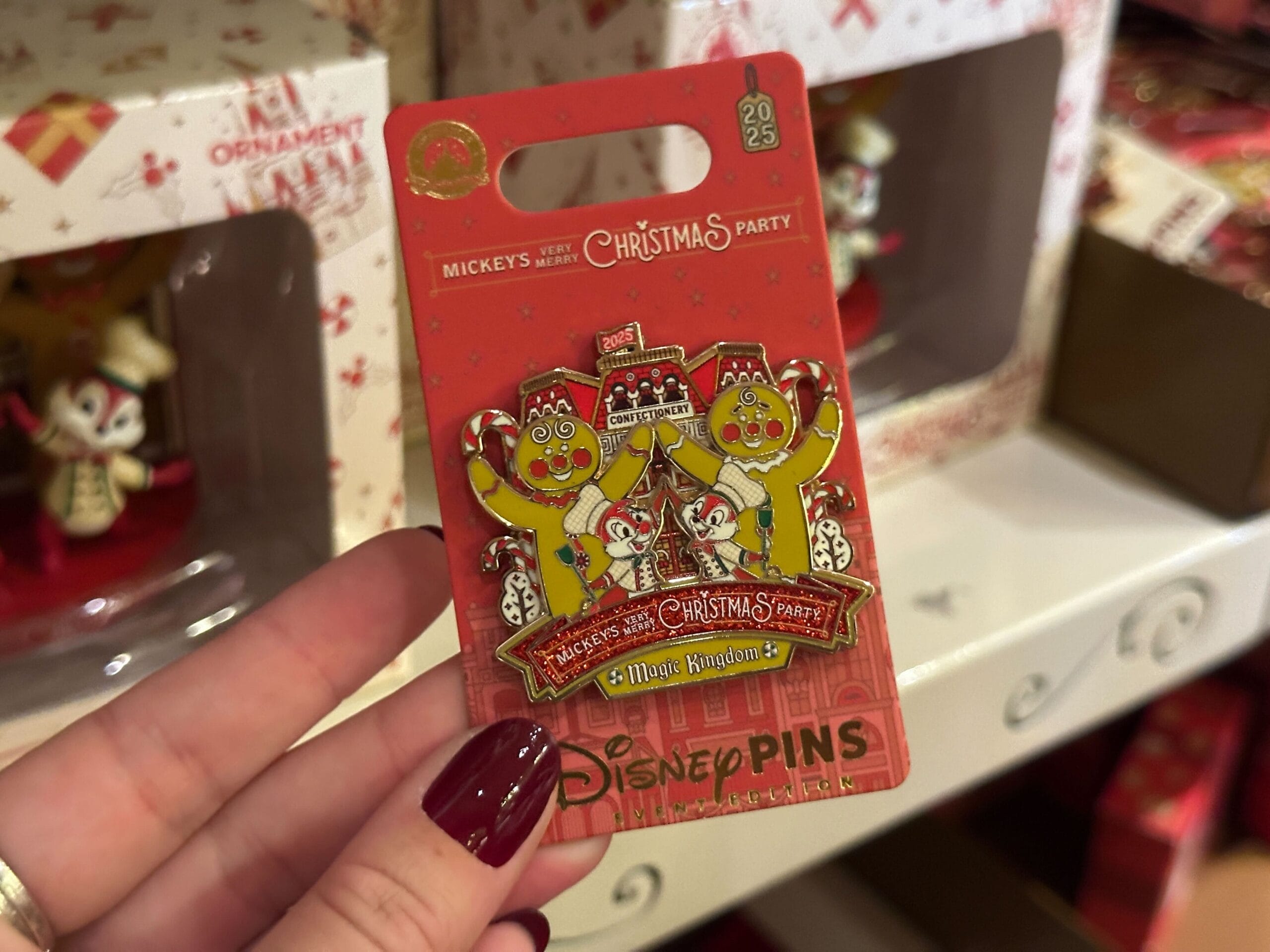 The Chip and Dale chef design is the centerpiece of this pin, which features gingerbread men, candy canes, and the Main Street Confectionery with a 2025 flag. The Mickey’s Very Merry Christmas Party logo banner is along the bottom in red glitter.