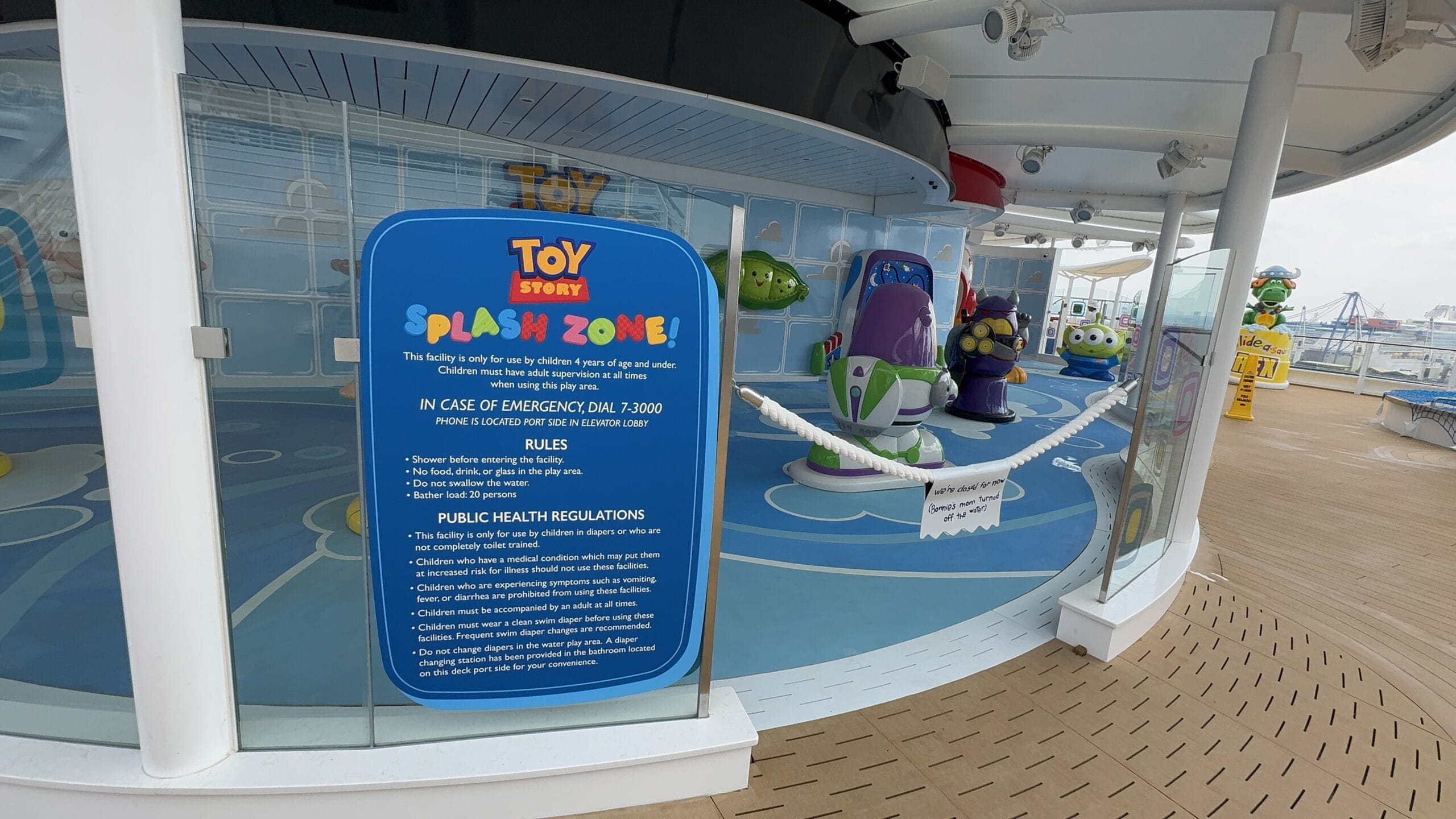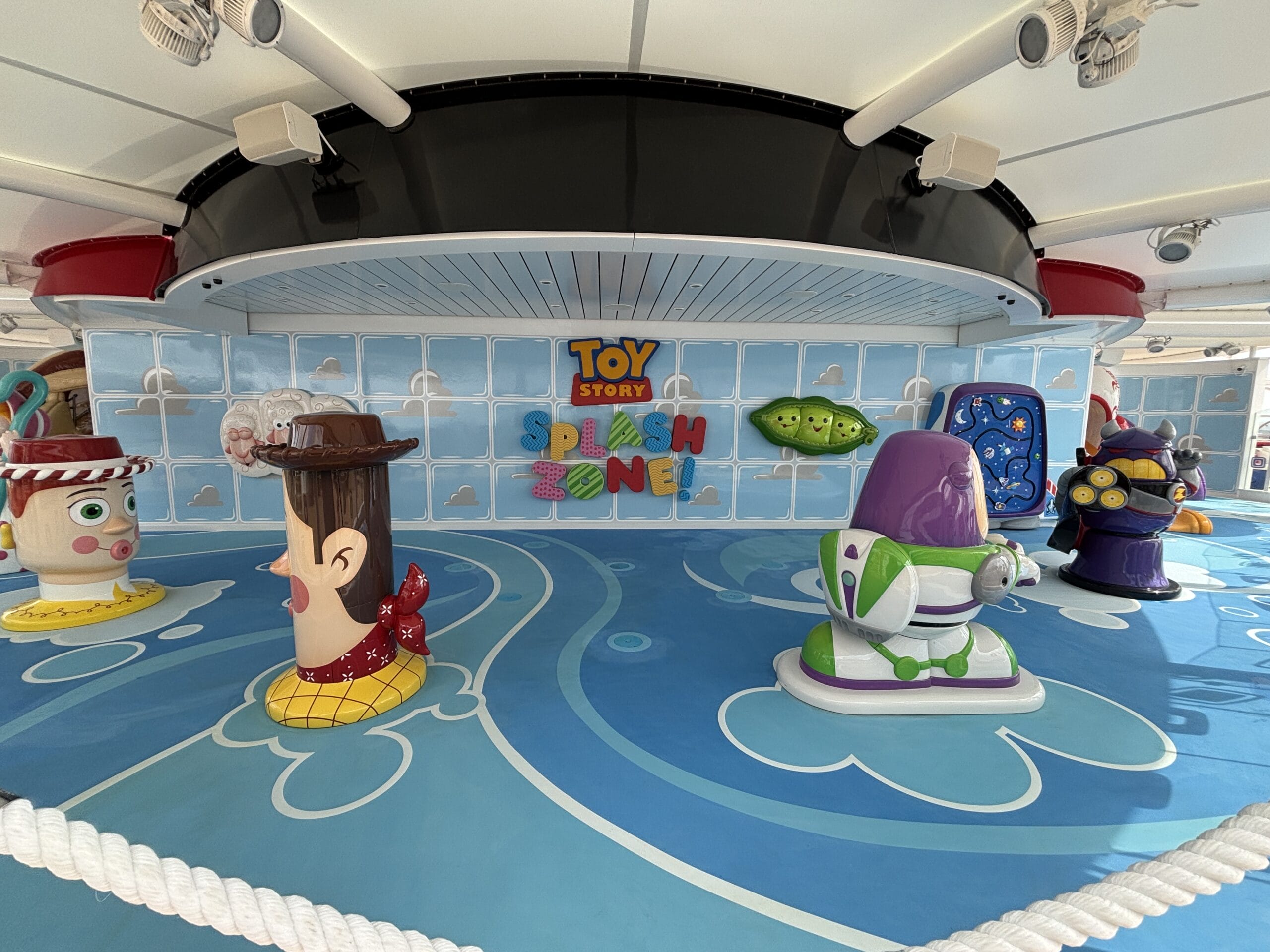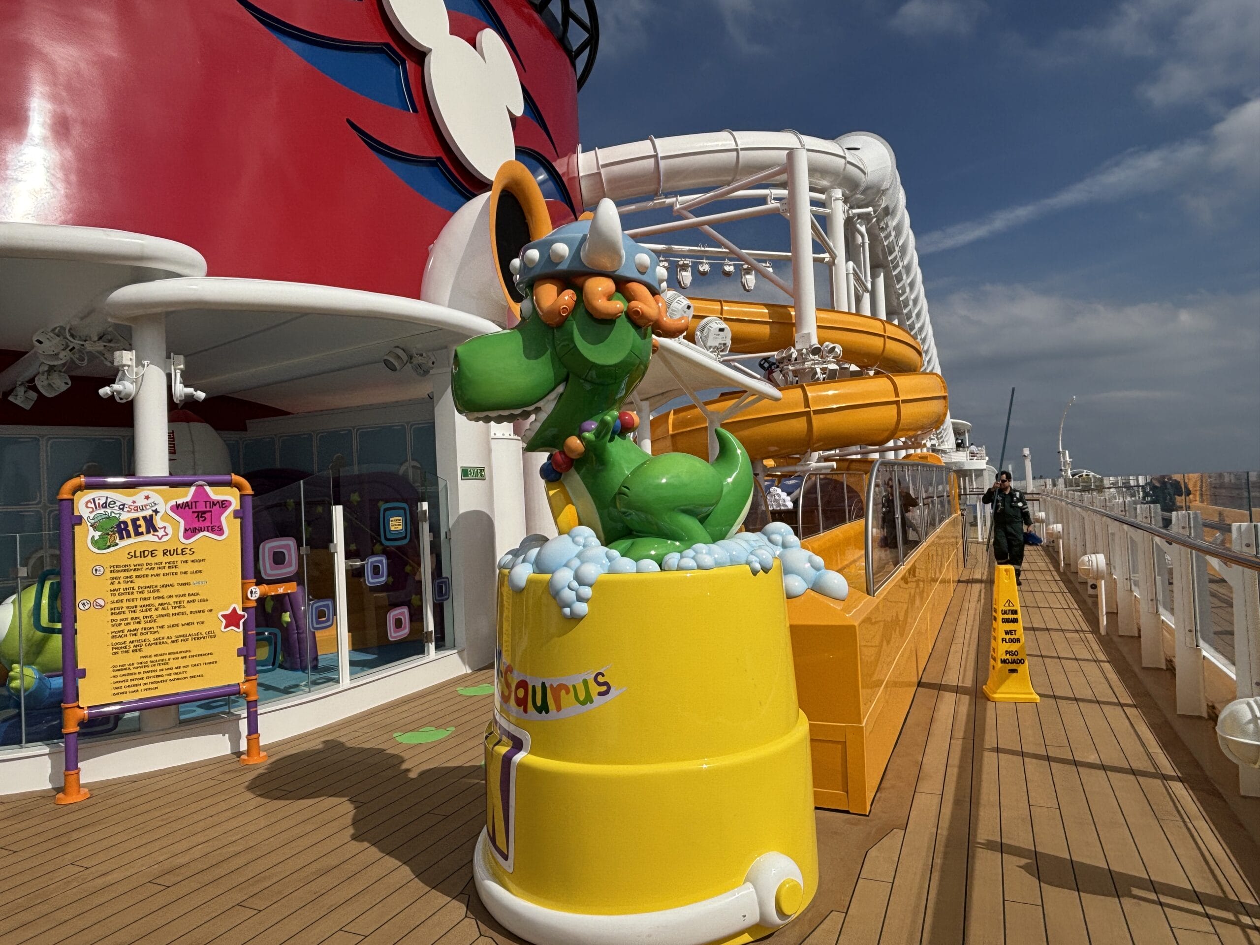 The Toy Story Splash Zone and Slide-a-saurus Rex are on Deck 12, Forward of the Disney Destiny.