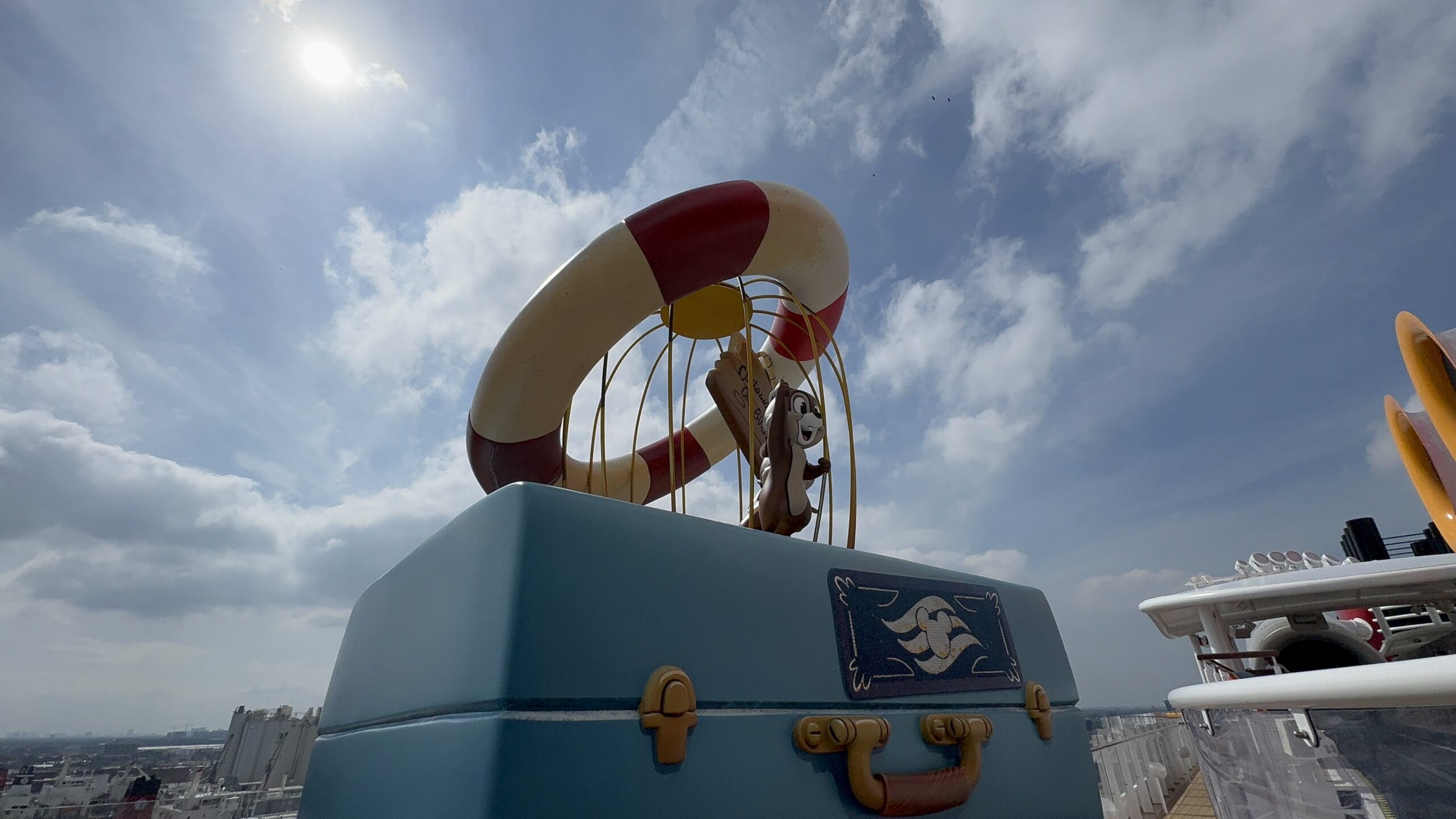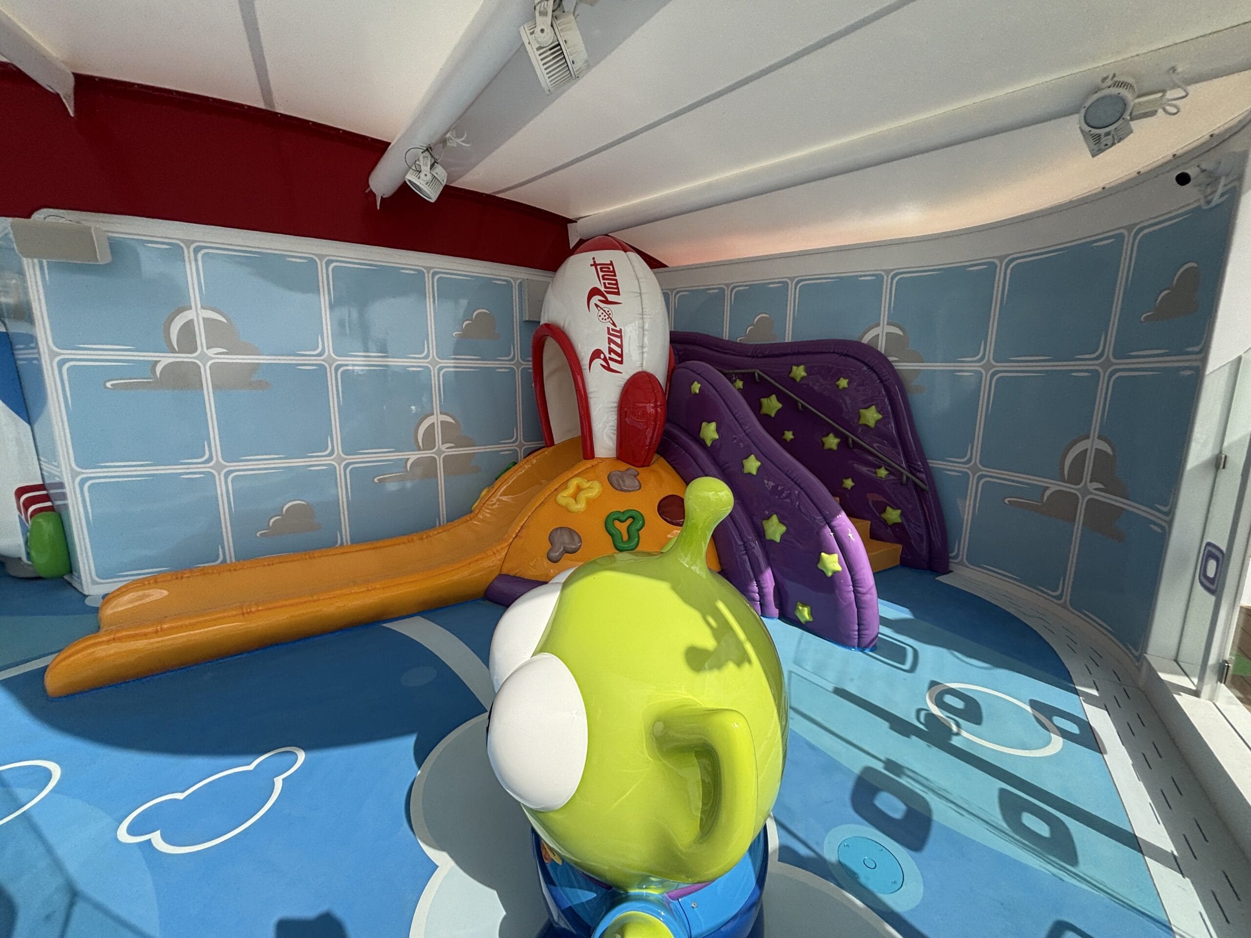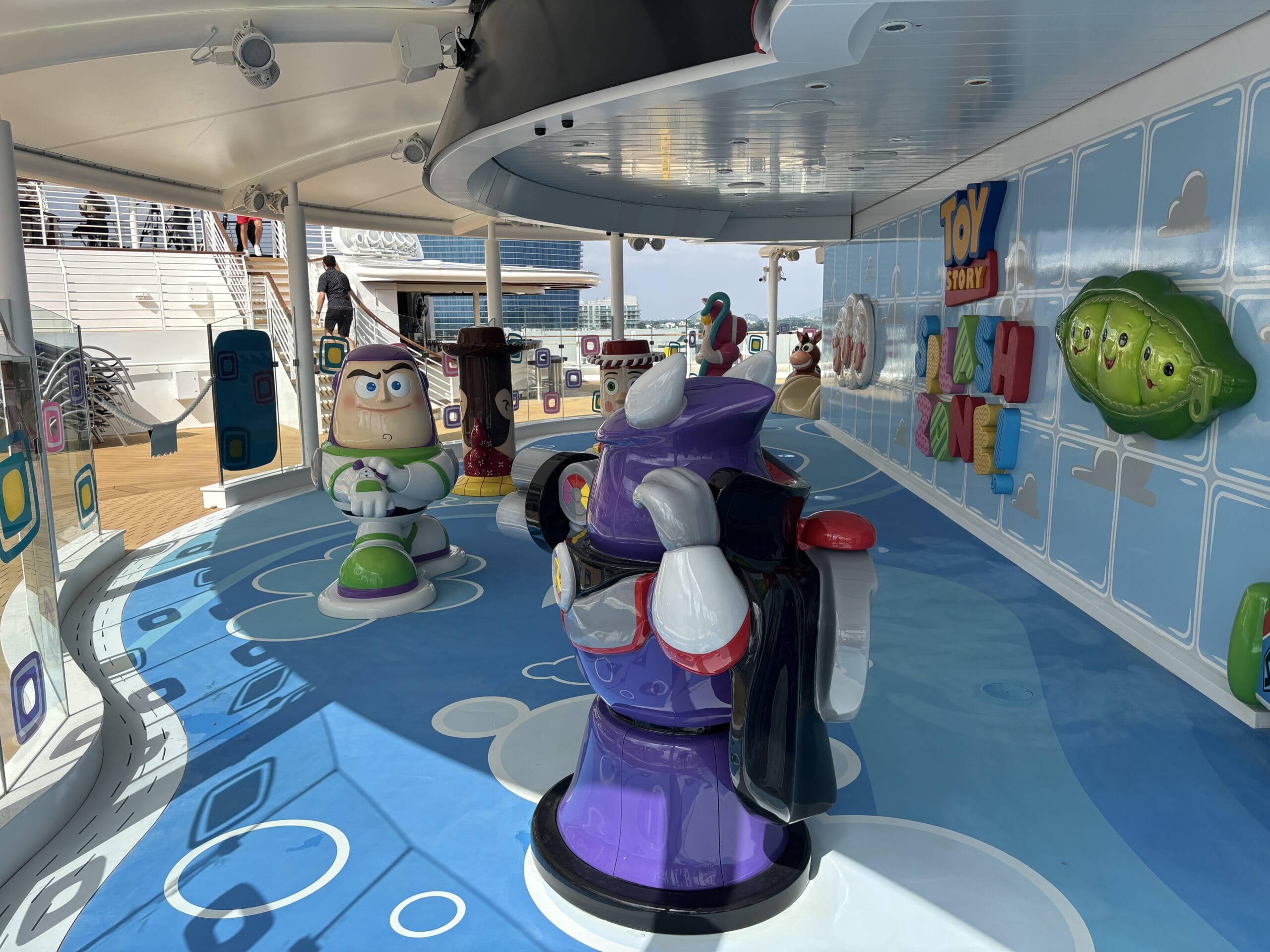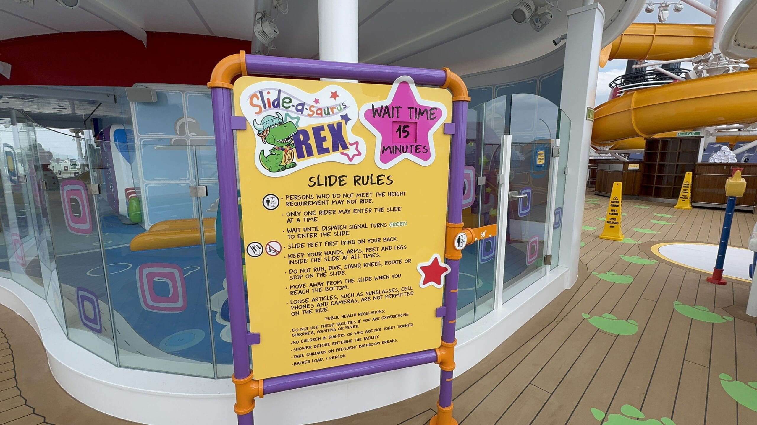 The Toy Story Splash Zone and Slide-a-saurus Rex are on Deck 12, Forward of the Disney Destiny.