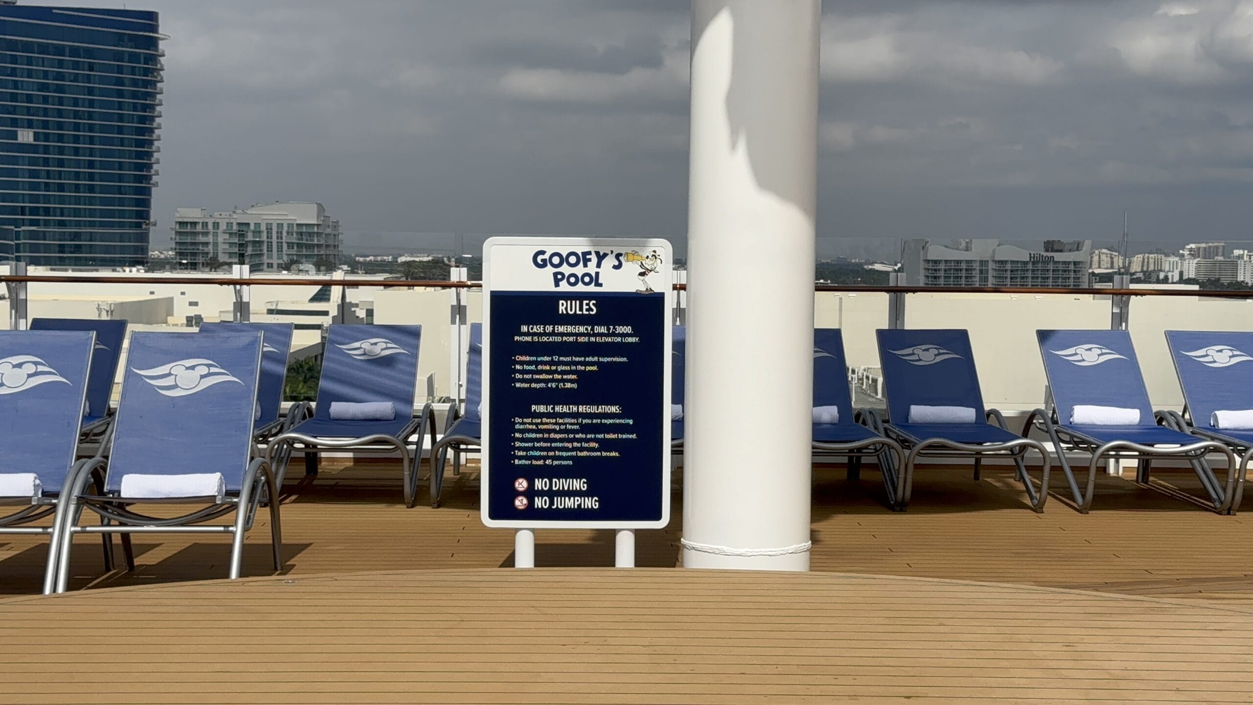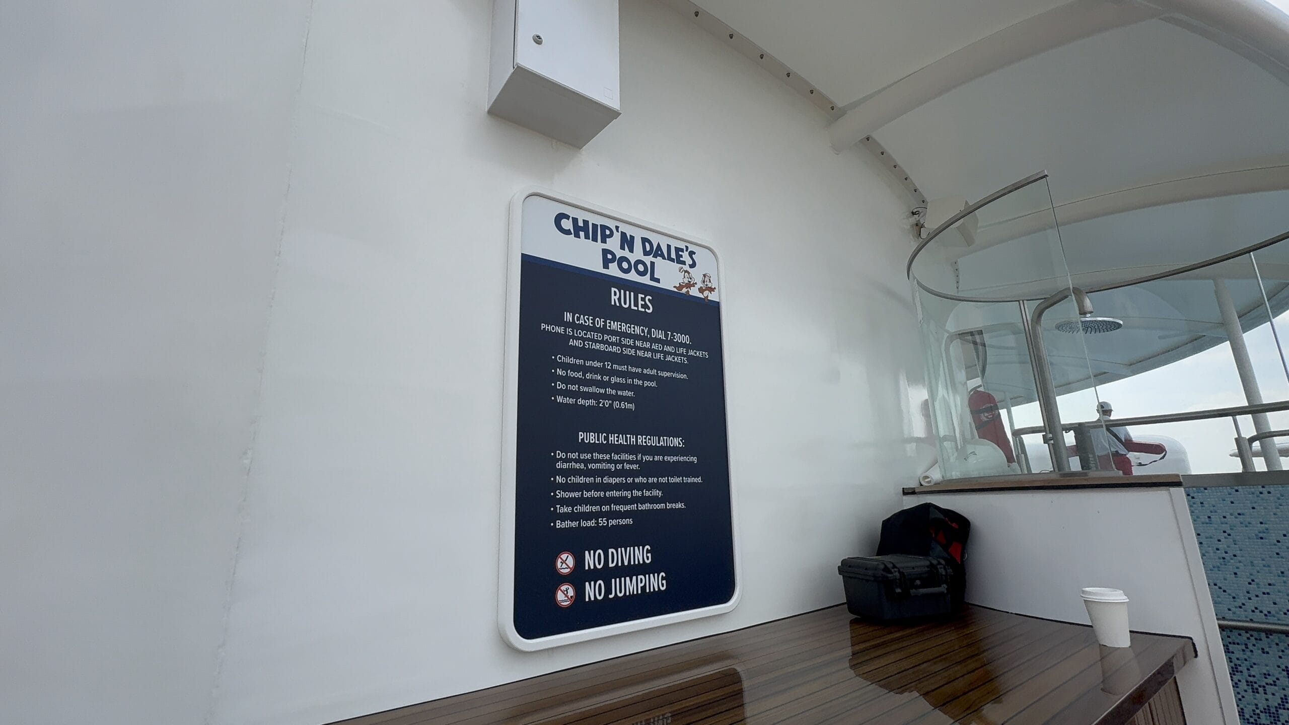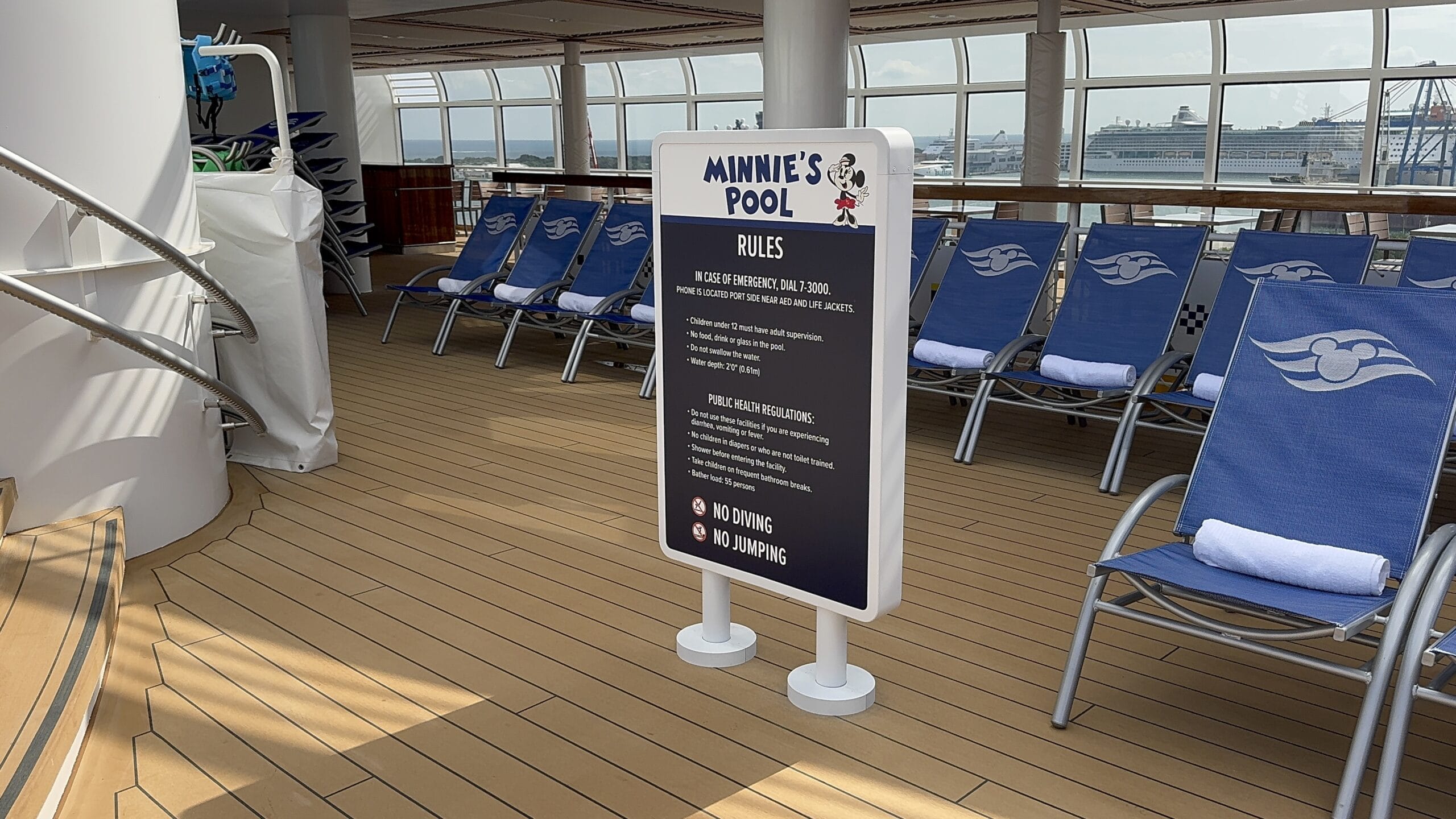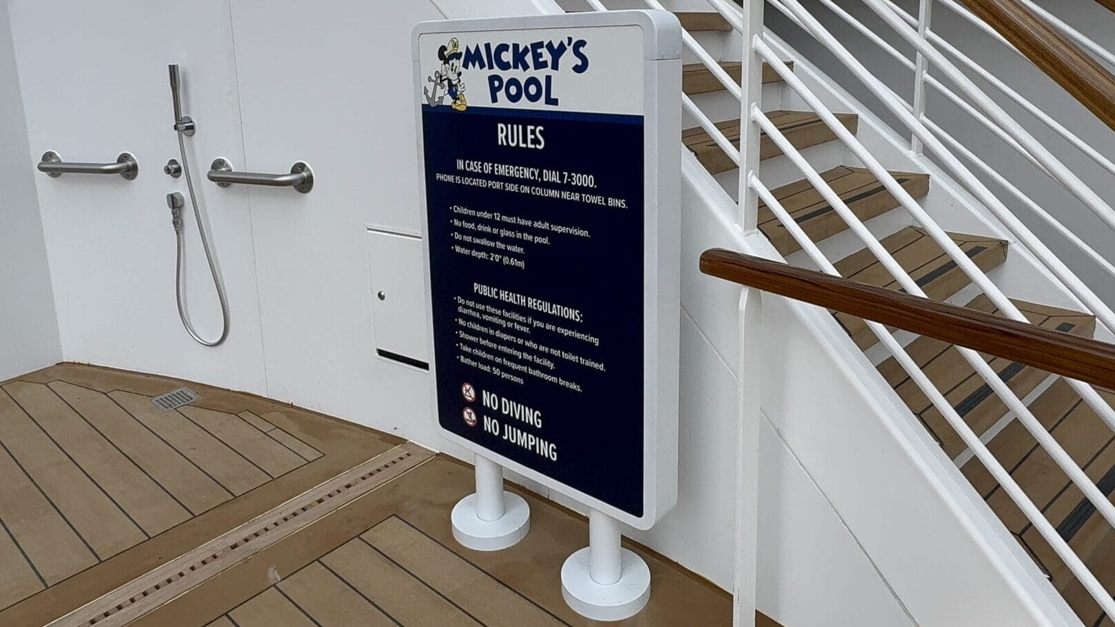 Mickey’s Pool is located on Deck 11, Midship. The pool is built into the stage. It is located in the center of the photo above, but was covered when we photographed it. Rules are posted nearby, as well as an outdoor area to rinse off.