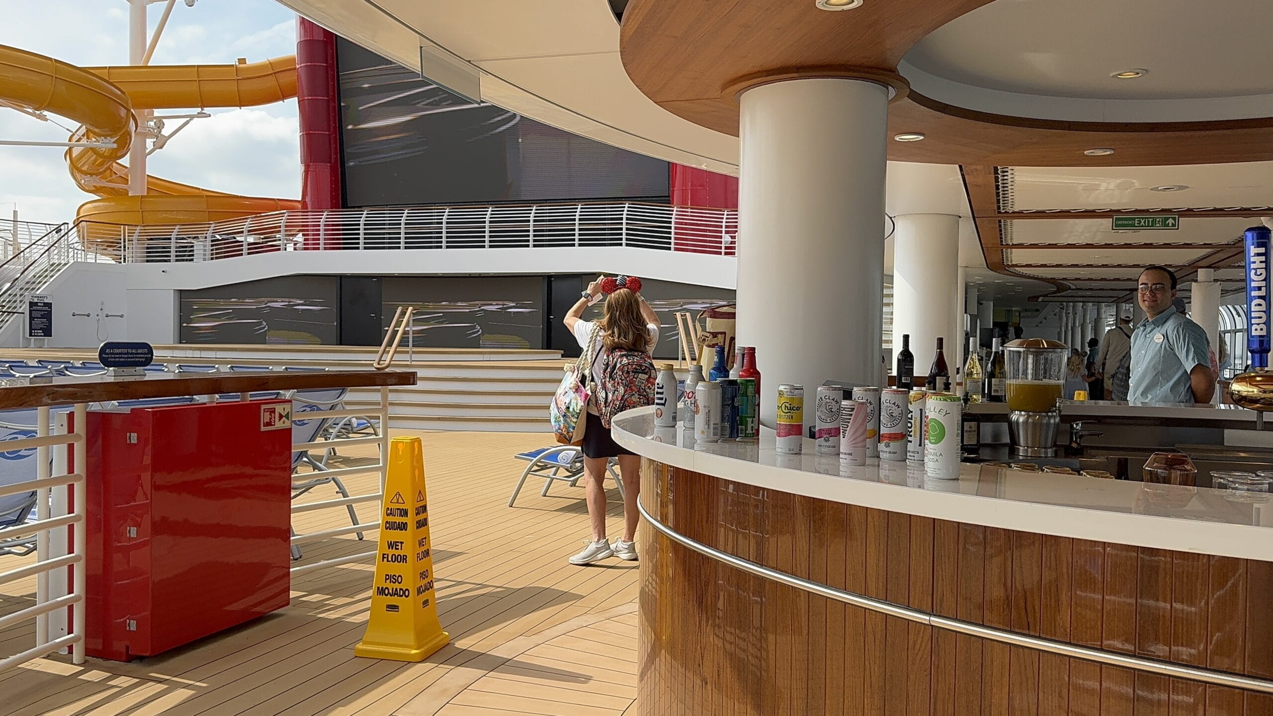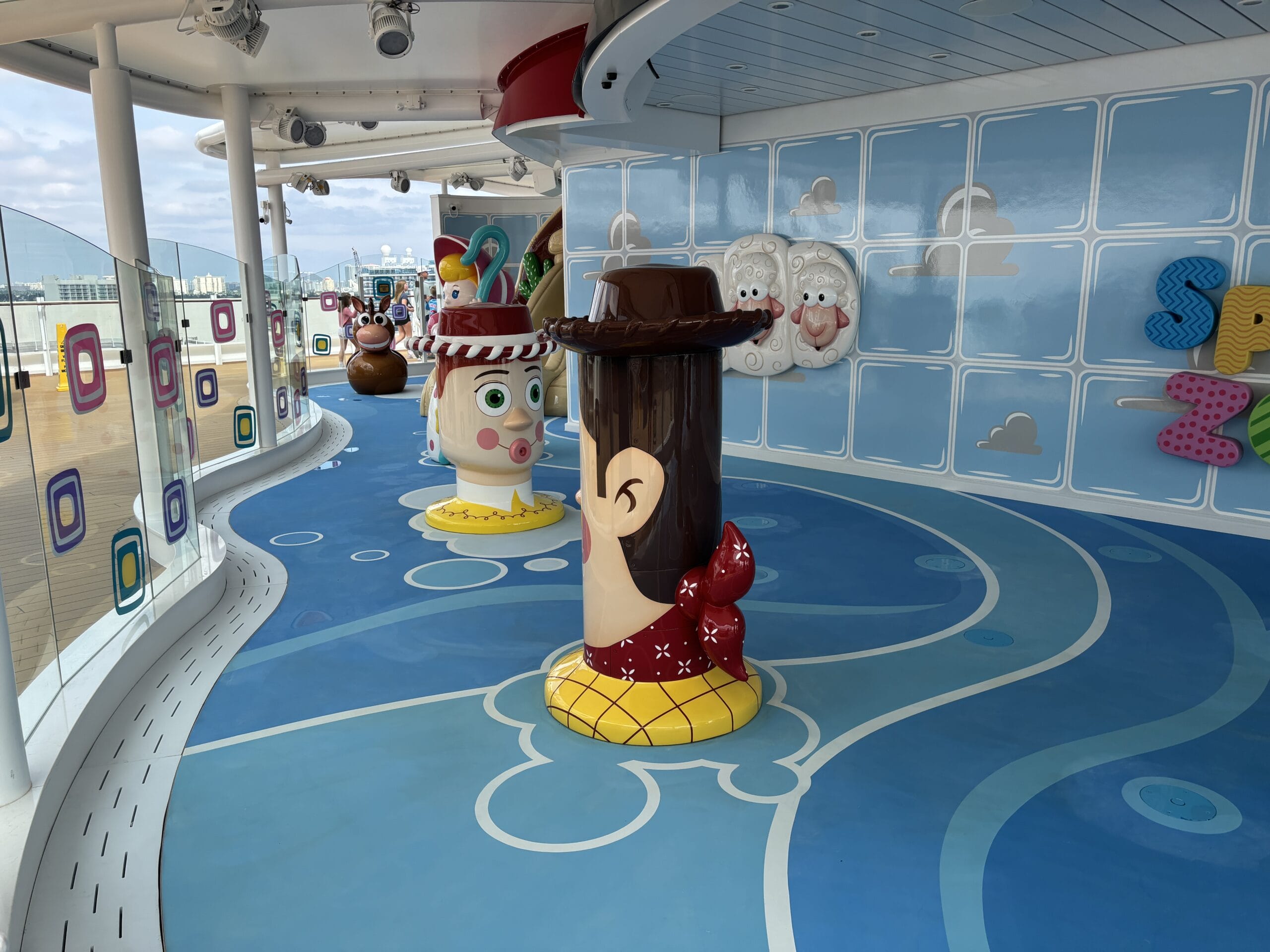 Instead of a handful of large pools like other Disney Cruise Line ships, the Disney Destiny has several smaller pools scattered across the upper decks, plus the Toy Story Splash Zone and Slide-a-saurus Rex.