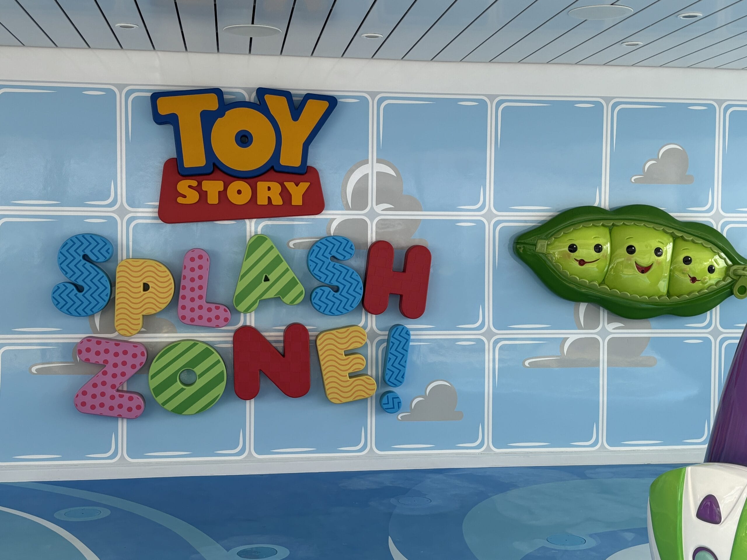 On one end of the splash zone is a Pizza Planet-inspired slide, next to an Alien “rubber duck.”