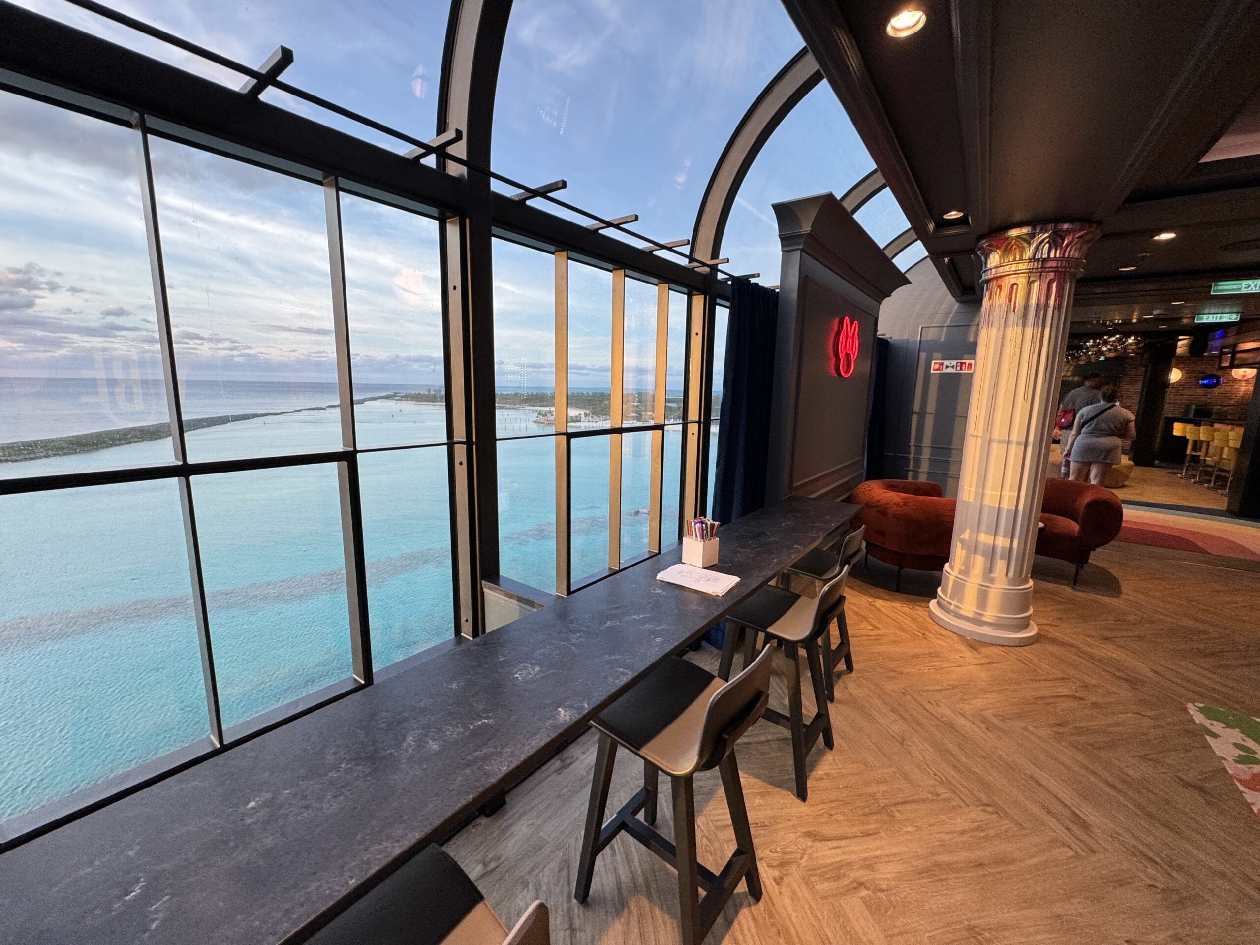 The floor to ceiling windows offer views of the ocean or islands where the ship is docked.