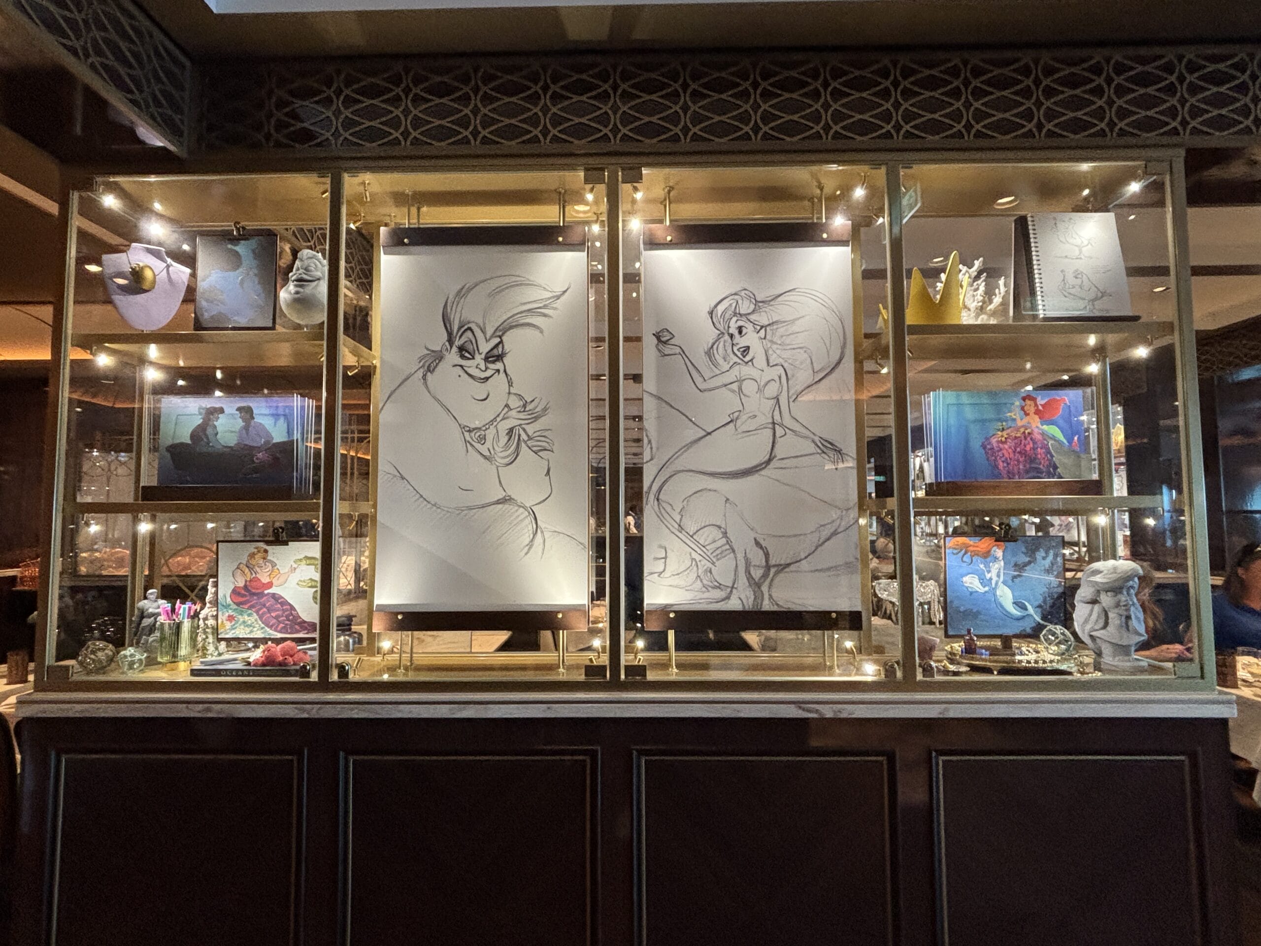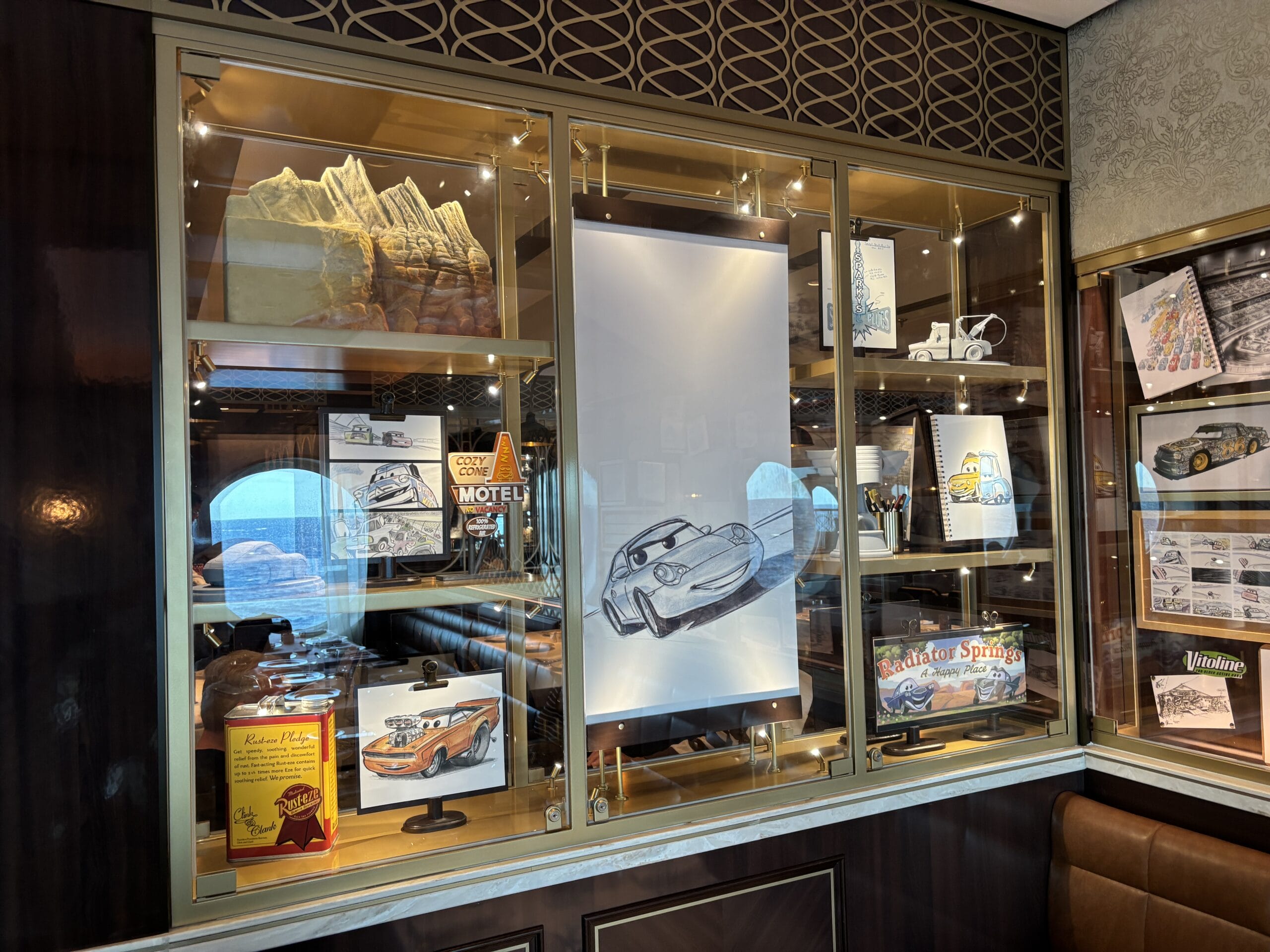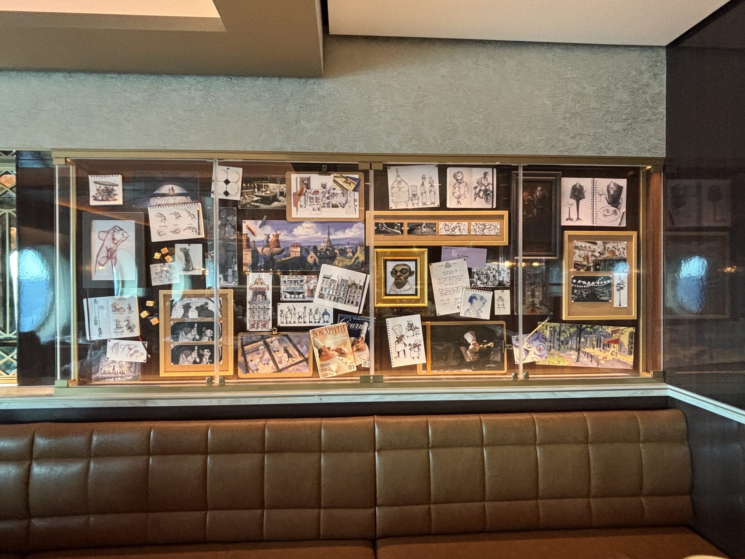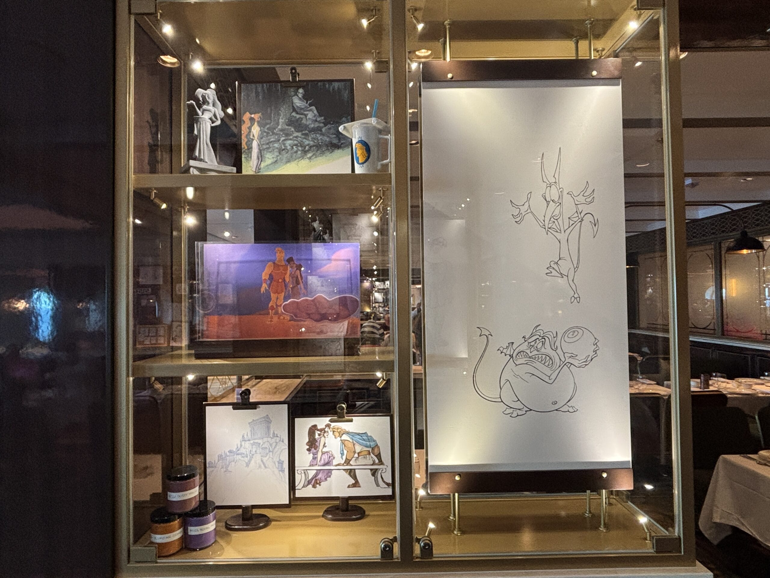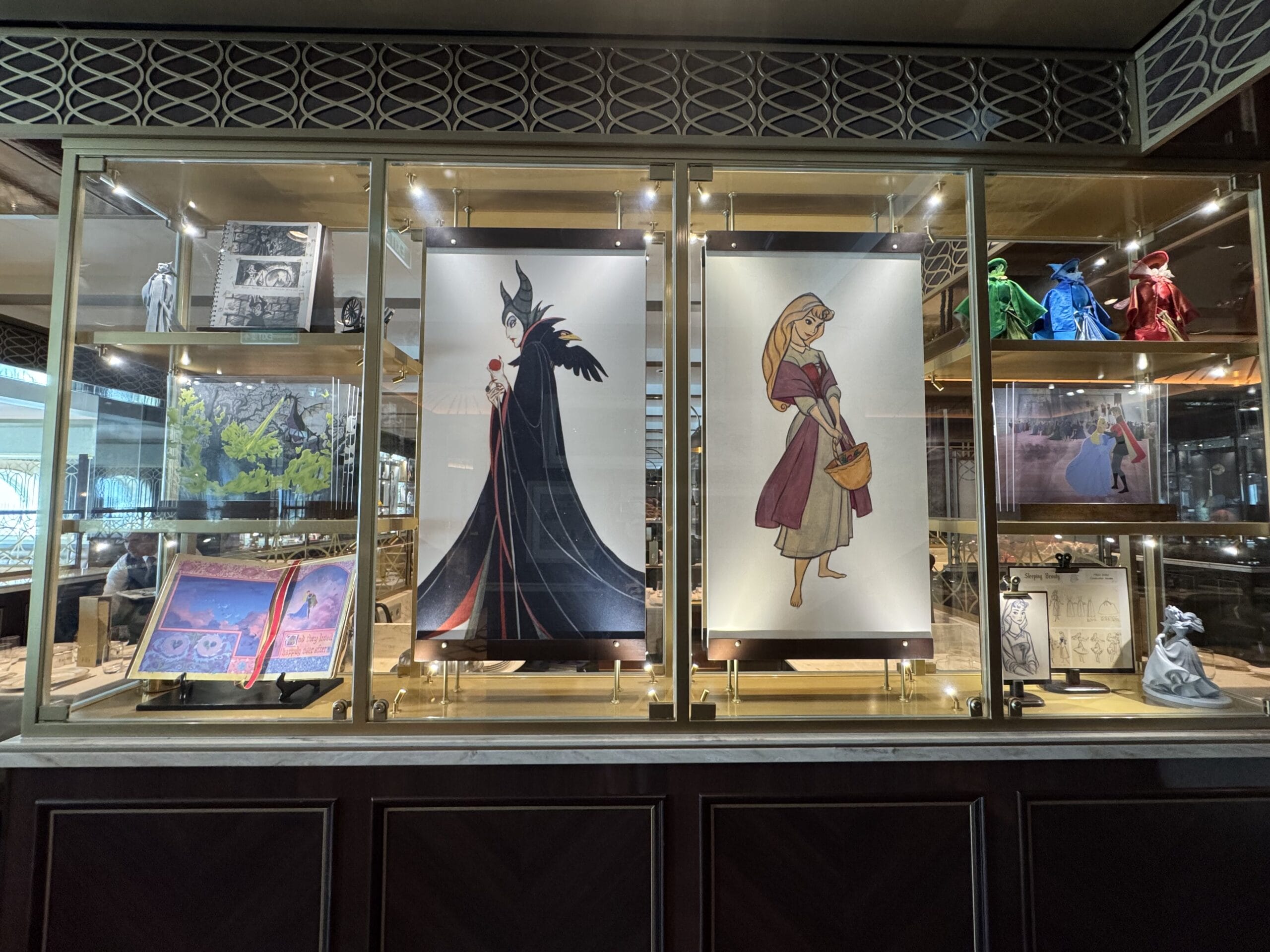 The Walt Disney dining room also has display cases throughout the space with sketches, models, and memorabilia for animated films.