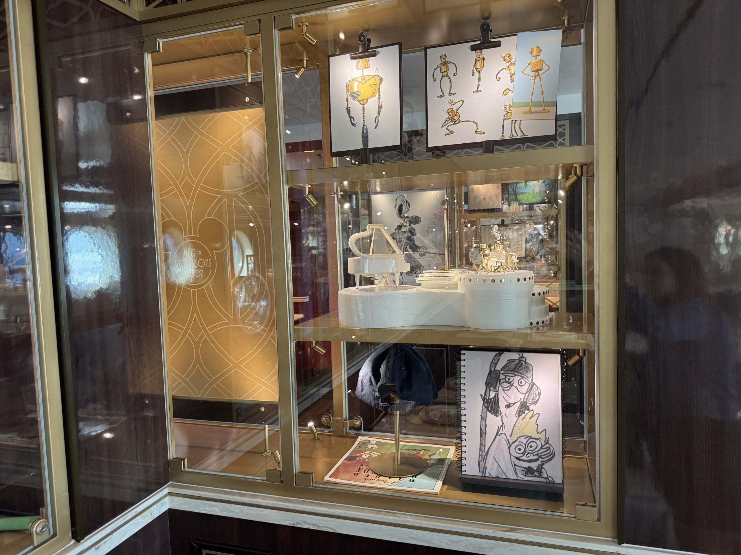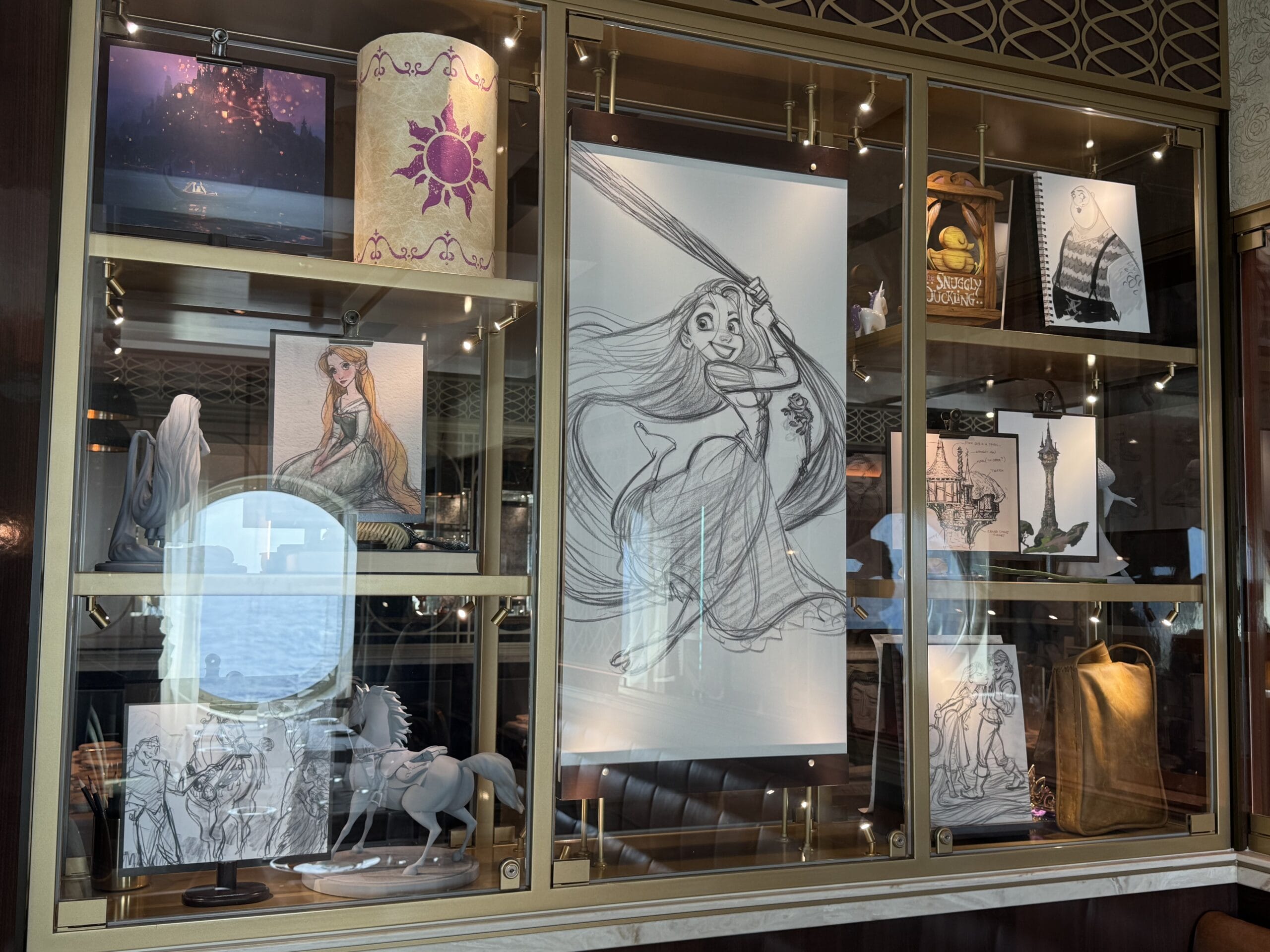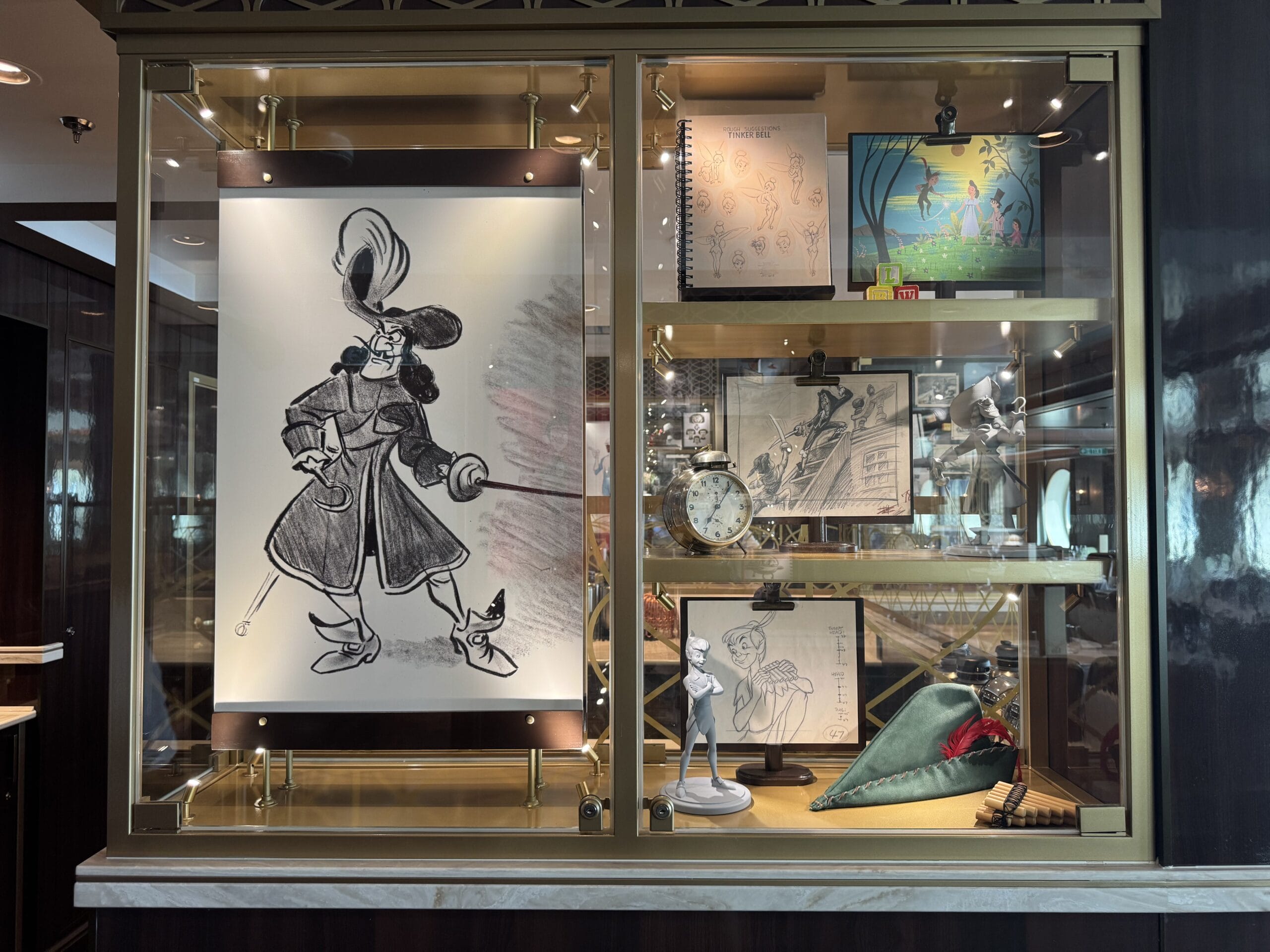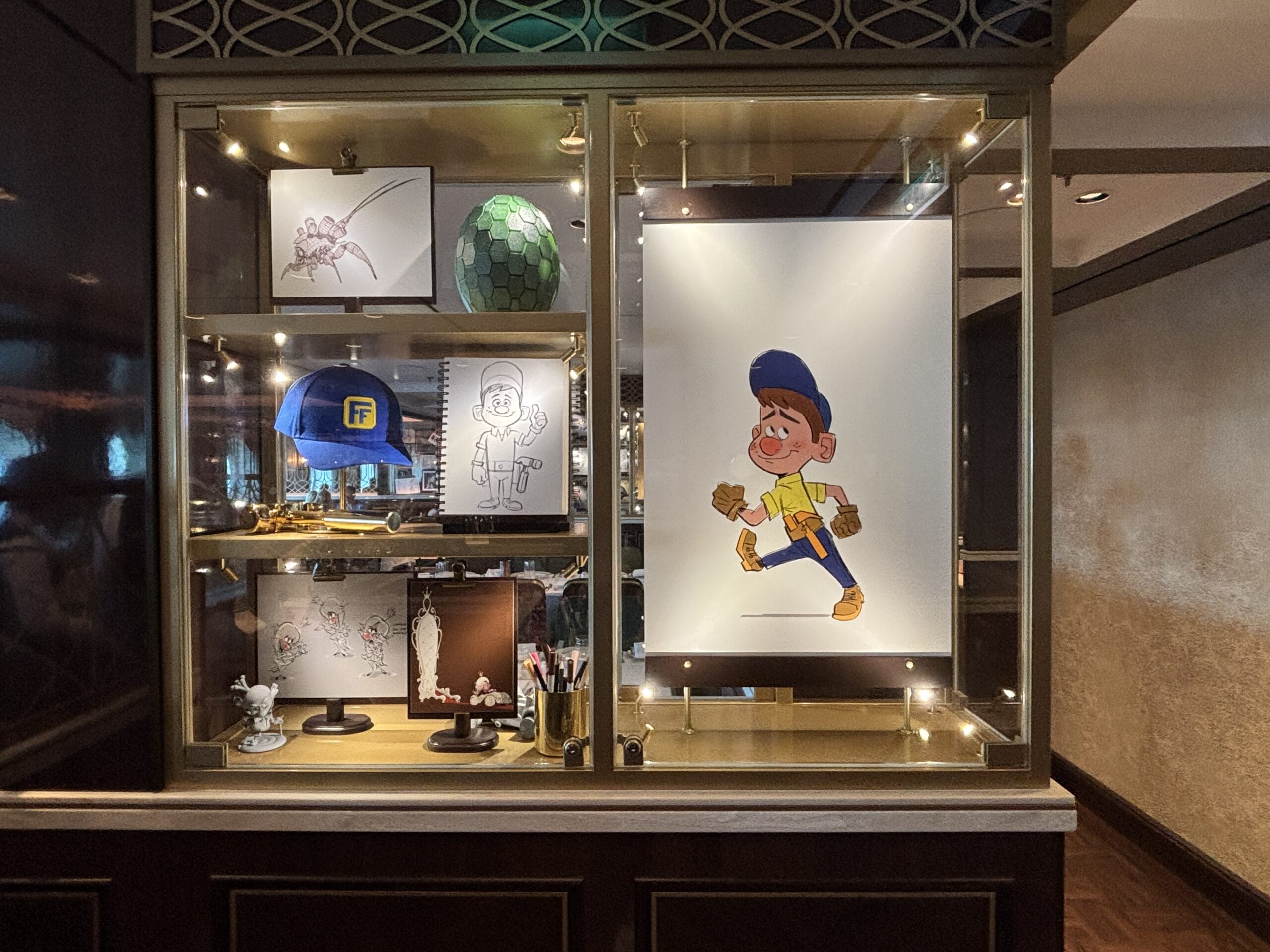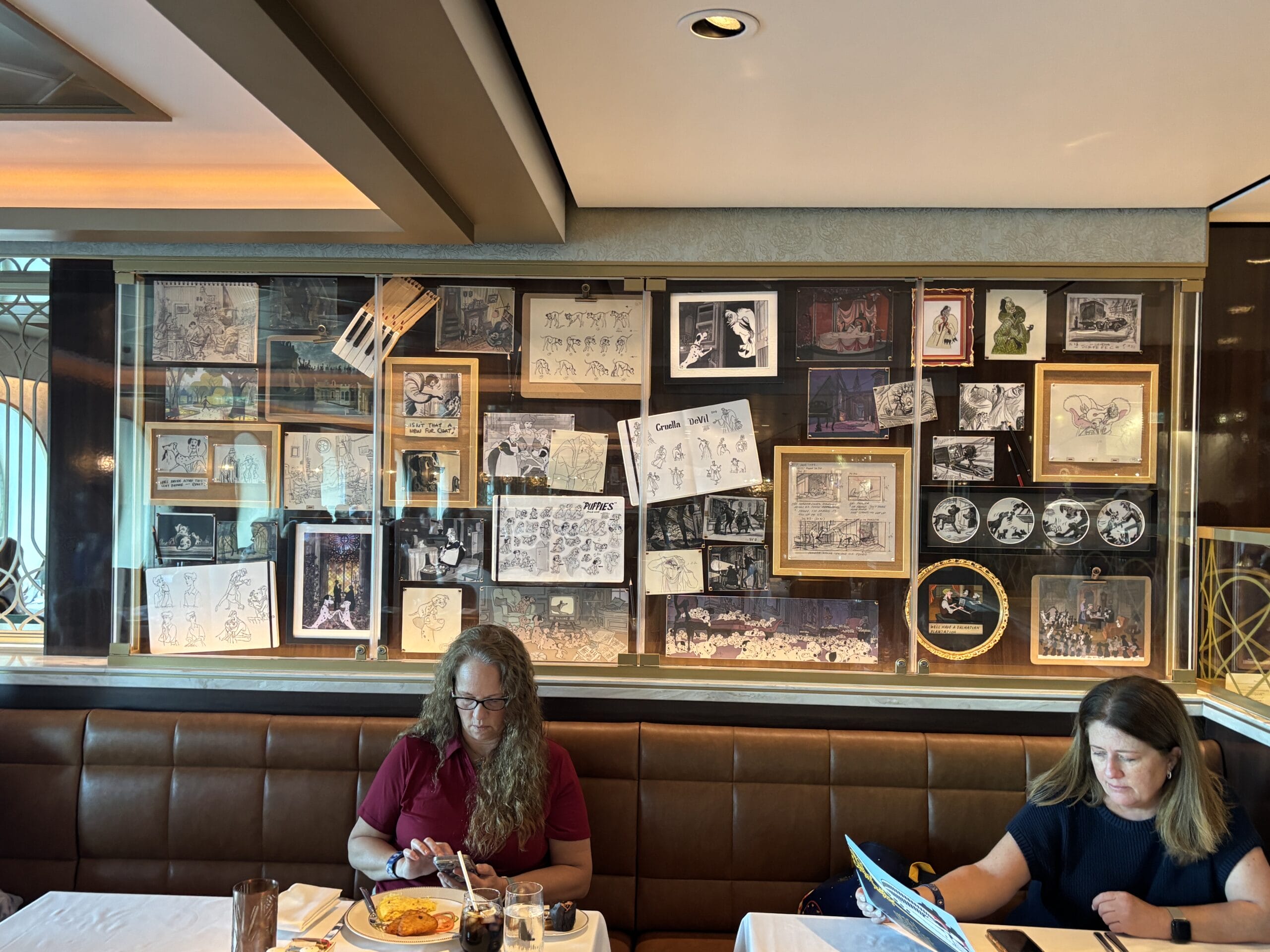 The Walt Disney dining room also has display cases throughout the space with sketches, models, and memorabilia for animated films.