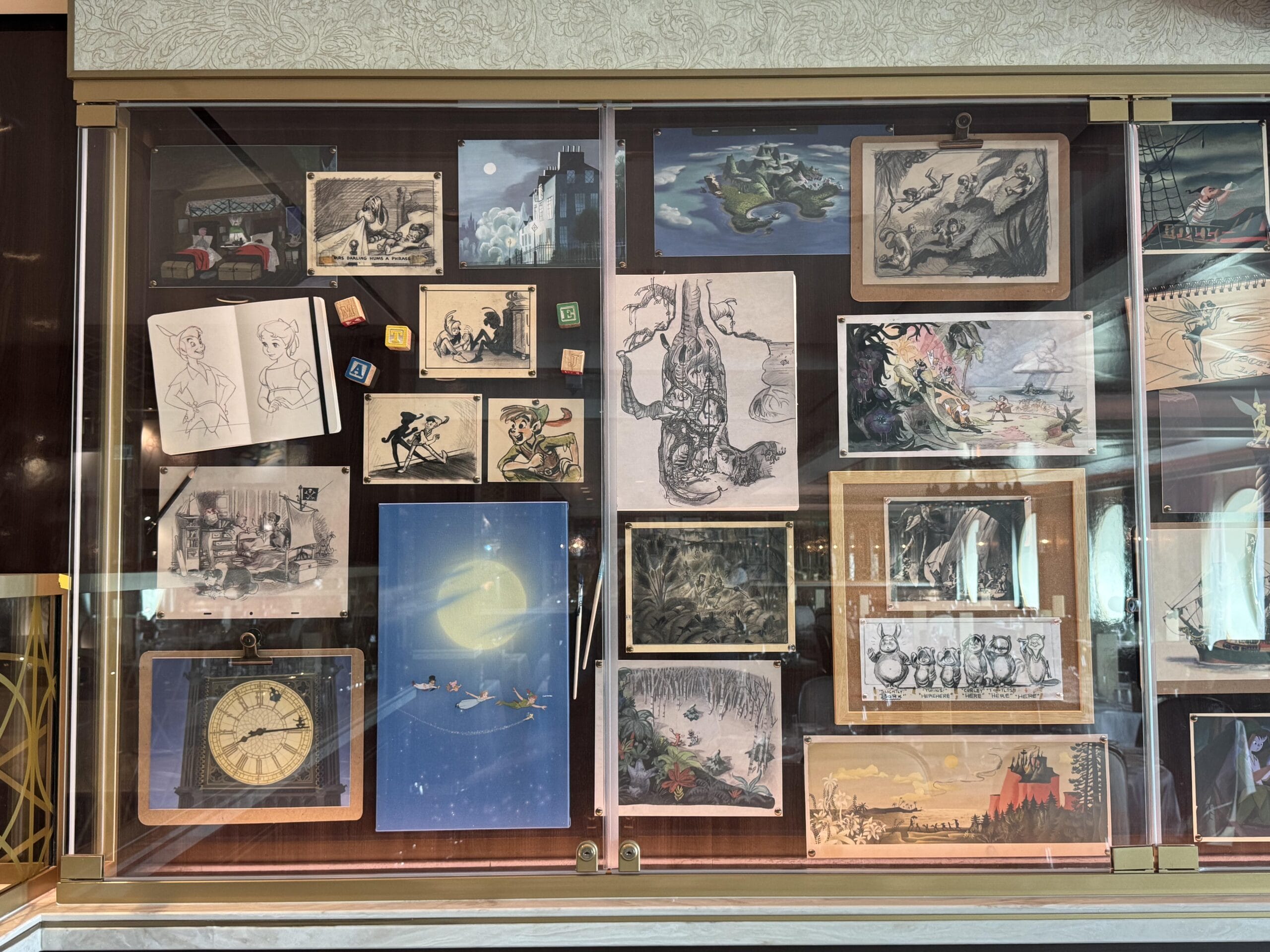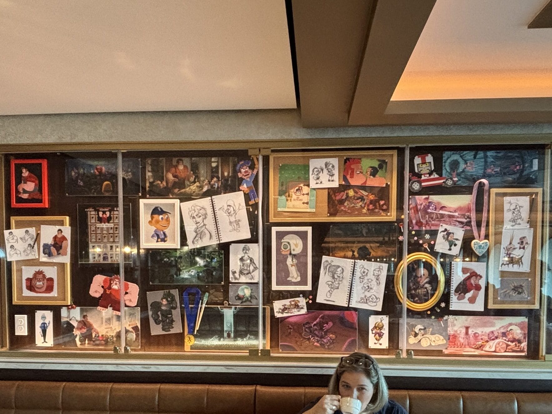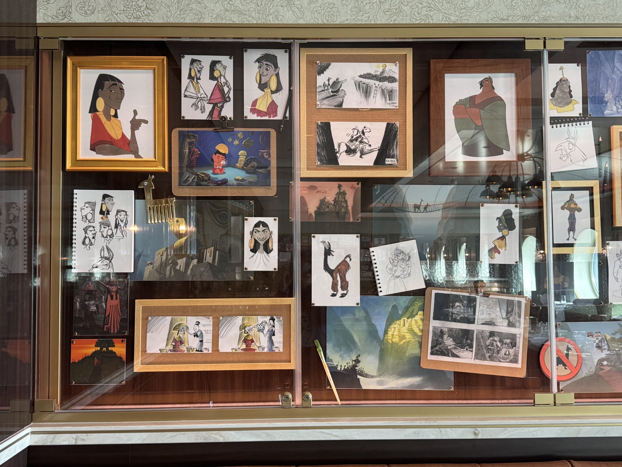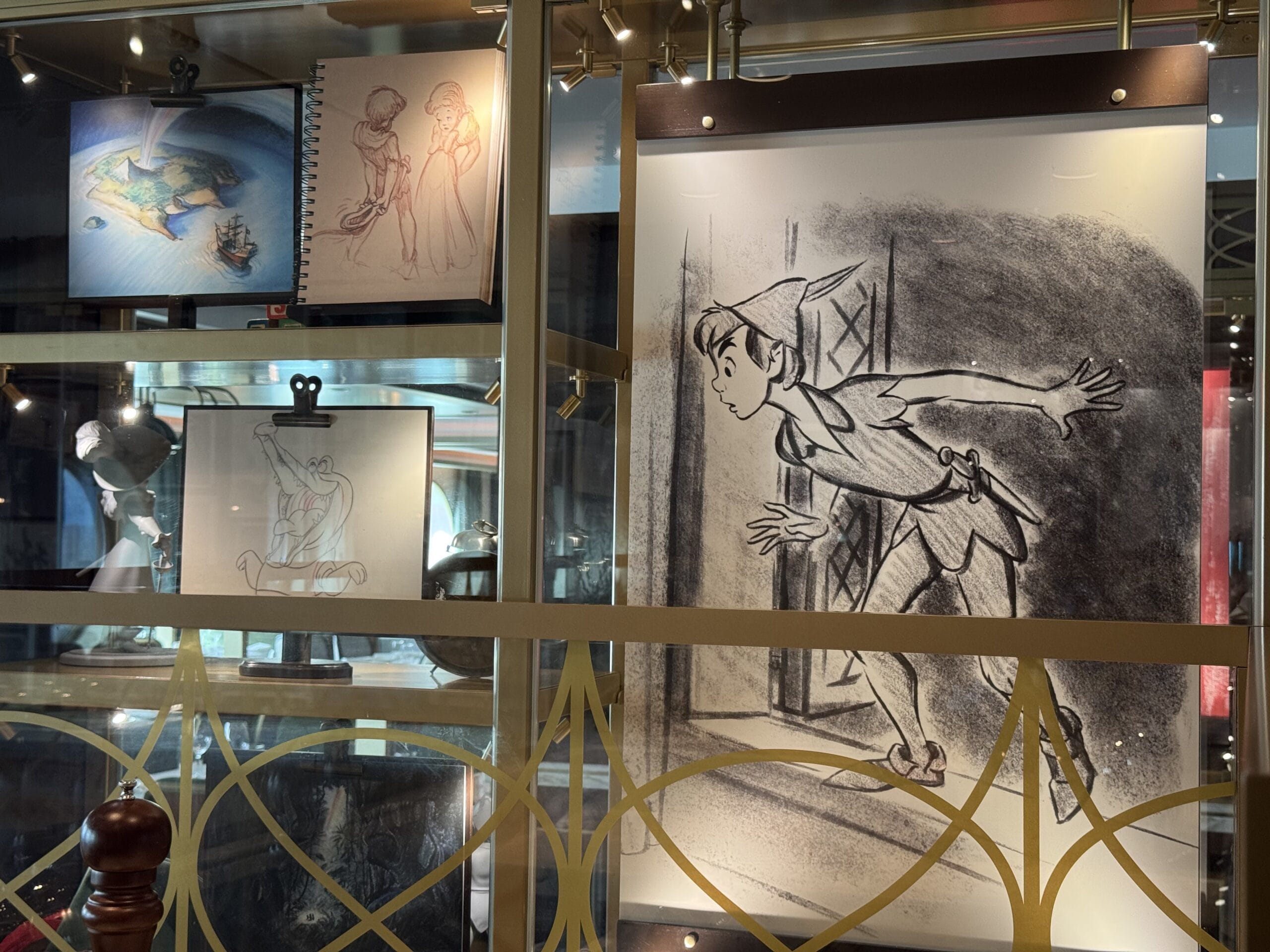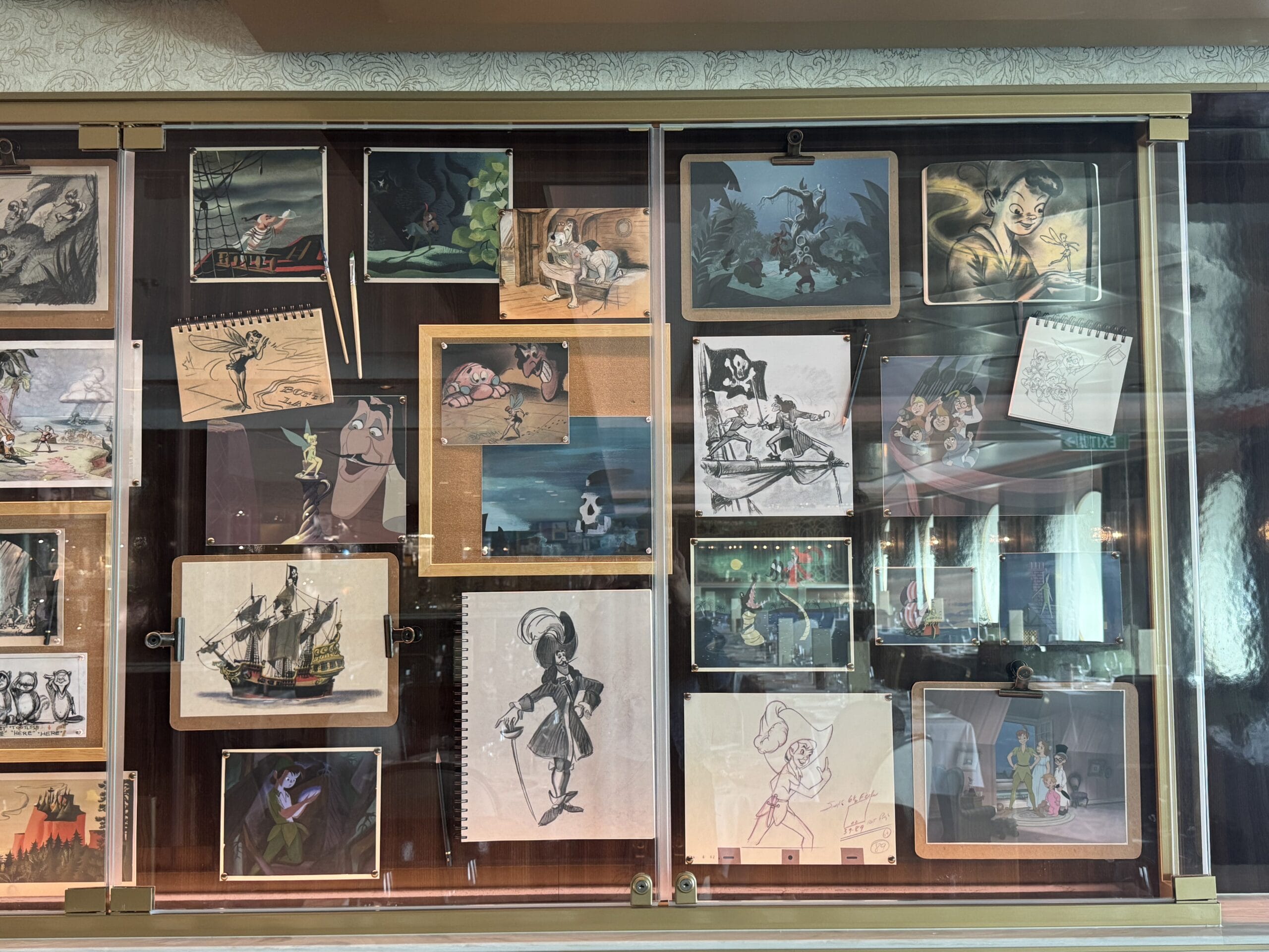 The Walt Disney dining room also has display cases throughout the space with sketches, models, and memorabilia for animated films.