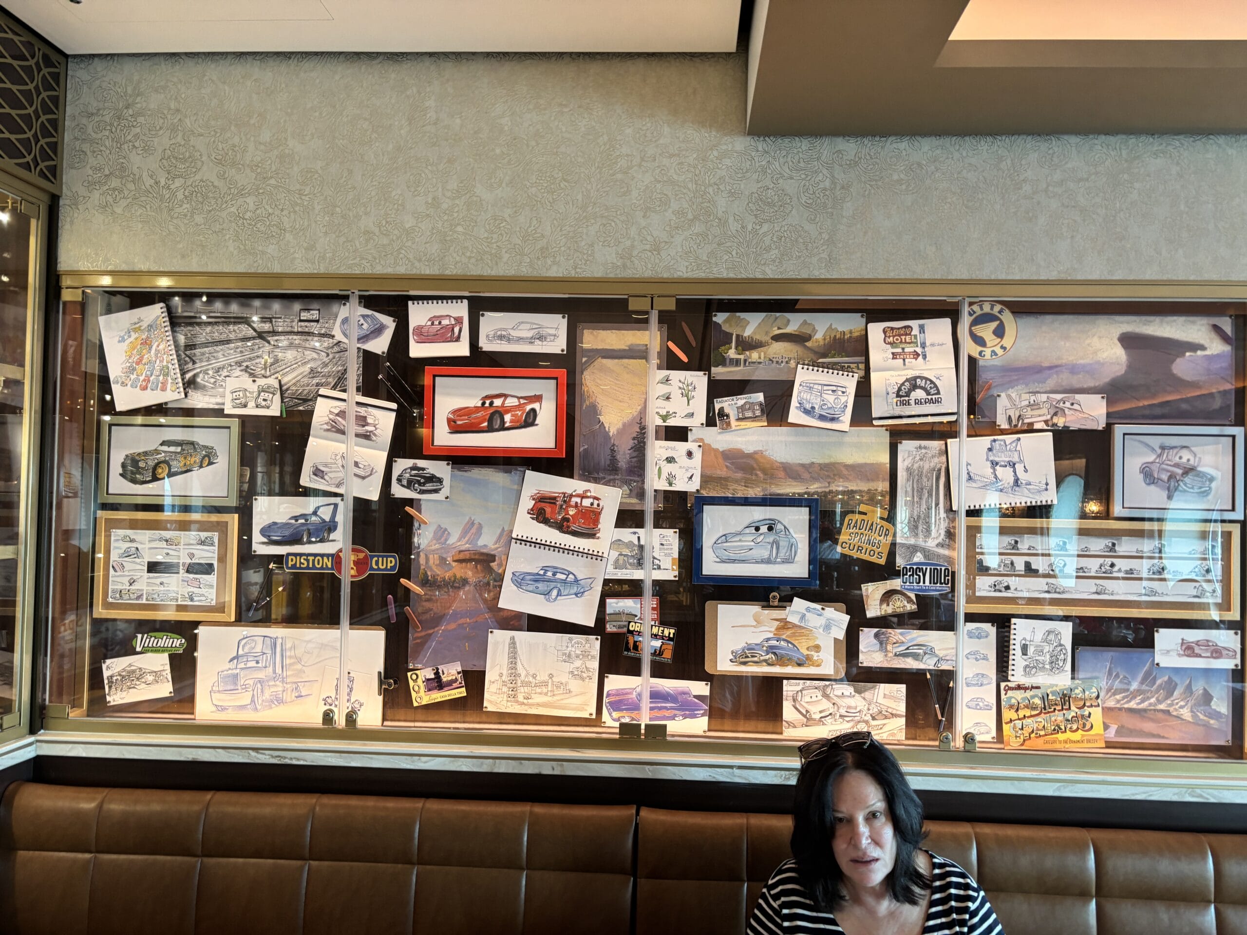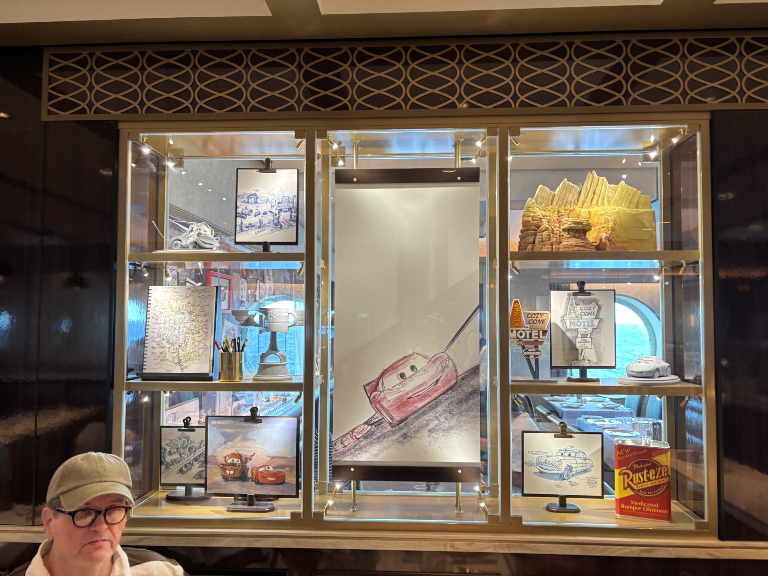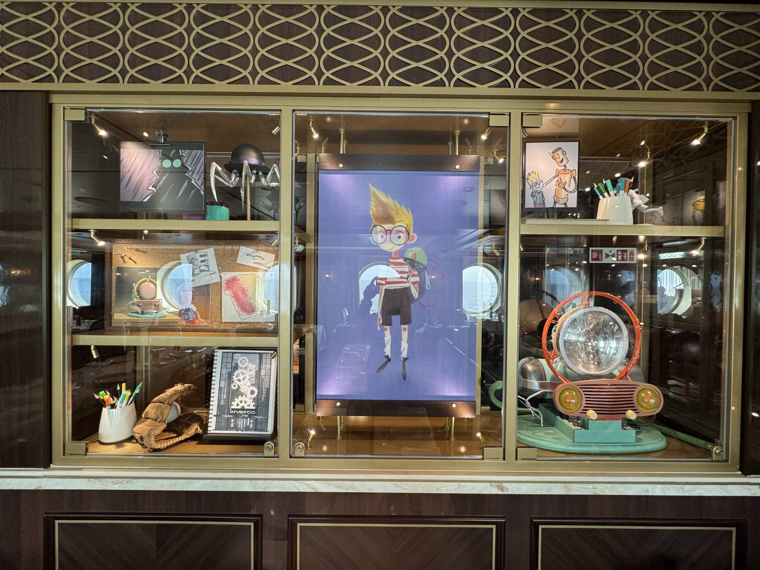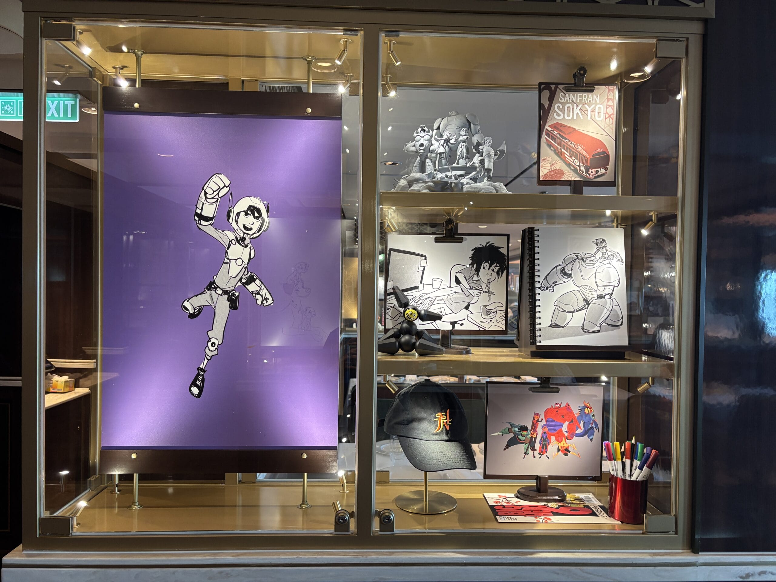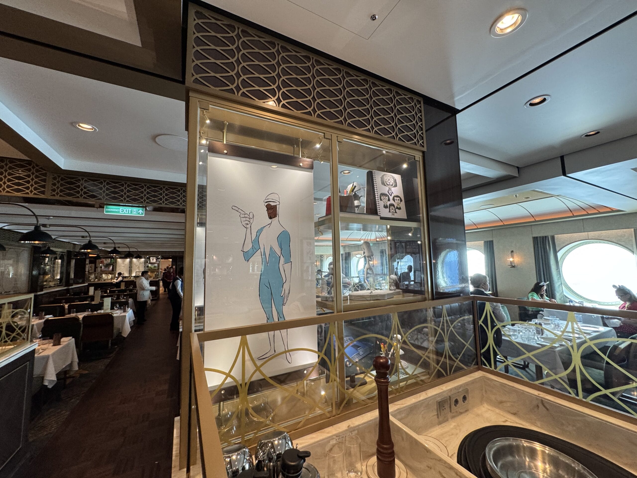 The Walt Disney dining room also has display cases throughout the space with sketches, models, and memorabilia for animated films.