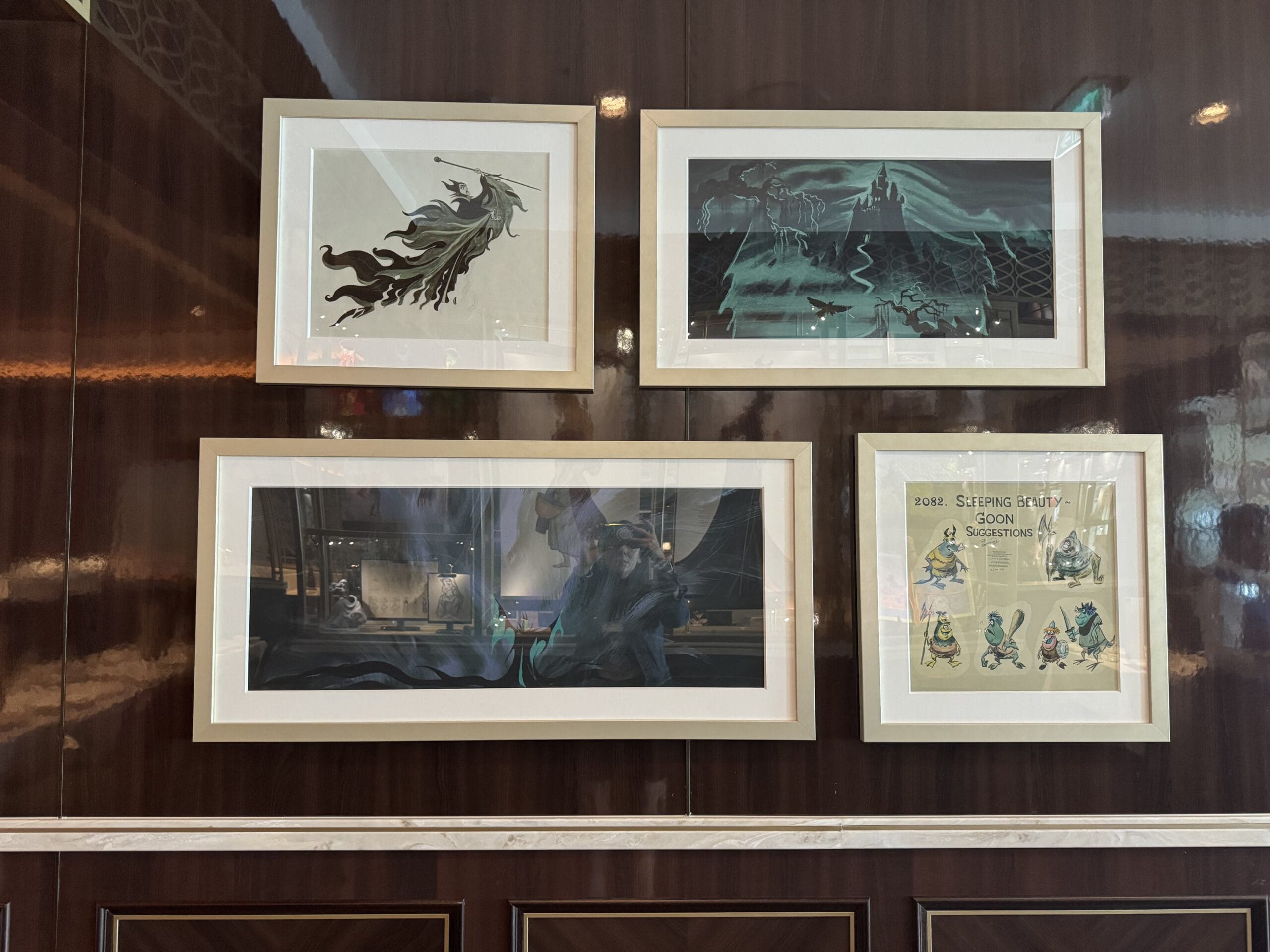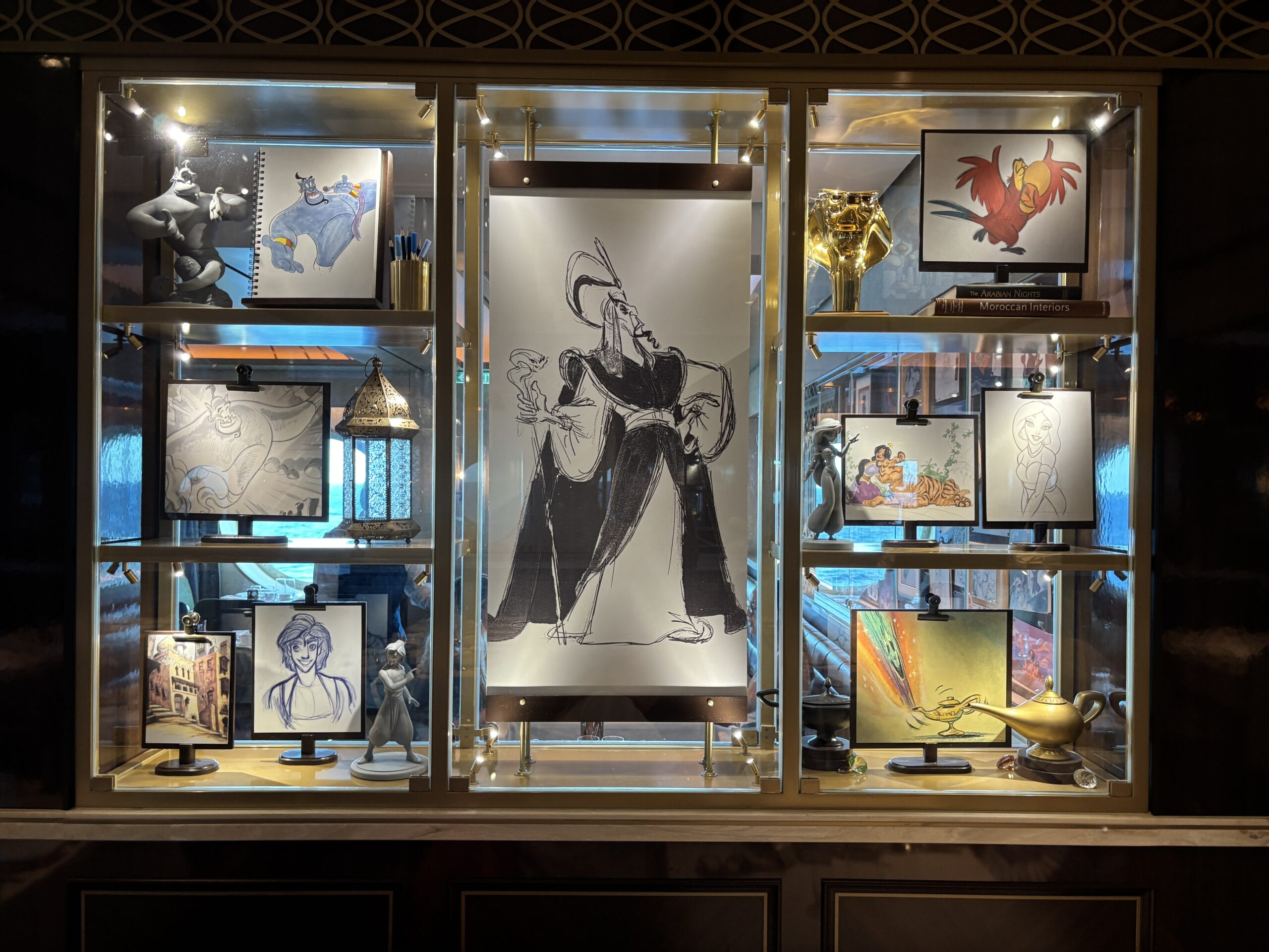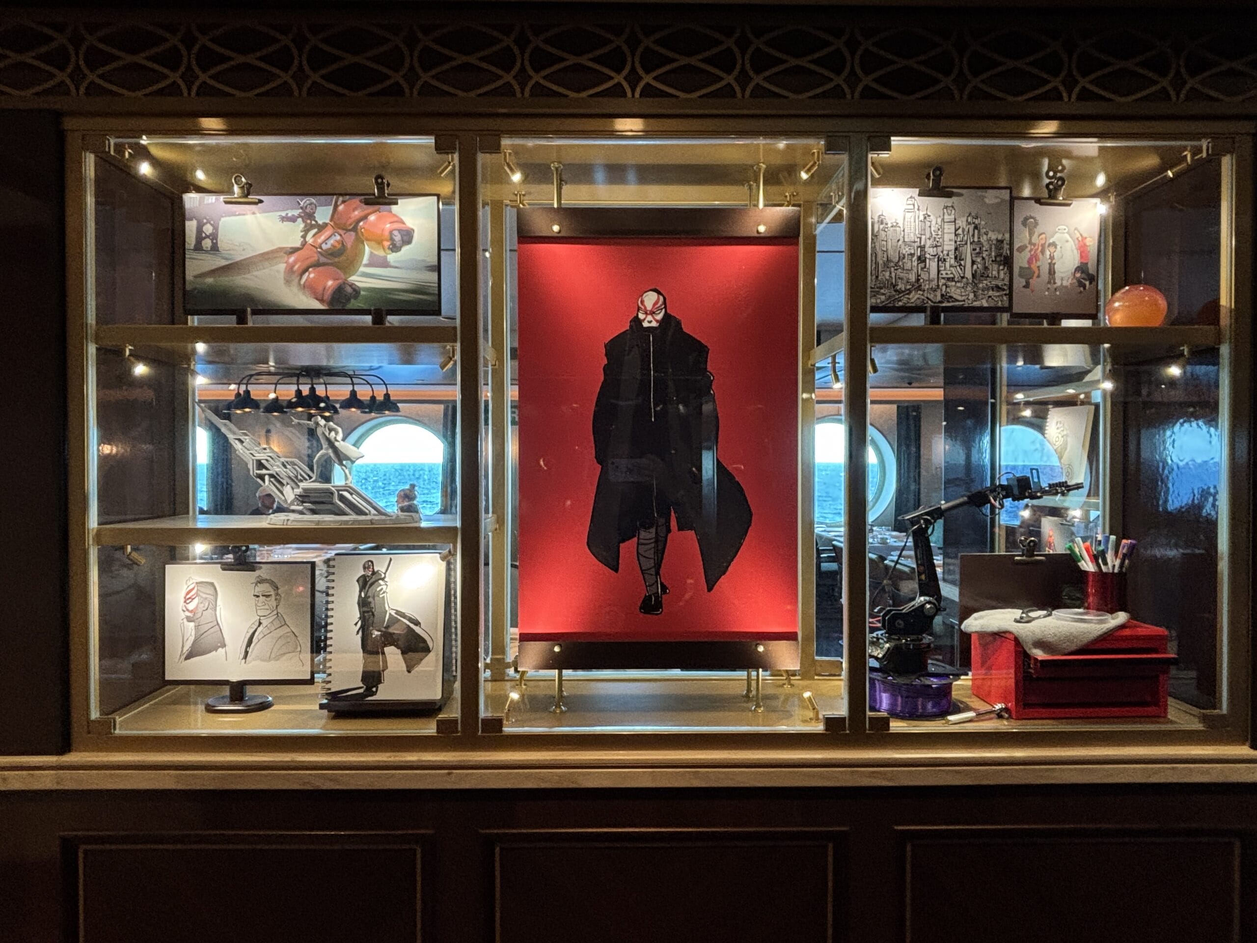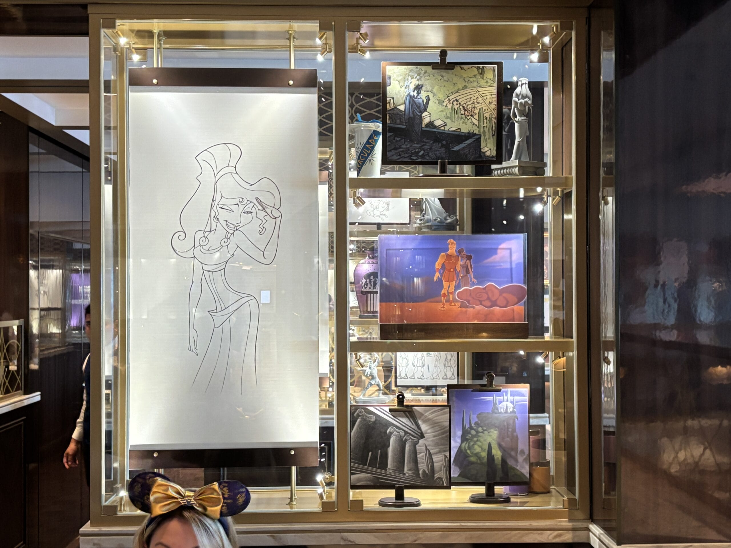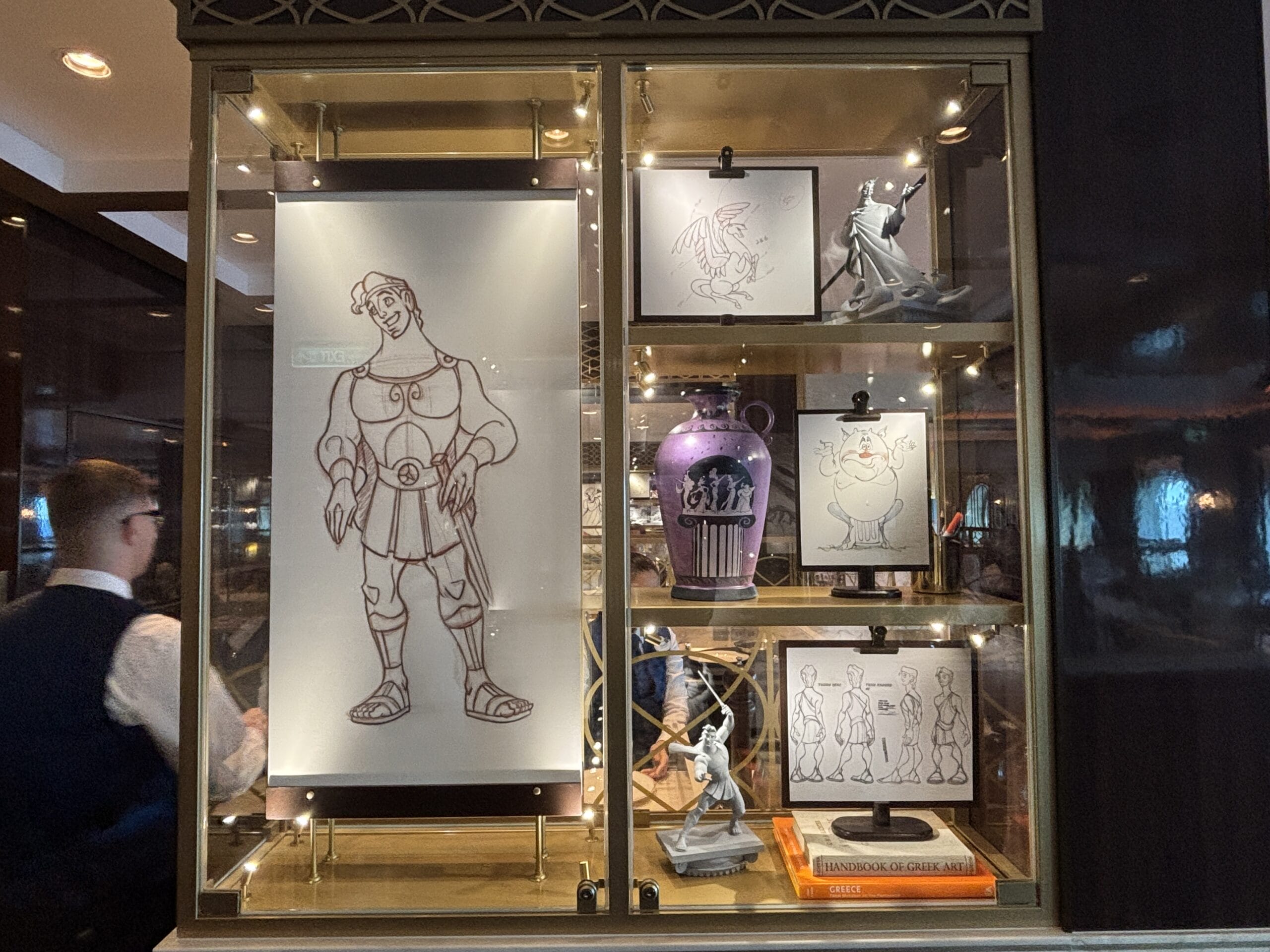 The Walt Disney dining room also has display cases throughout the space with sketches, models, and memorabilia for animated films.