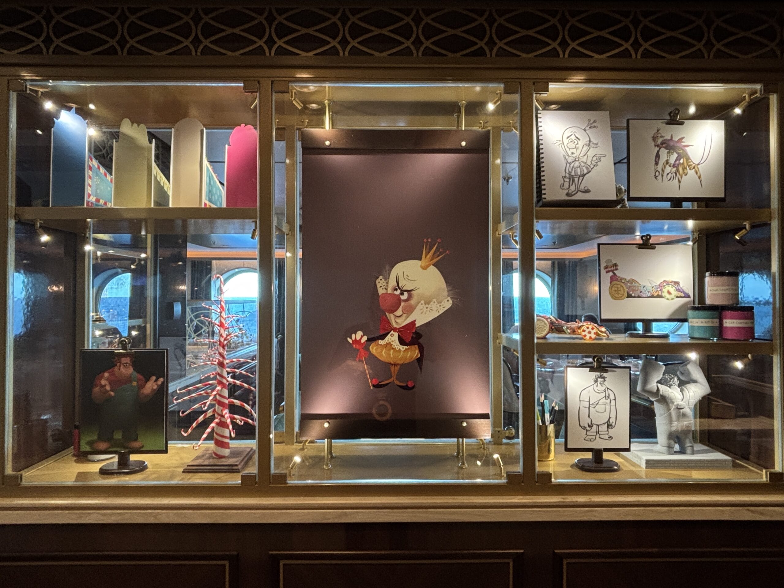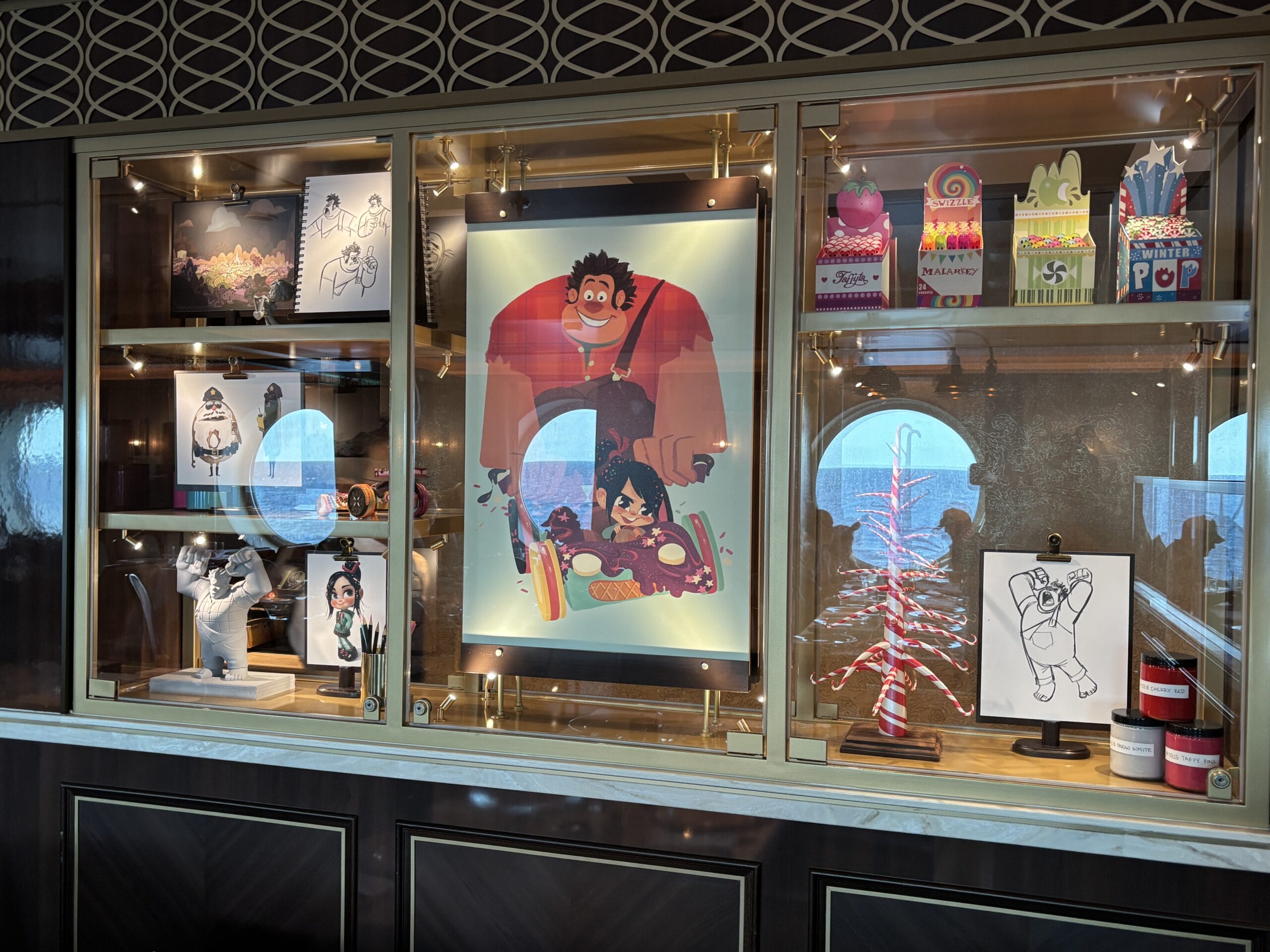 Colorful illustrations, sketches, medals, and more are in the Wreck-It Ralph display. Be sure to check out the themed slide for the Oceaneer Club.