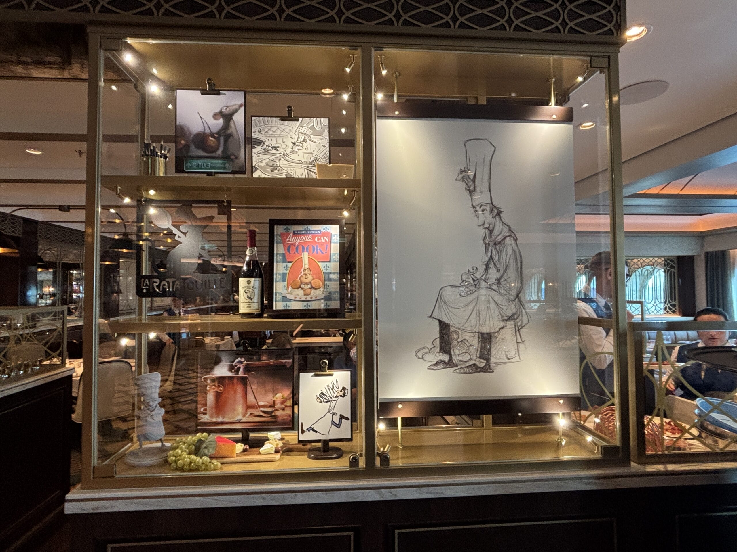 Lastly, model grapes, a bottle wine, and more props surround sketches and artwork represent Remy’s Ratatouille Adventure in the Walt dining room.