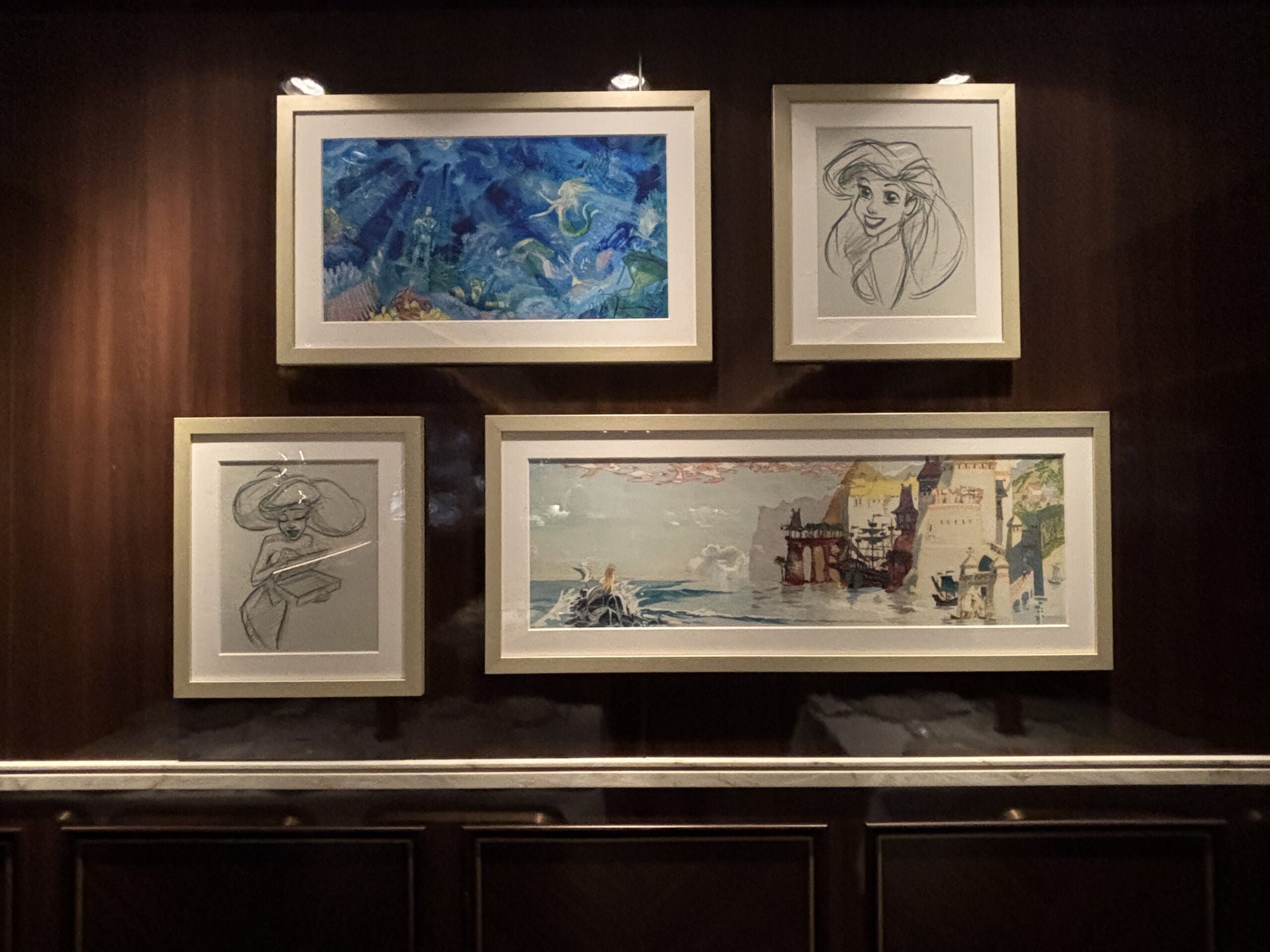 Sketches include Ursula, Ariel, King Triton, and Prince Eric. We also found Ursula’s necklace and Triton’s crown in the case.