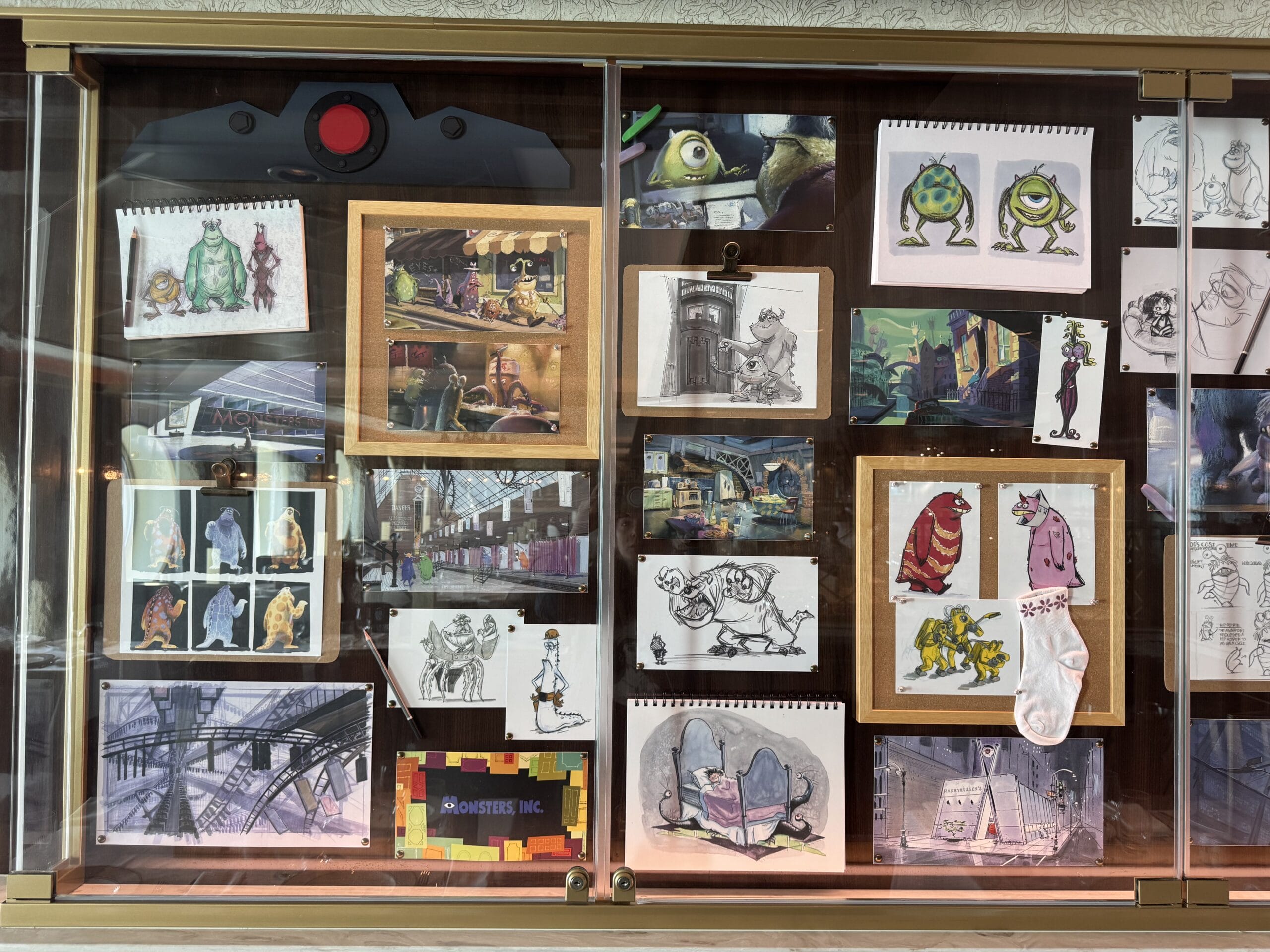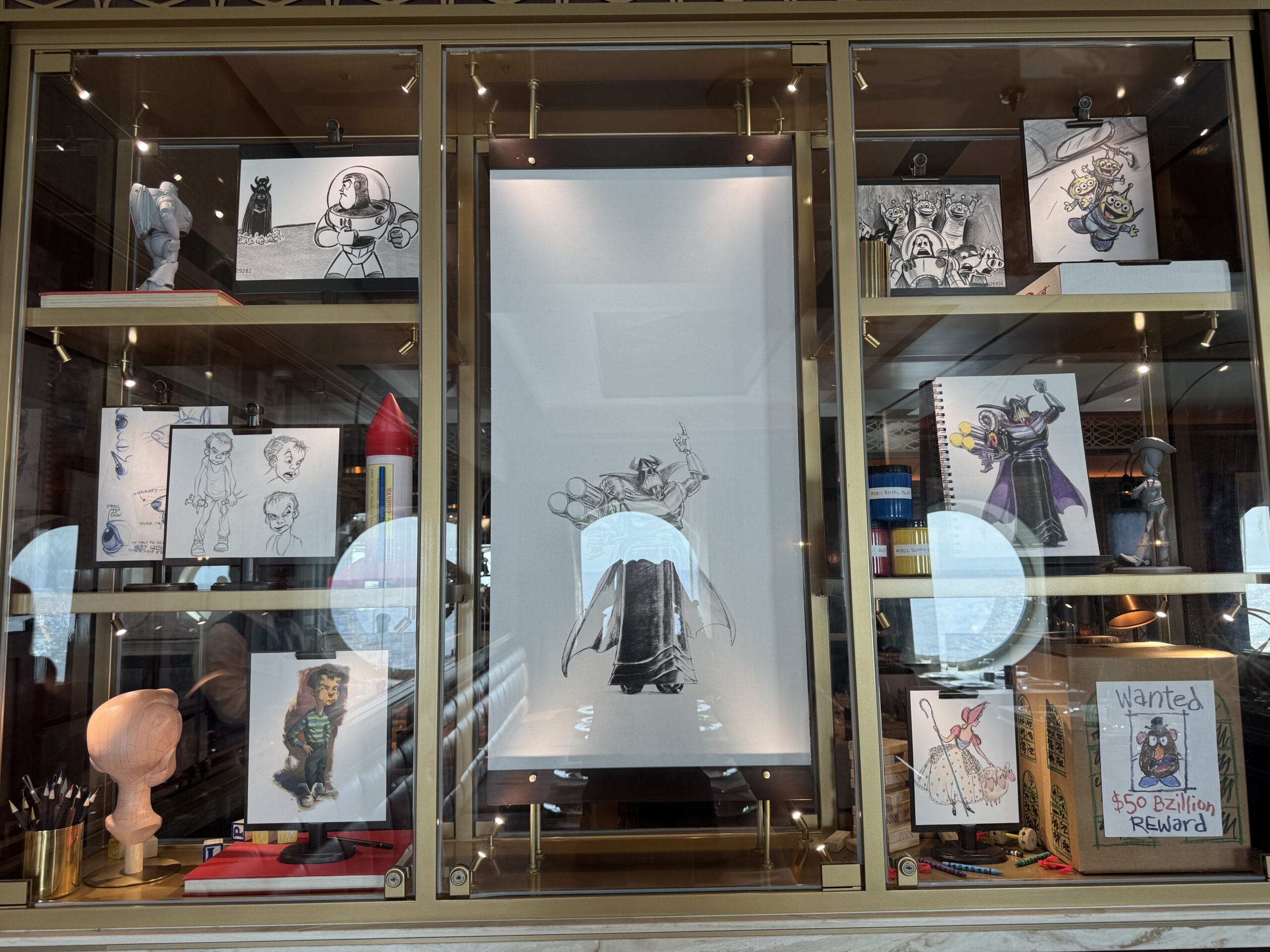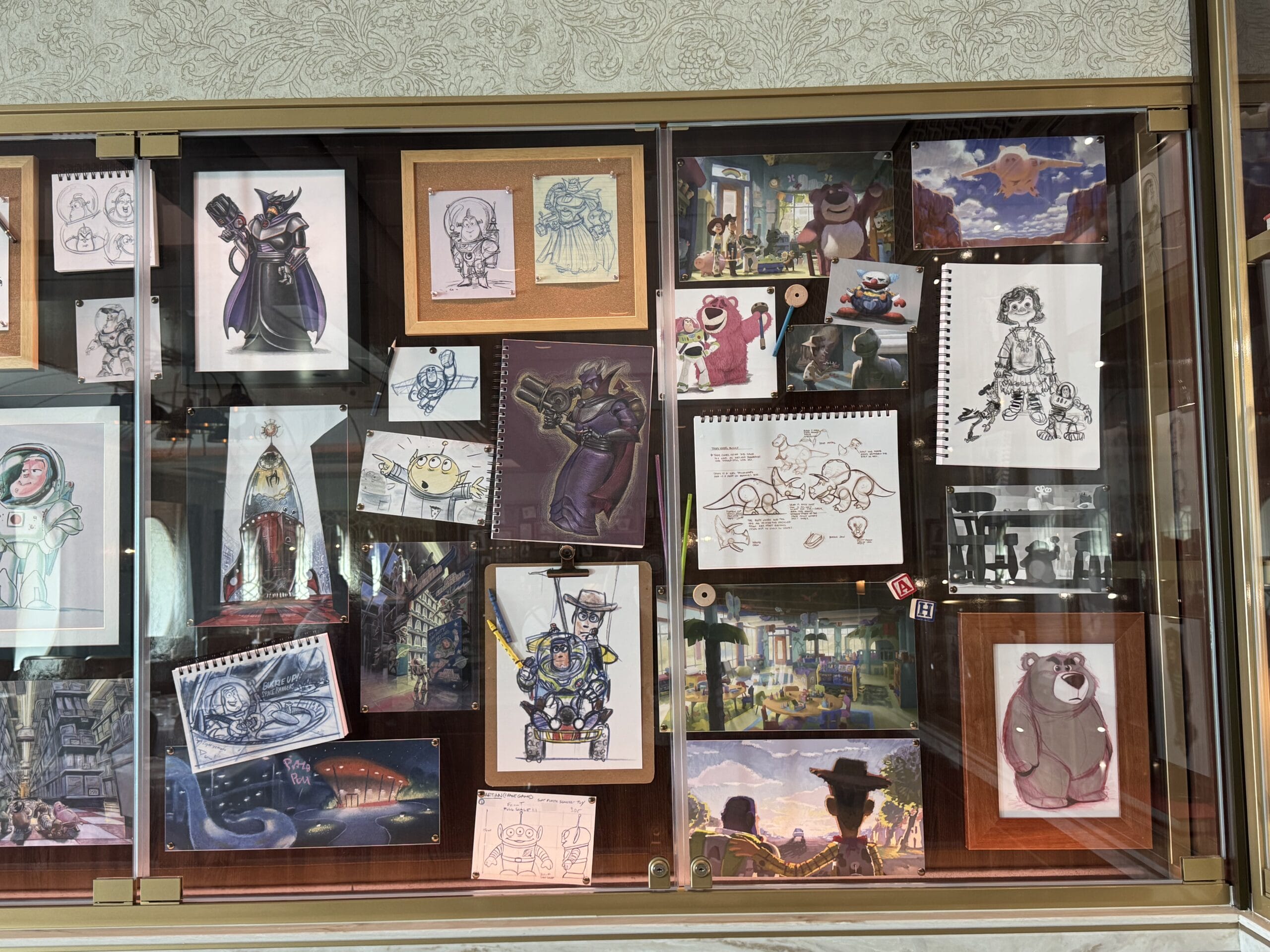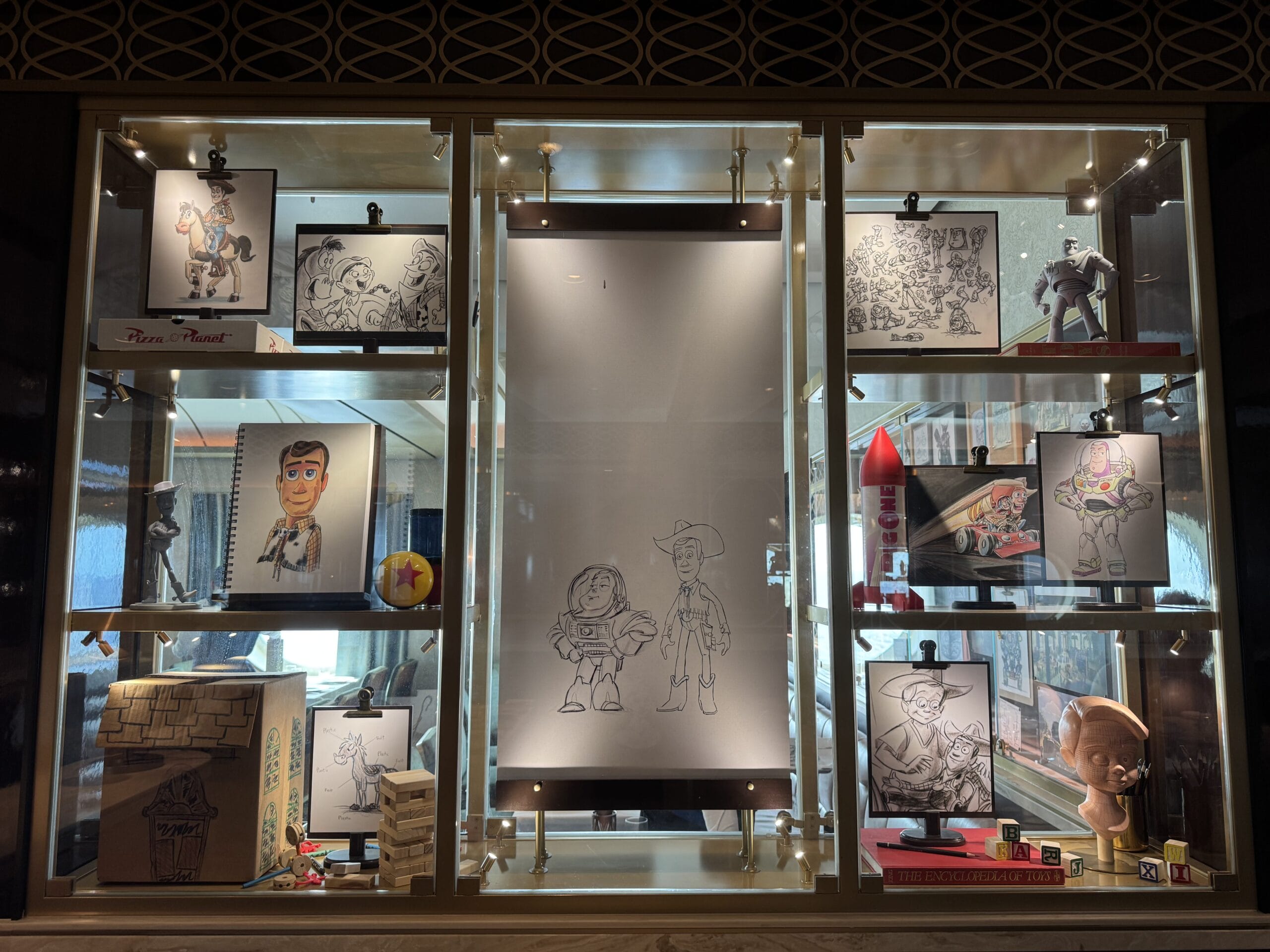 Sketches, models, and more artwork is placed inside this Toy Story display.