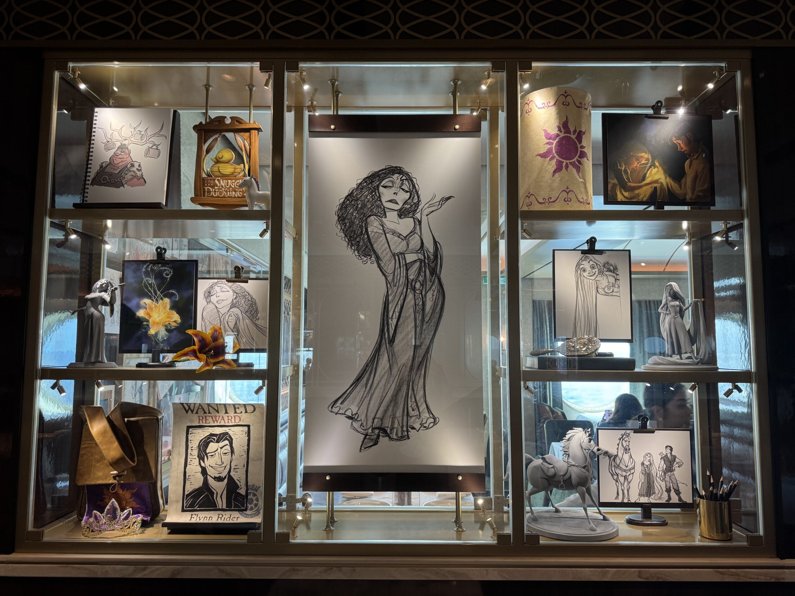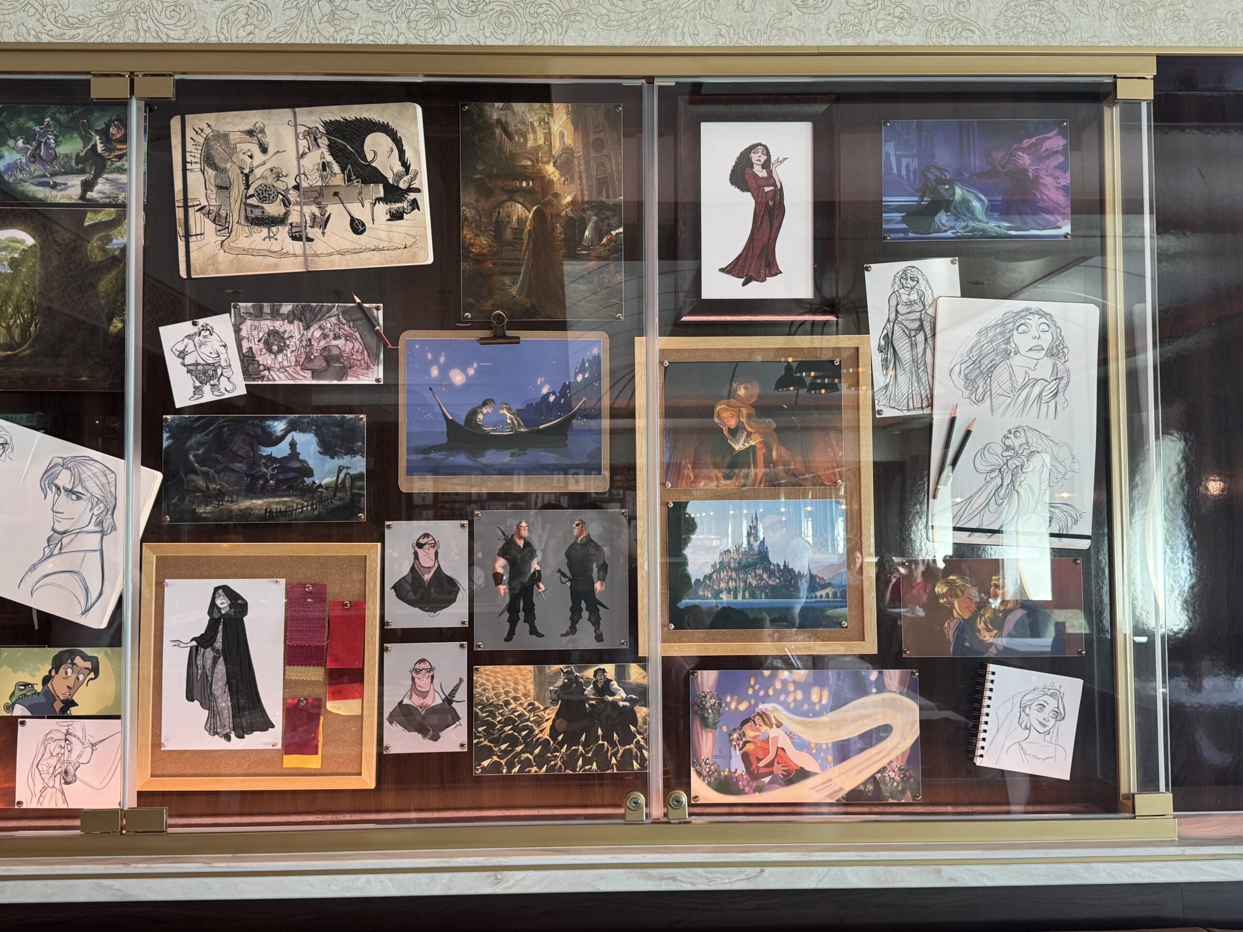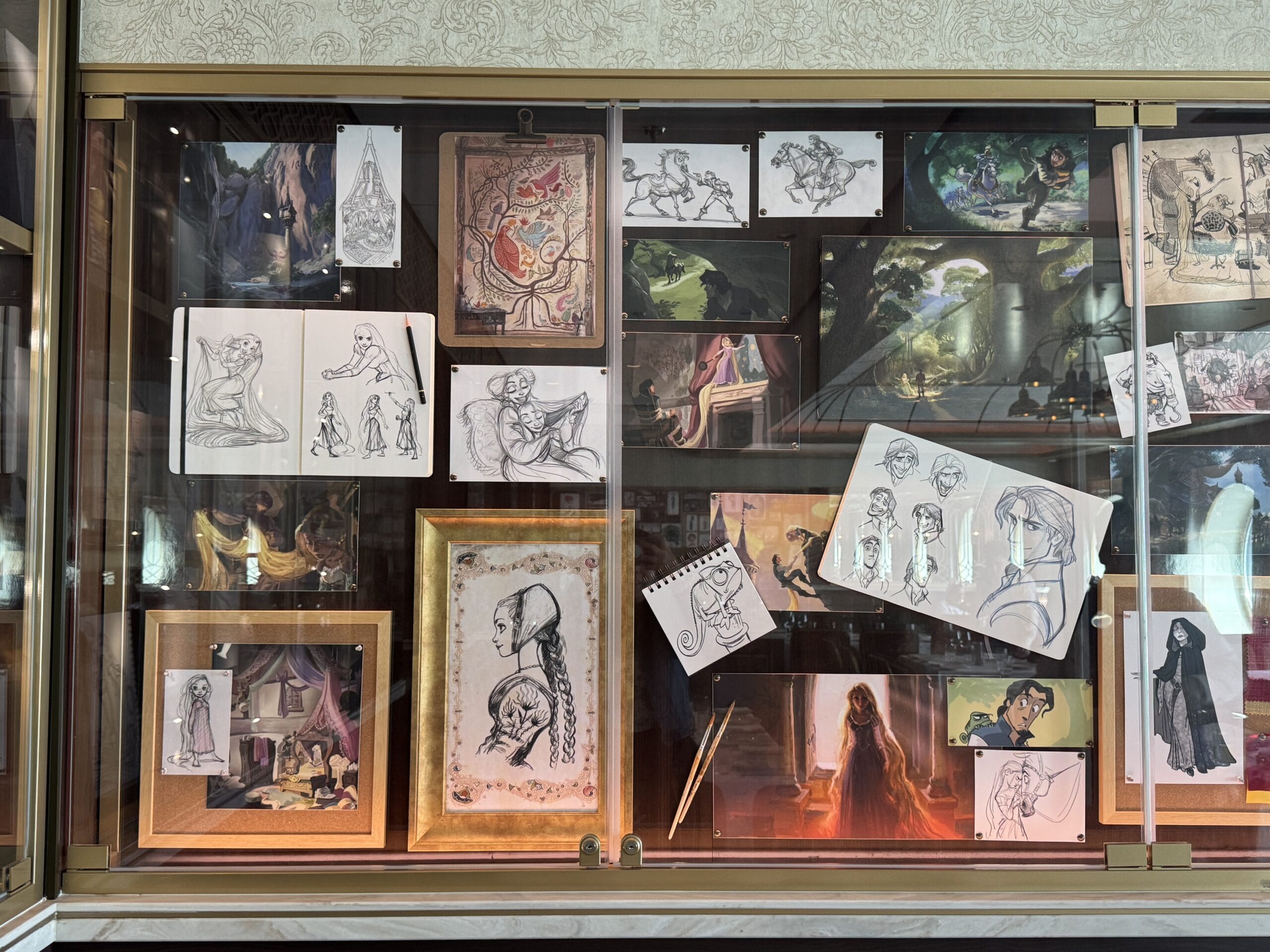 Large sketches of Rapunzel and Mother Gothel are the main pieces of art in the Tangled display. There is also art of Flynn Rider. We also spotted a floating lantern.