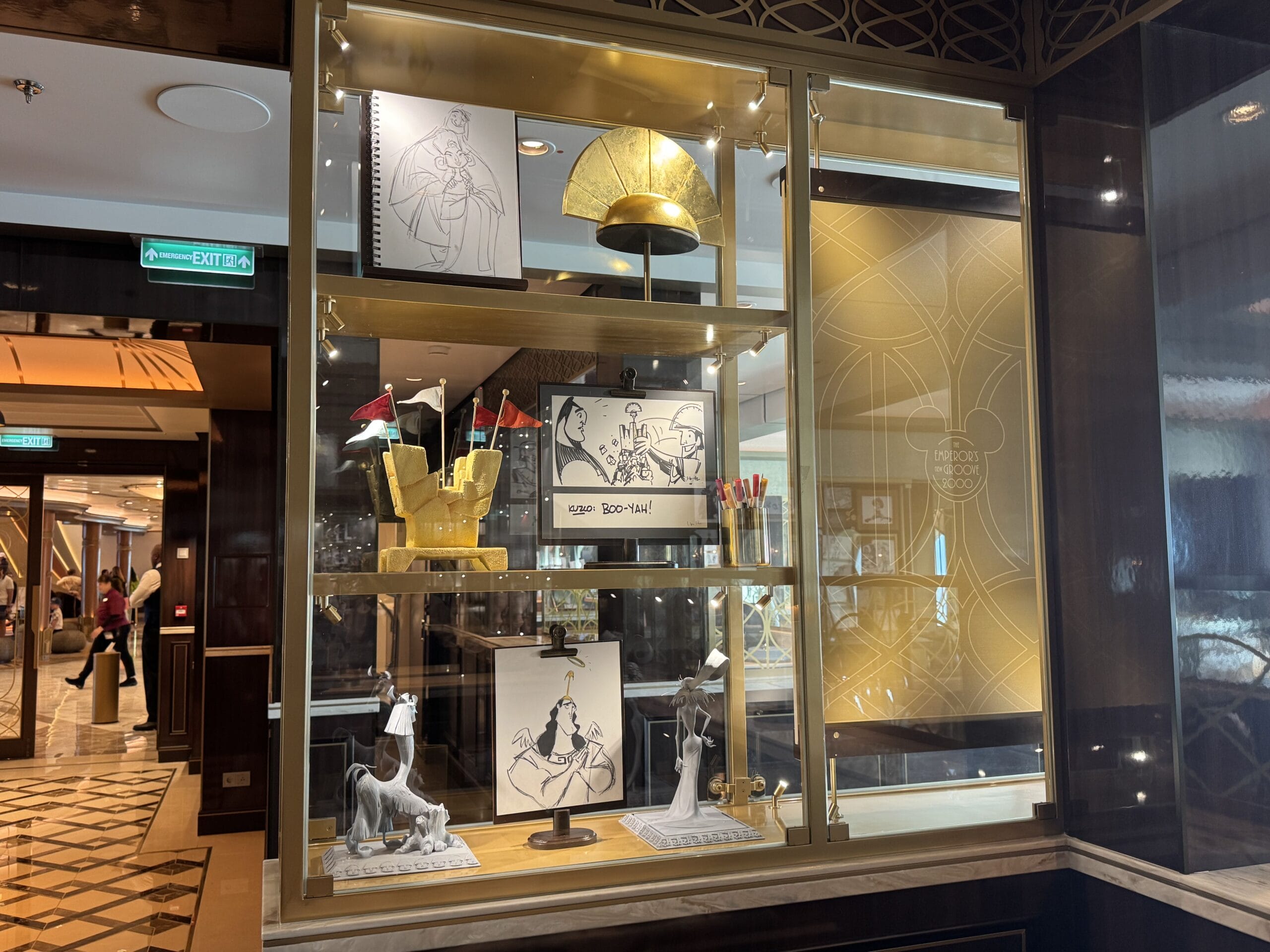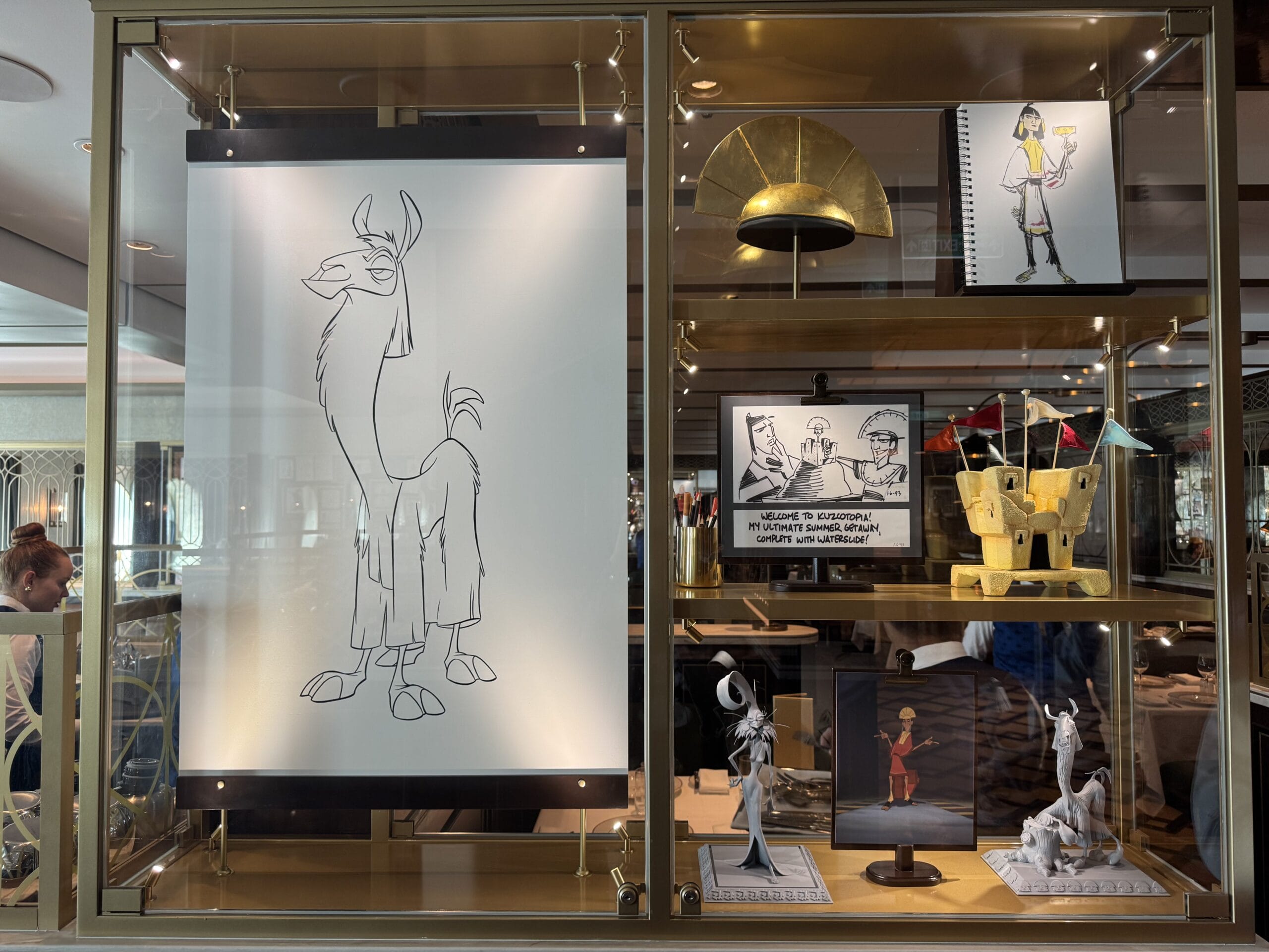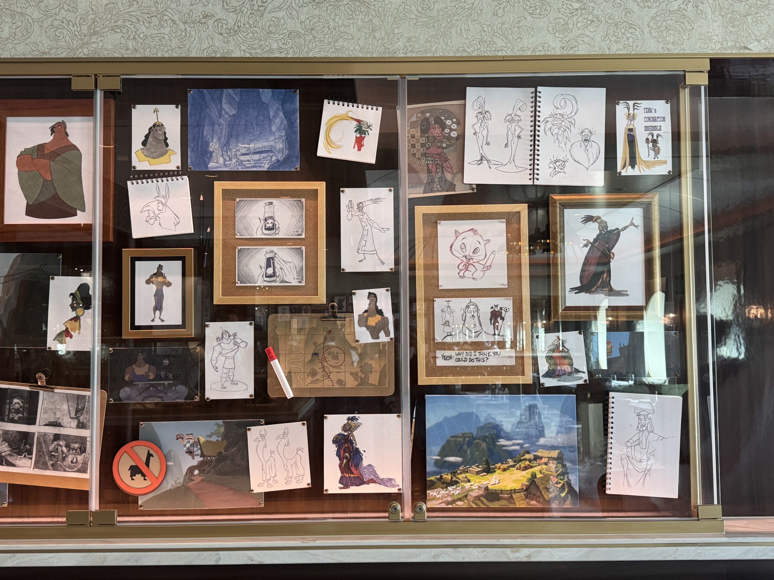 A sign with a llama and a red line through it is in the bottom corner of the Emperor’s New Groove display.
