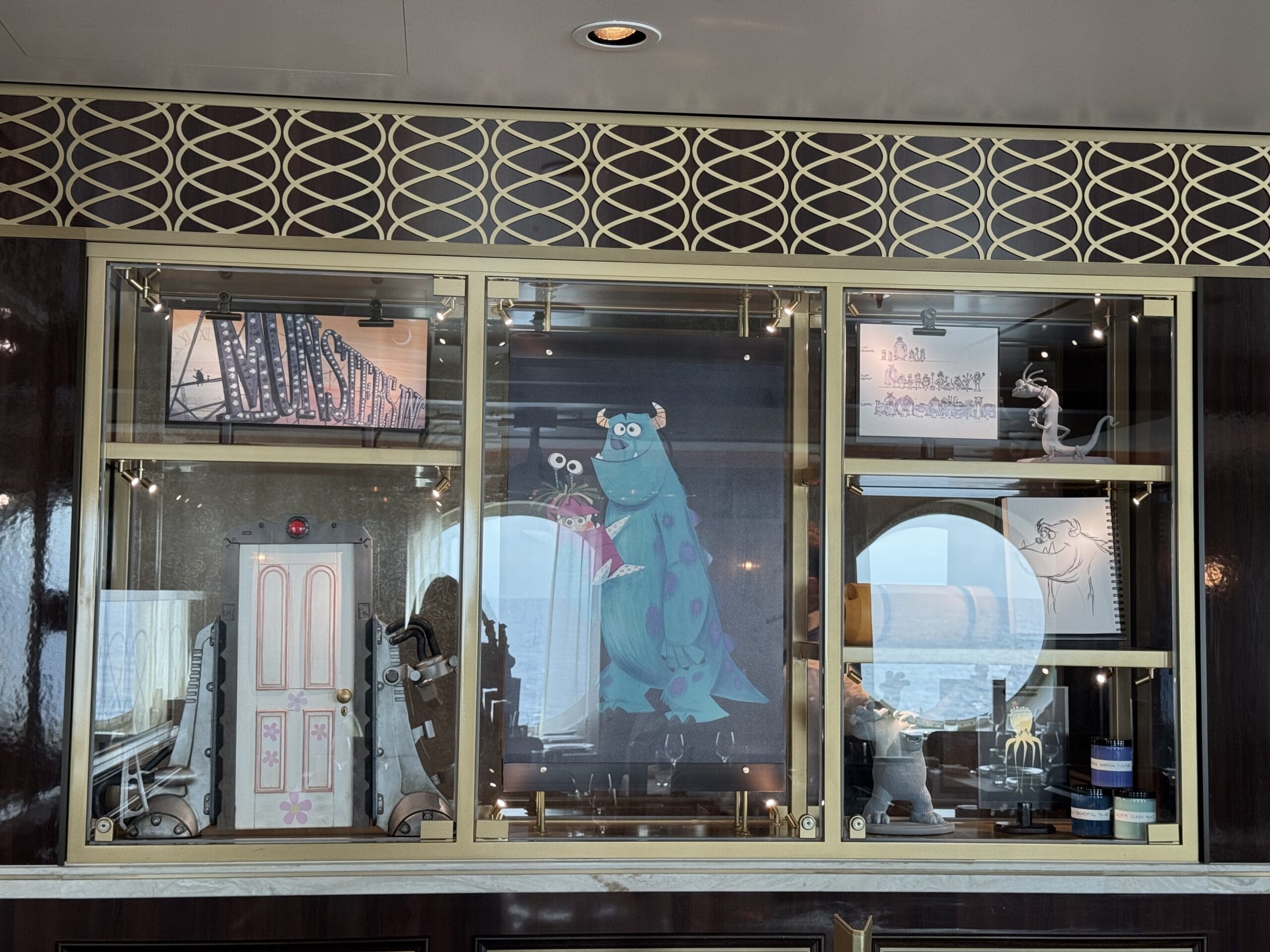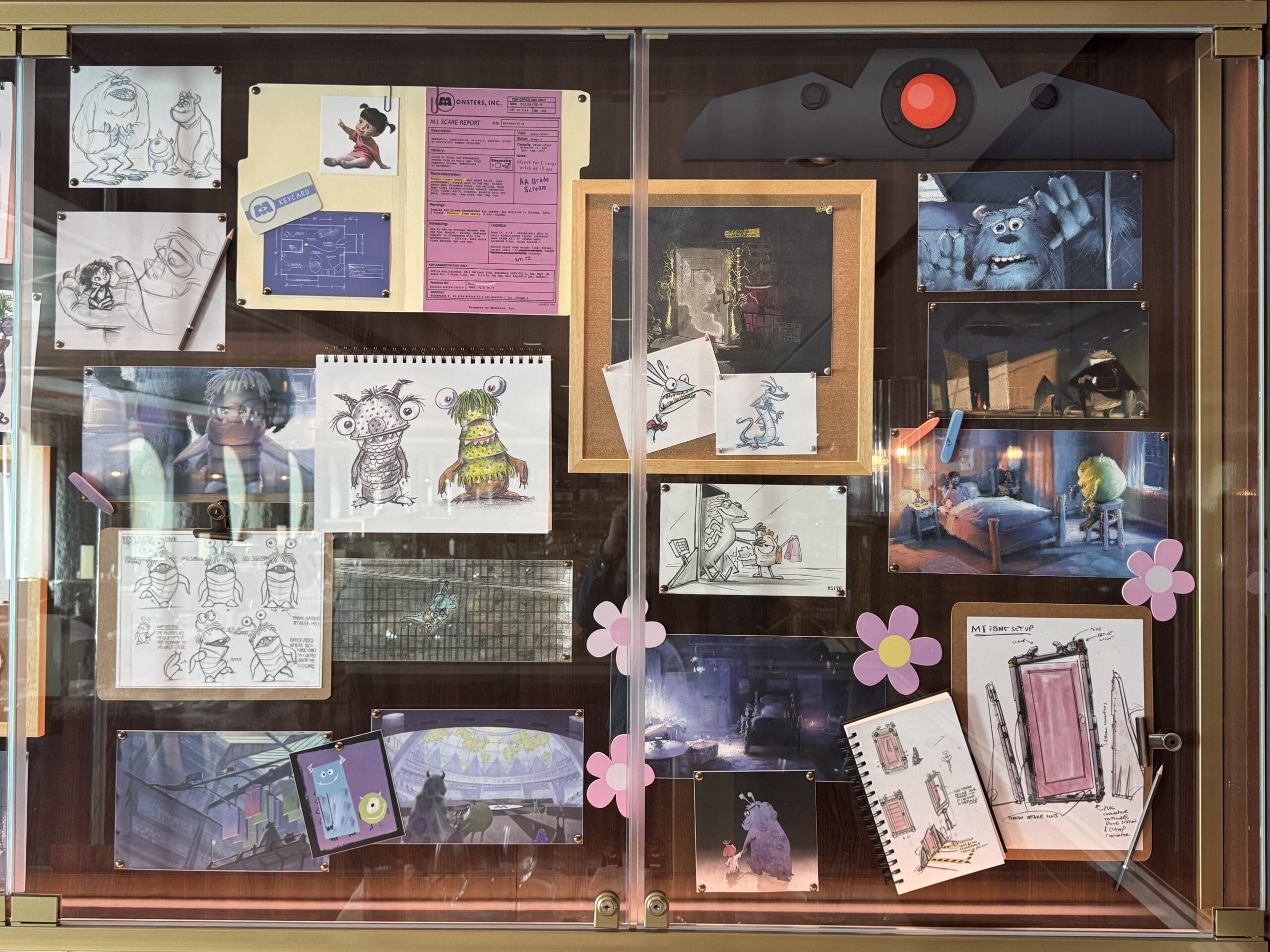 Lastly, models, sketches, and props from Monsters, Inc. are featured . Sulley holds Boo in the large artwork in the center.