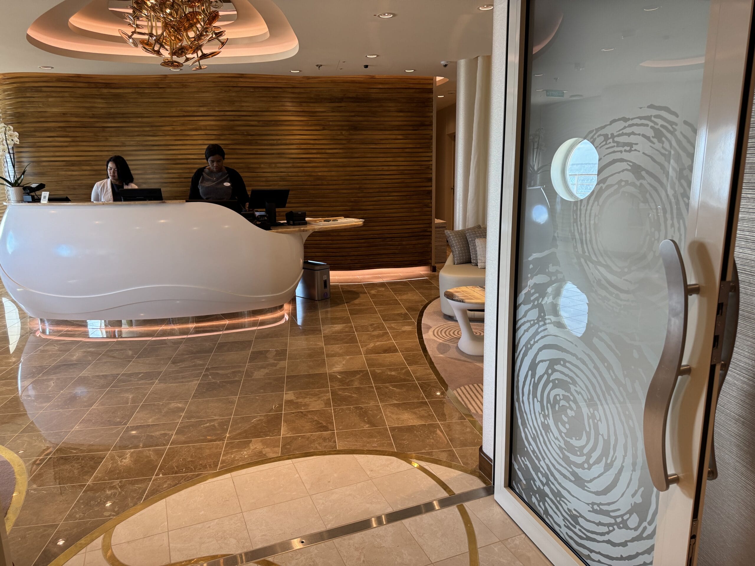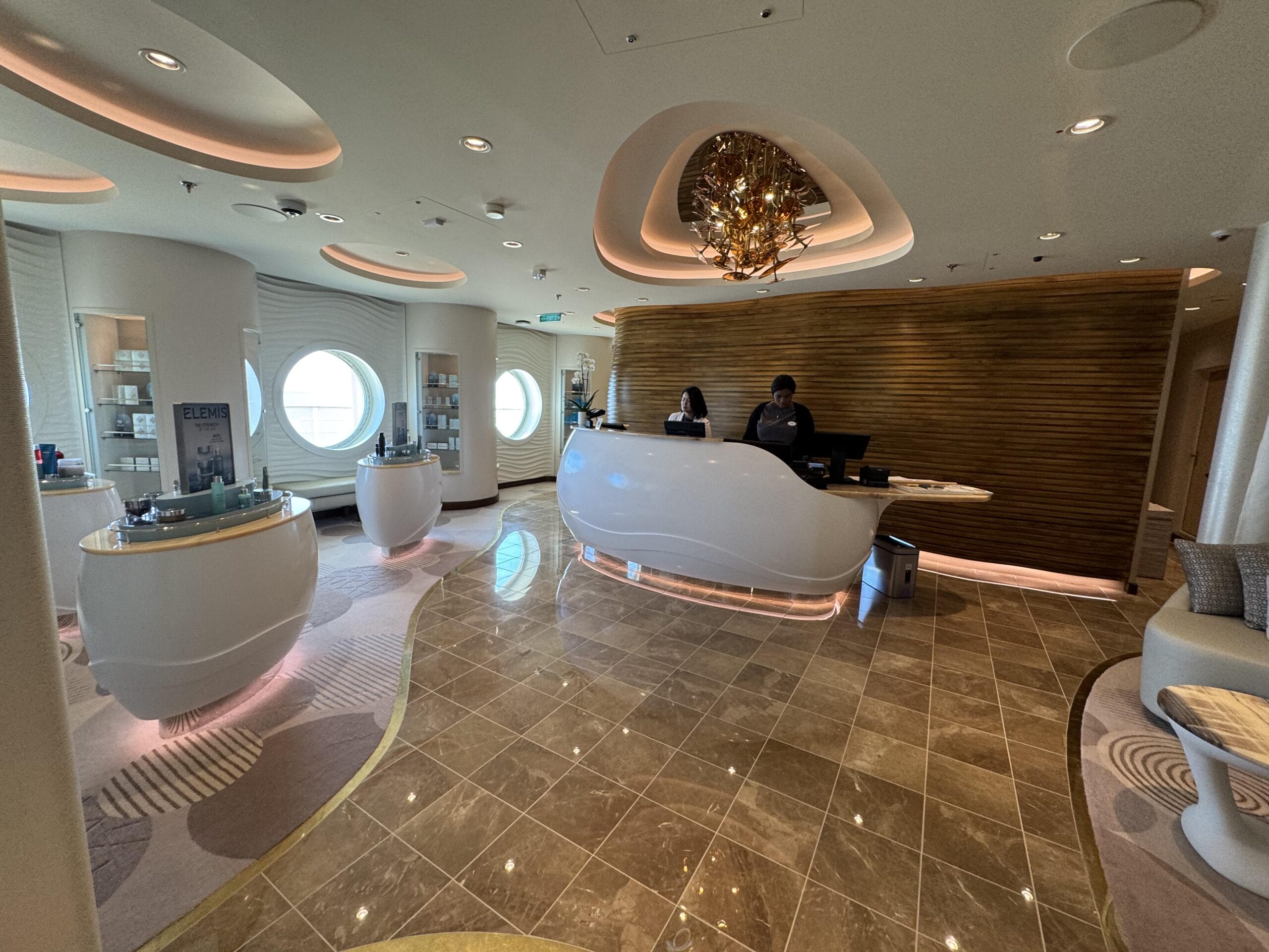 The check-in desk is almost immediately after guests enter the spa. A waiting area is to the right, and guests can browse products to the left.