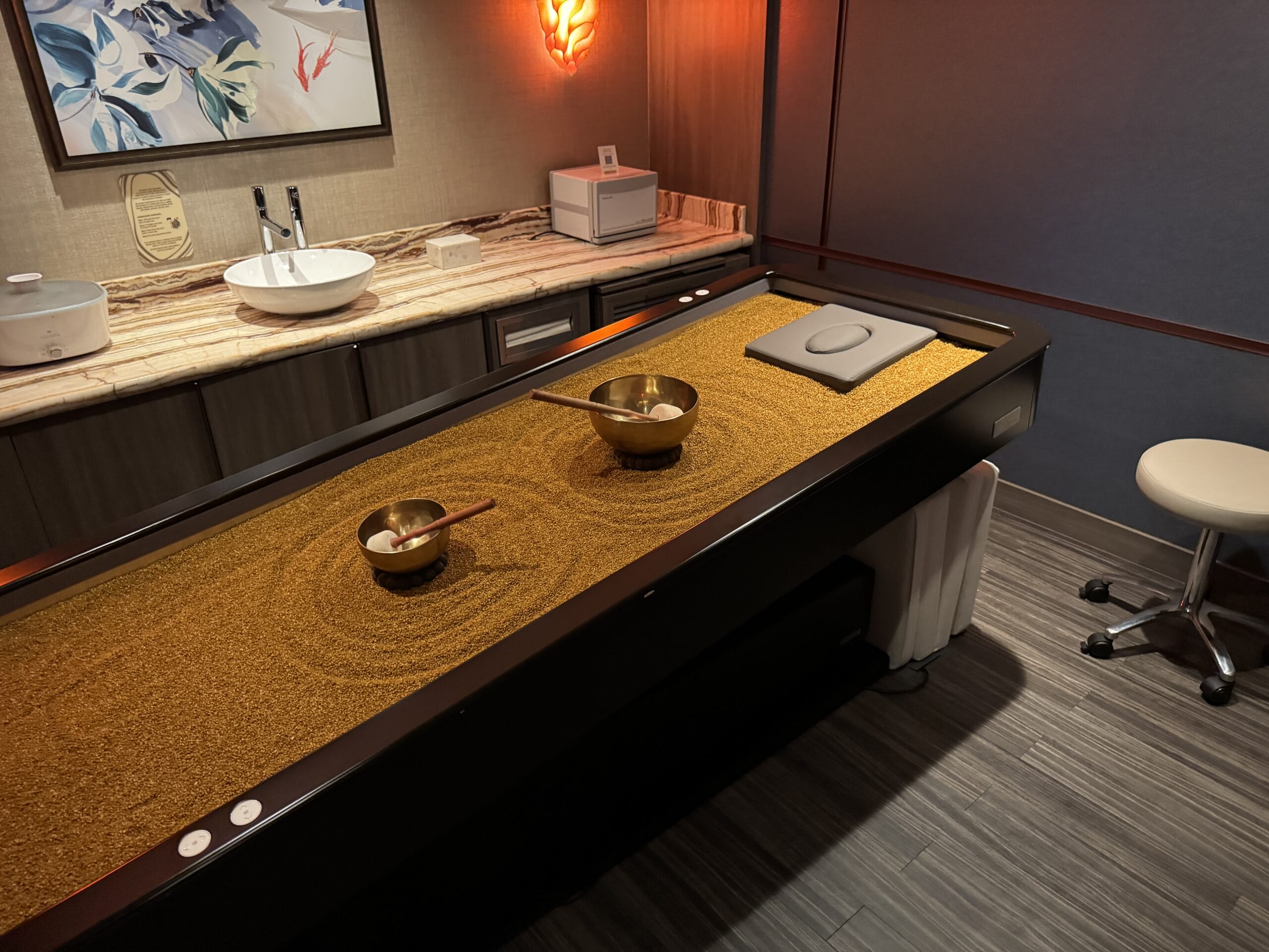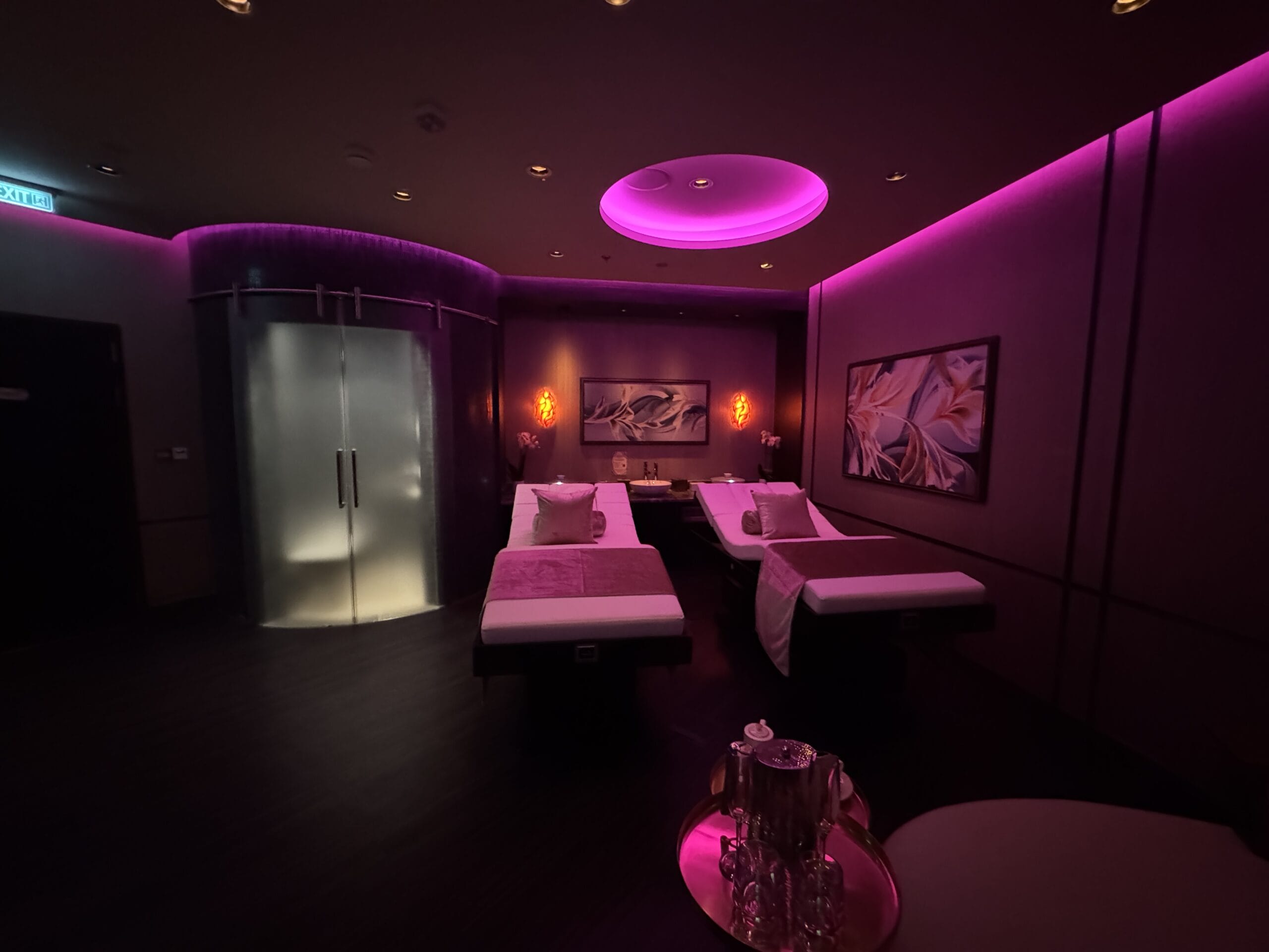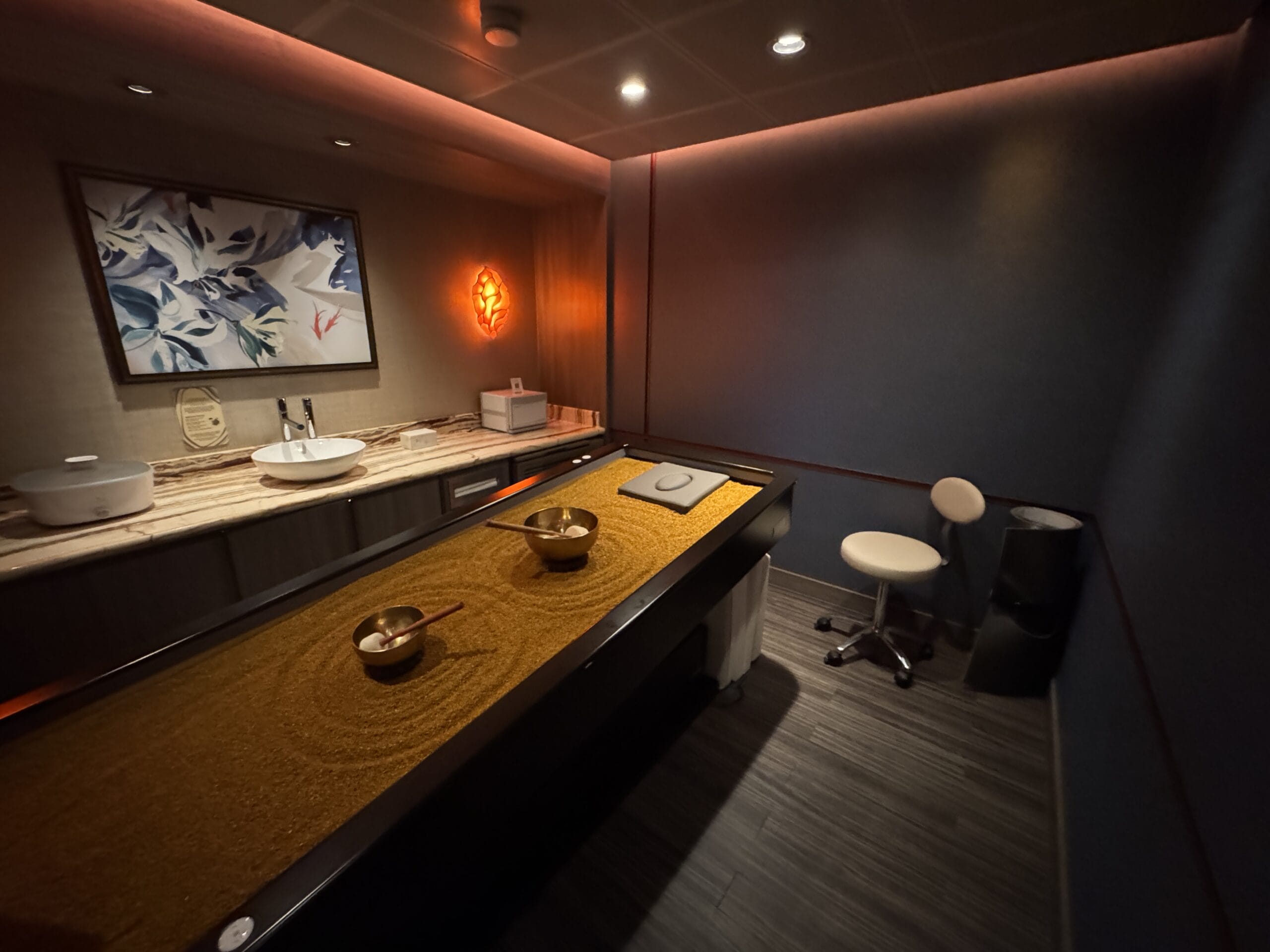 Calm lighting and artwork fills the spa for a relaxing environment.