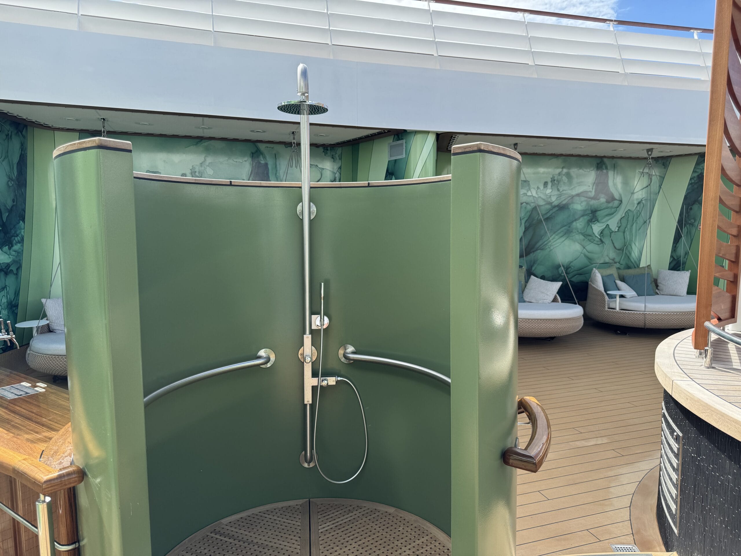 Guests may utilize the shower or whirlpool spa as part of their services received.
