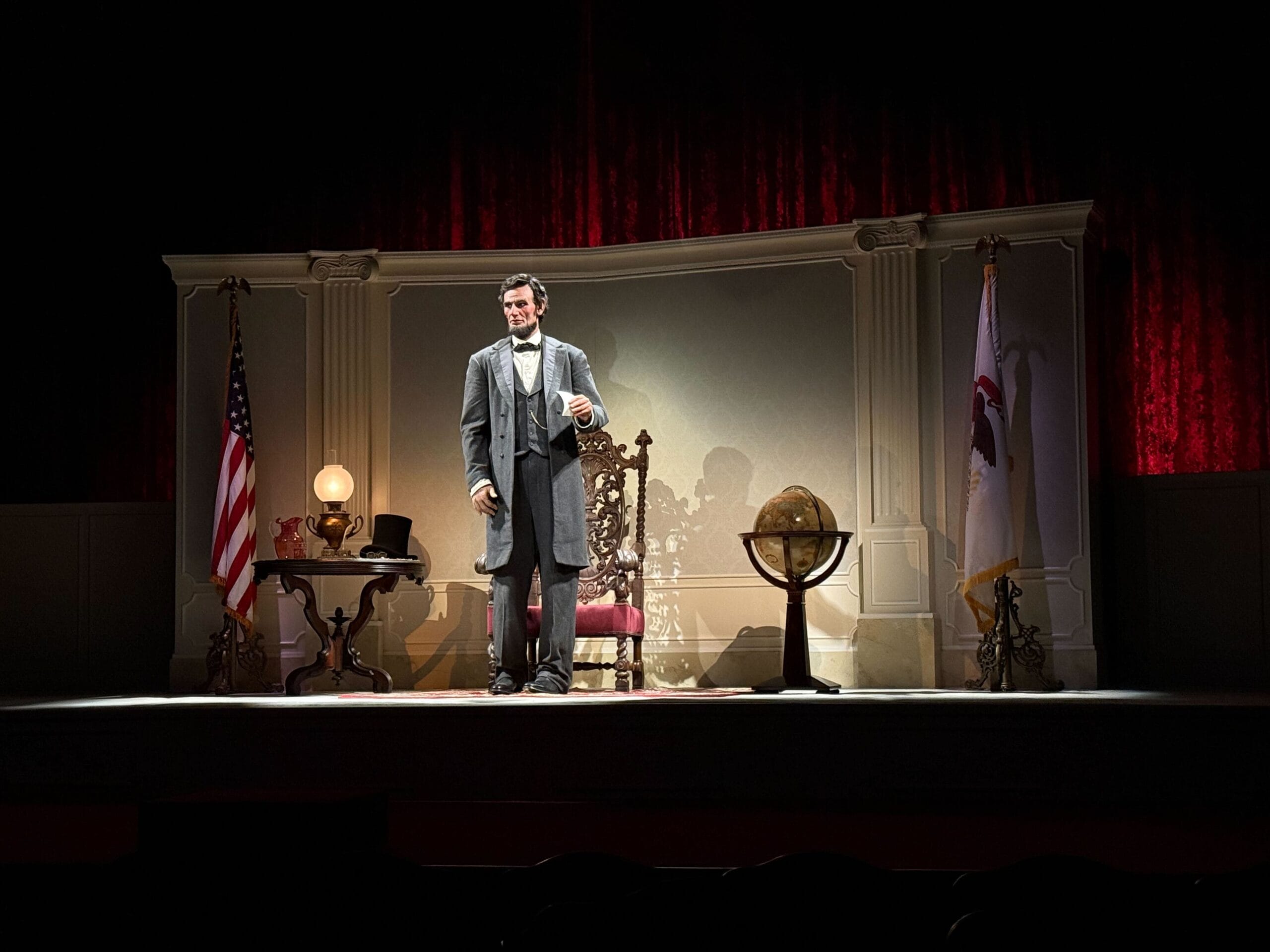 Great Moments with Mr. Lincoln is the same show except for a set change and lighting upgrades. Because of the new rotating stage set-up, there is now a wall directly behind the animatronic instead of a railing and columns. The table next to him no longer has a tablecloth and his iconic top hat has been added to the props.