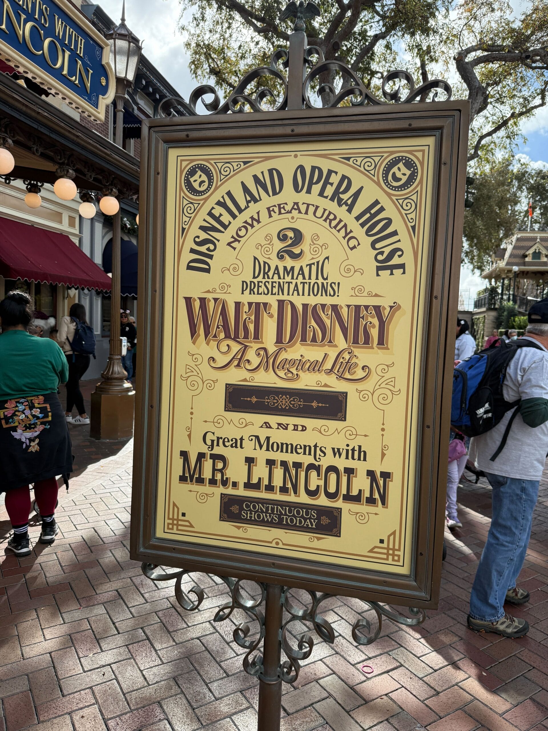 The Disneyland Story presenting Great Moments with Mr. Lincoln is temporarily unavailable while Walt Disney – A Magical Life, a new show that explores the life of Walt Disney, plays at the Main Street Opera House. The 2 shows will eventually be presented on a rotating basis.