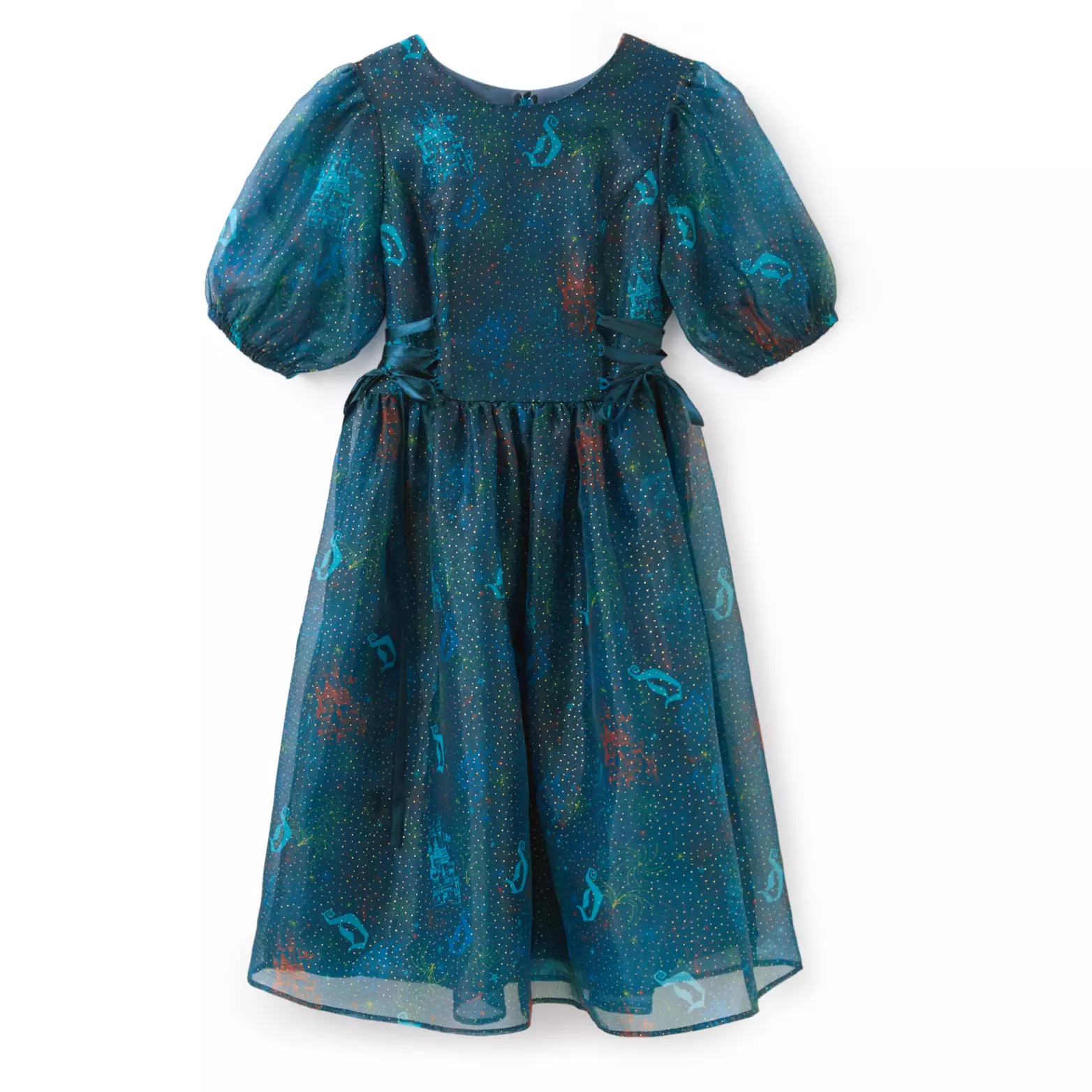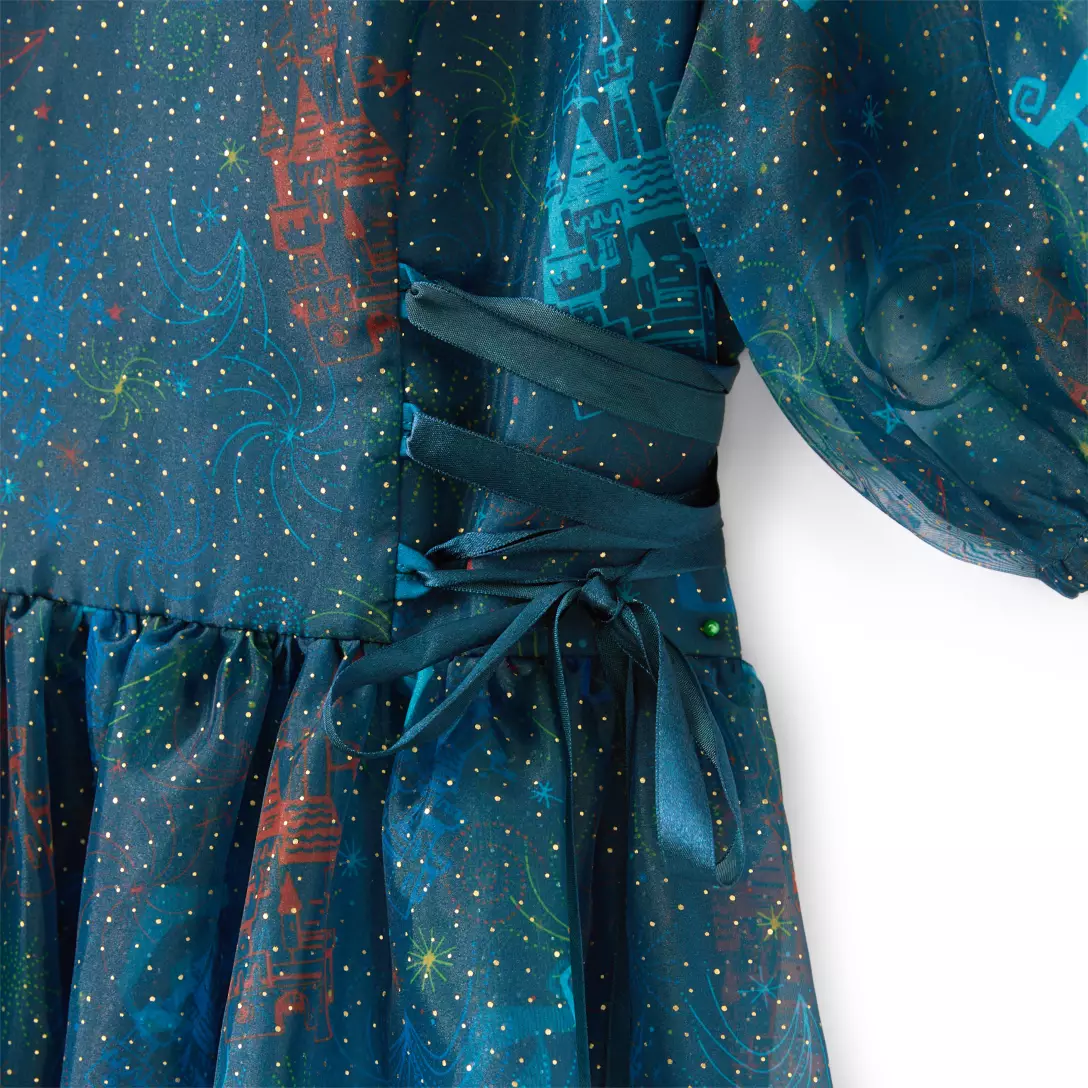 This blue dress is spotted all over with small white dots, so it looks like the night sky. Among the dots are blue “D” icons, fireworks, and Sleeping Beauty Castle. It has short puff sleeves. Satin ribbon lacing is on both sides.