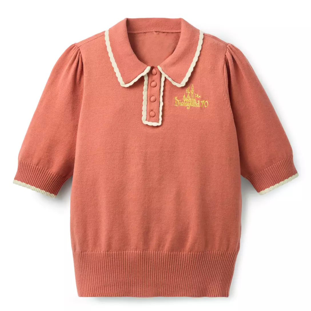 This is a peachy orange sweater shirt. It has white trim around the collar, buttons, and ribbed cuffs. The buttons go about 1/3rd of the way down the chest. On the left chest is “Disneyland 70” embroidered in yellow with castle towers.
