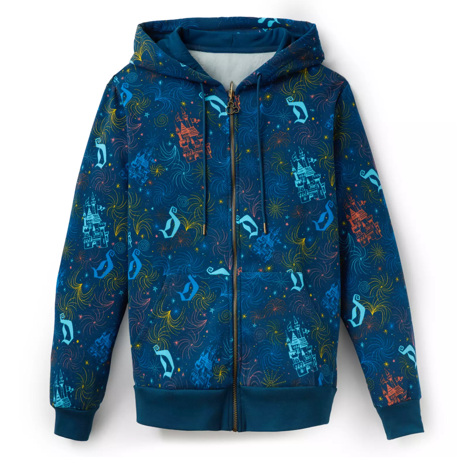 The same all-over pattern is on this hoodie. It features fireworks, Sleeping Beauty Castle, and the Disneyland “D.” The cuffs and hem are solid blue. The zipper pull is a Mickey icon. The hoodie has a drawstring.