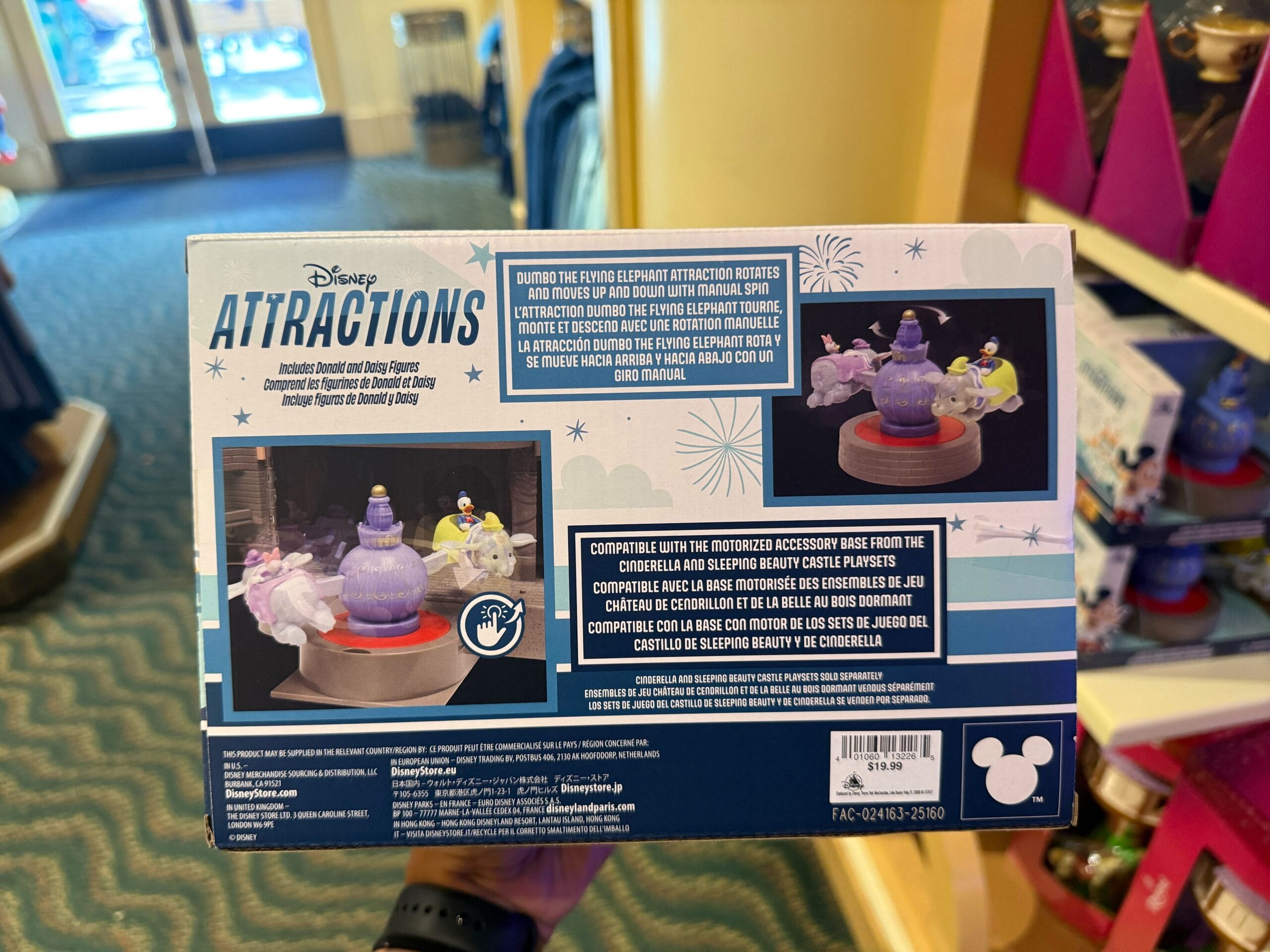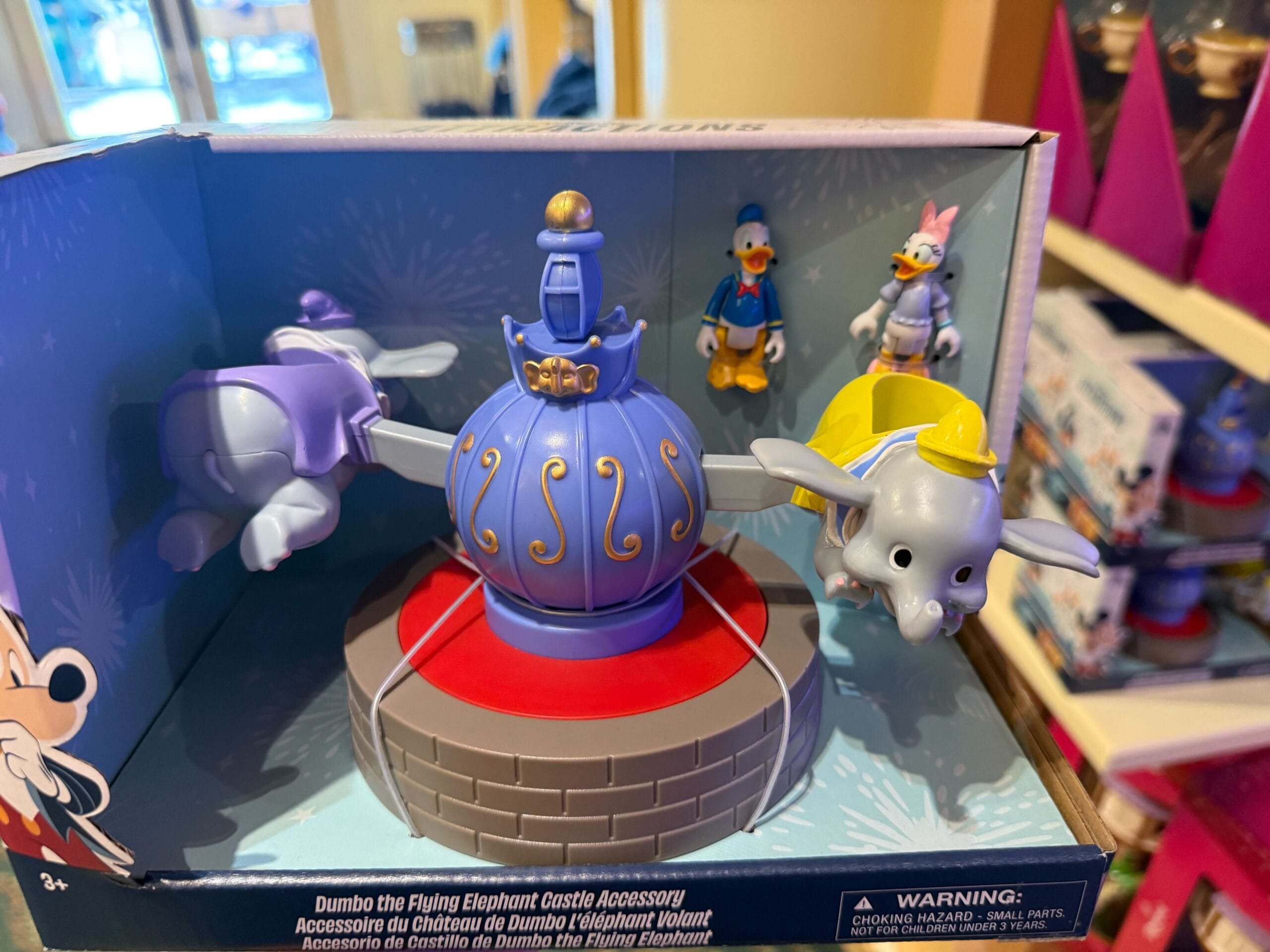 This Dumbo the Flying Elephant set is designed to match the Sleeping Beauty Castle playset but can function on its own. It includes two Dumbo ride vehicles attached to a spinning column. The toy has existed previously, although with different packaging.