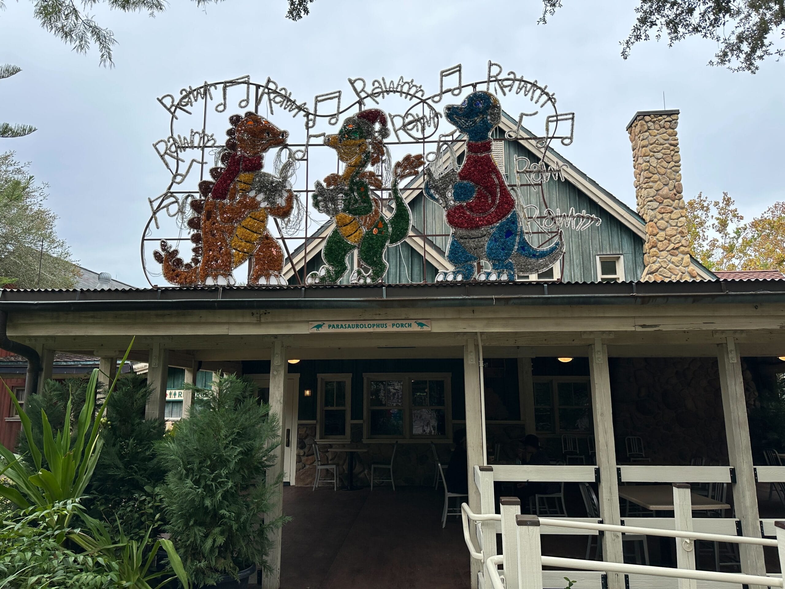 The meet and greet will be on the patio of Restaurantosaurus, one of the last remaining vestiges of DinoLand. Above the patio entrance, a trio of light-up tinsel dinosaurs appear to sing Christmas carols.
