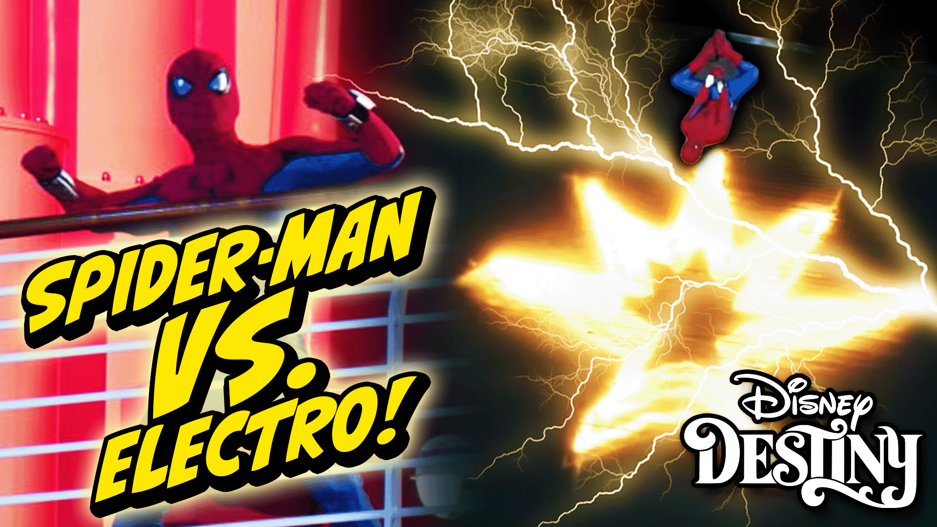 It’s Electro, and he wants to start some trouble. But, Spider-Man shows up to save the day. He swings down from the top of a funnel.