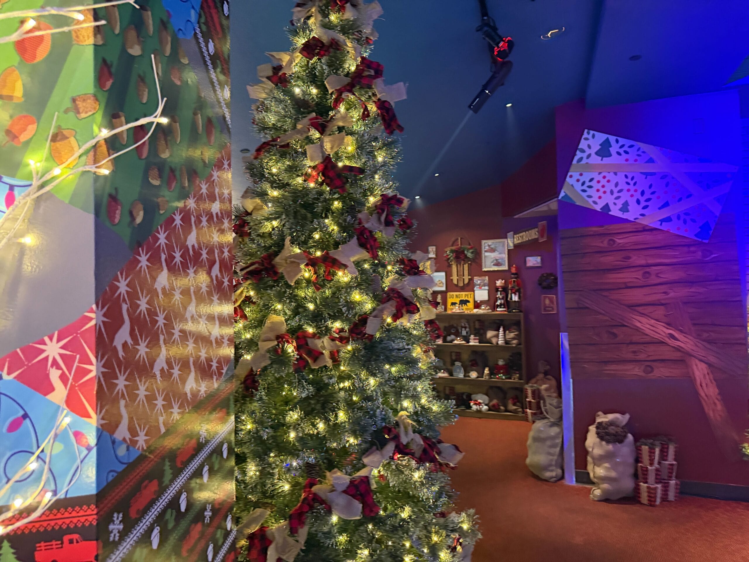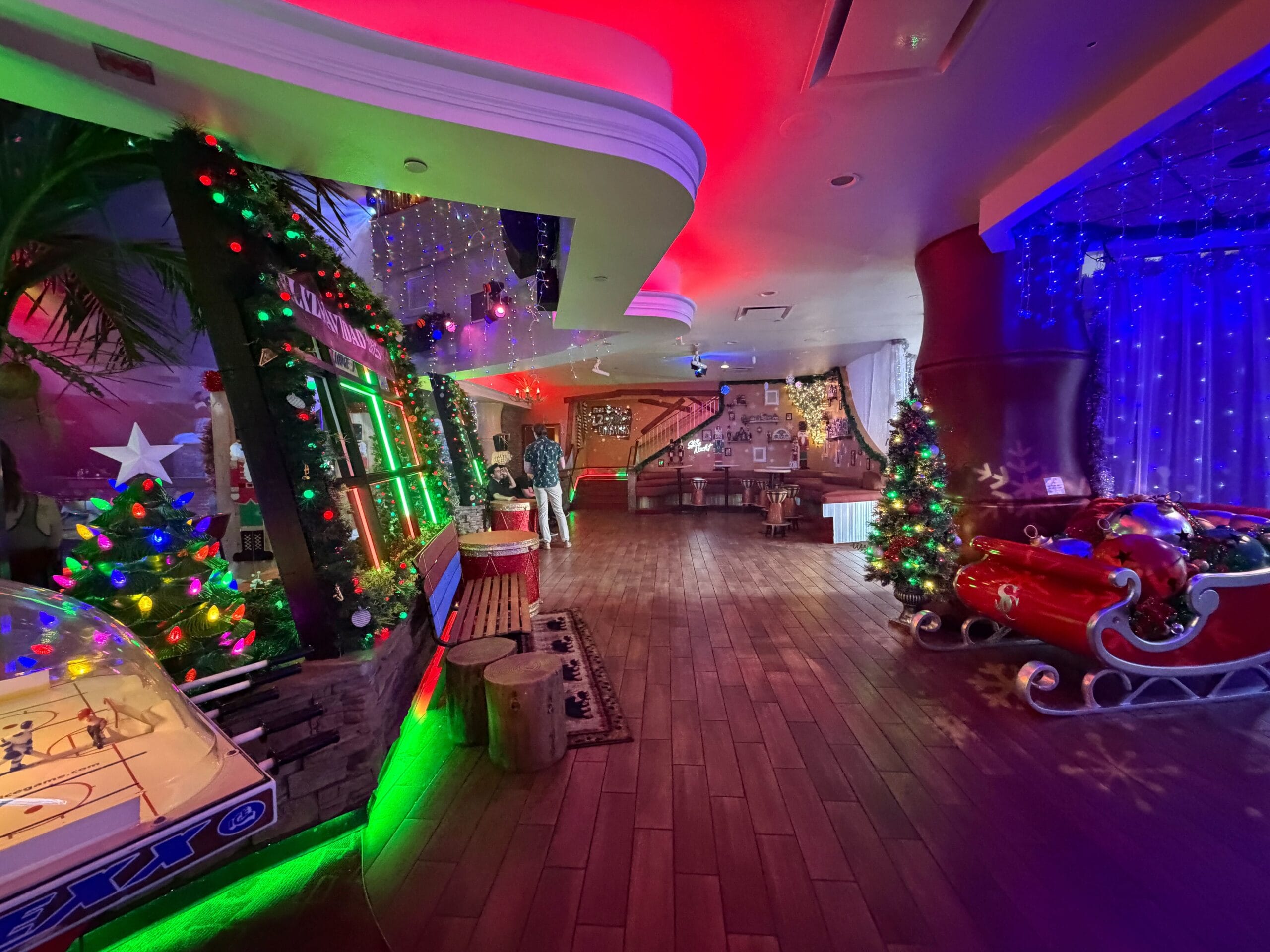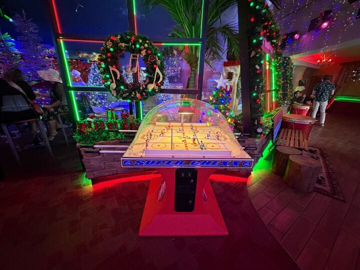 There’s a Super Chexx ice hockey machine available for guests to play alongside other holiday decor, including a sleigh pull of presents.