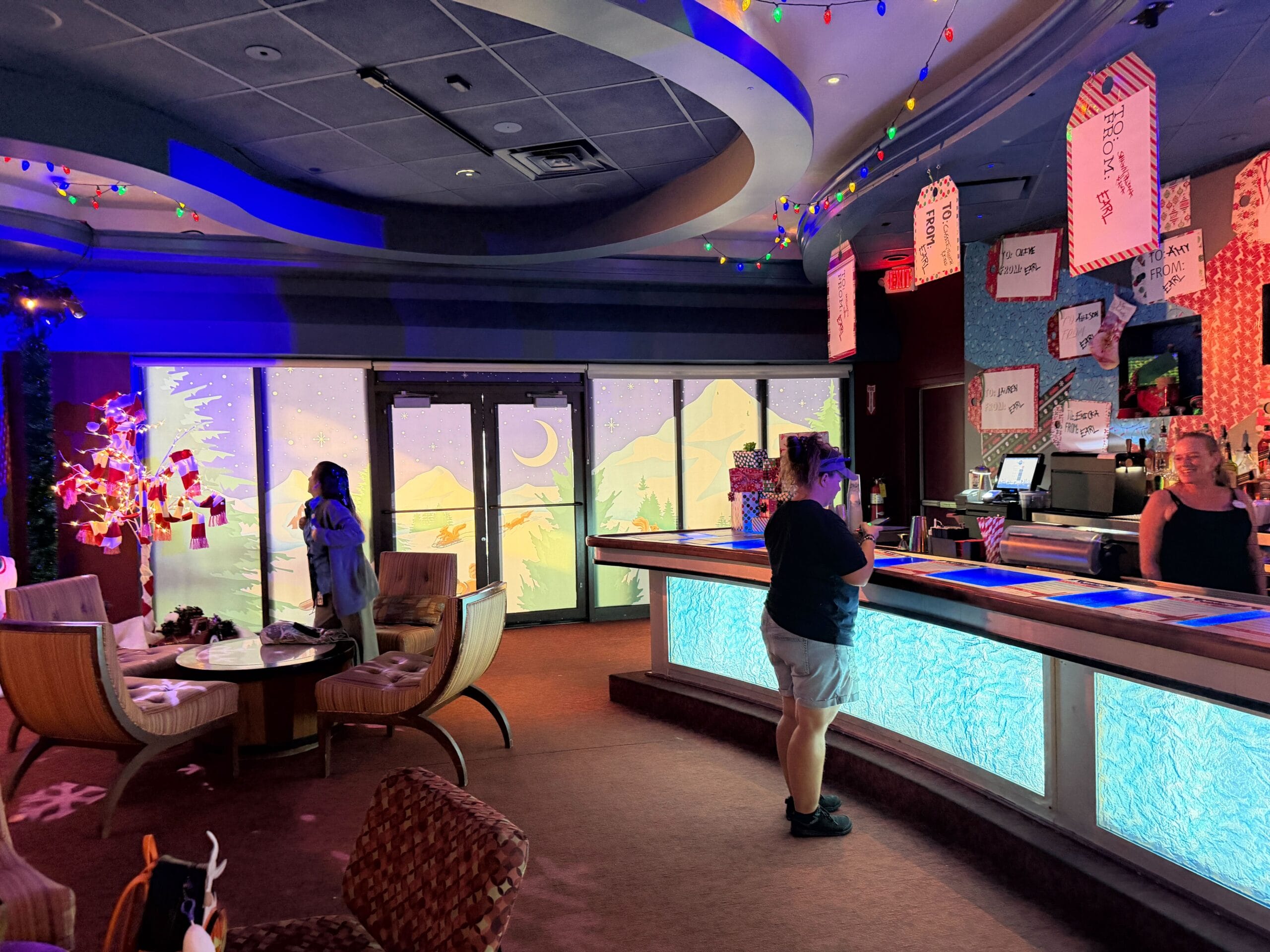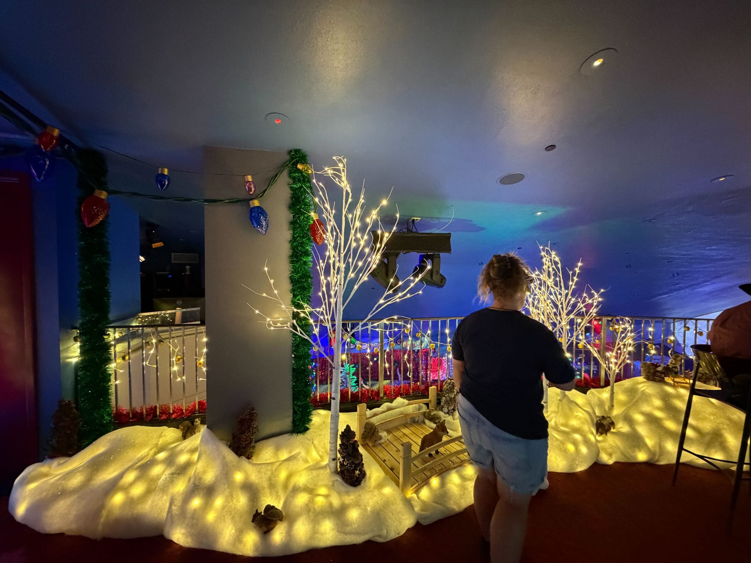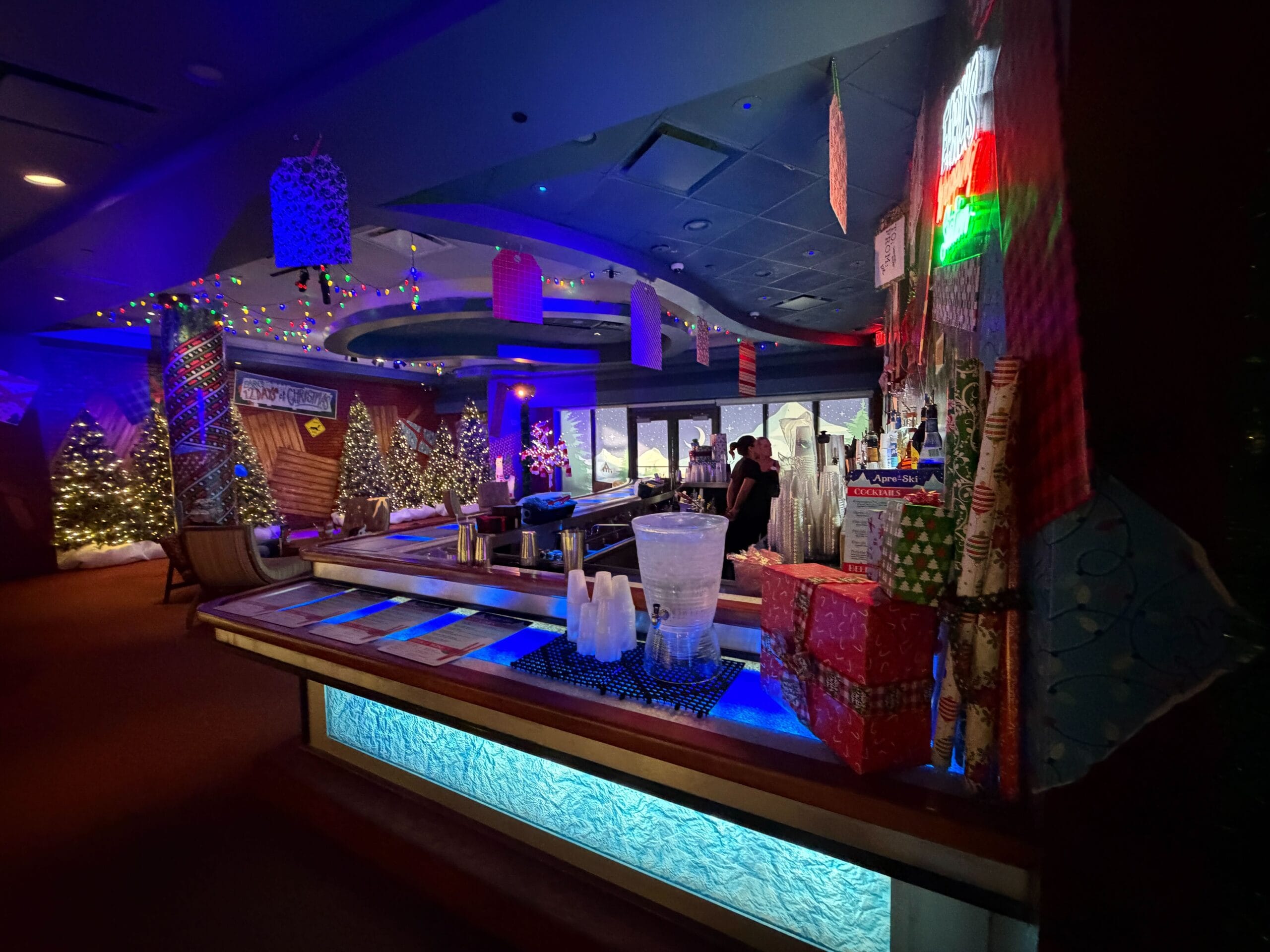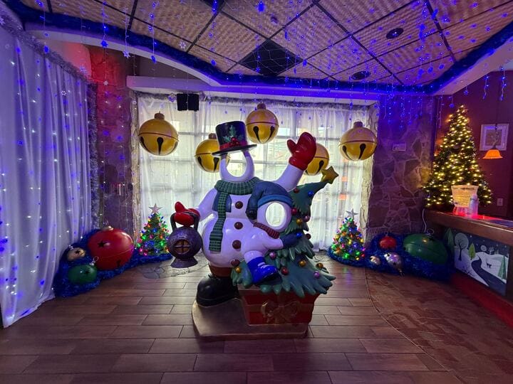 The bar is decorated with faux snow and lighted figures.