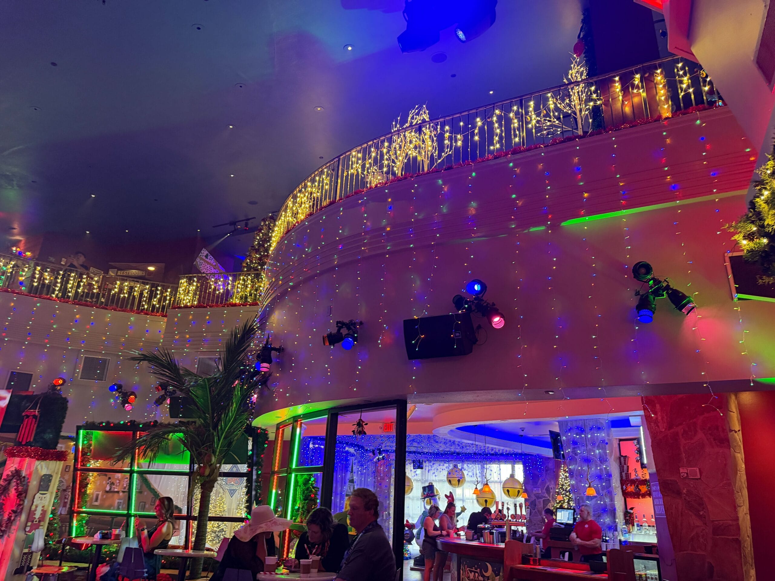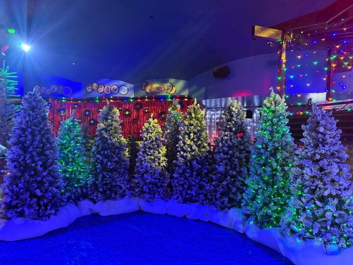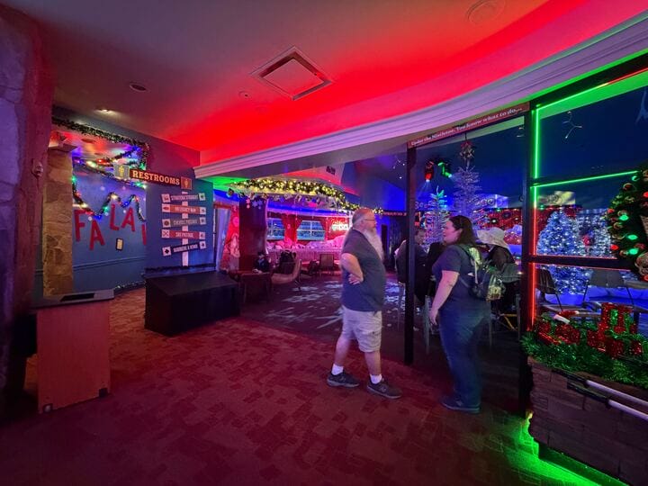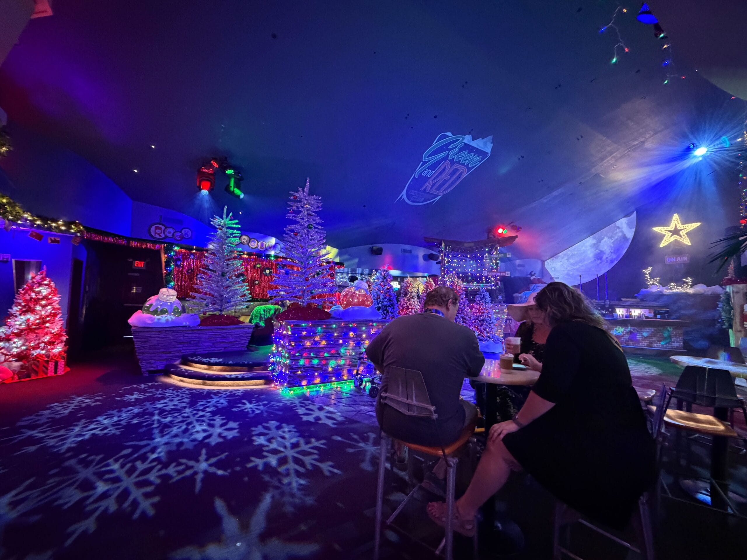 The bar is decorated with faux snow and lighted figures.