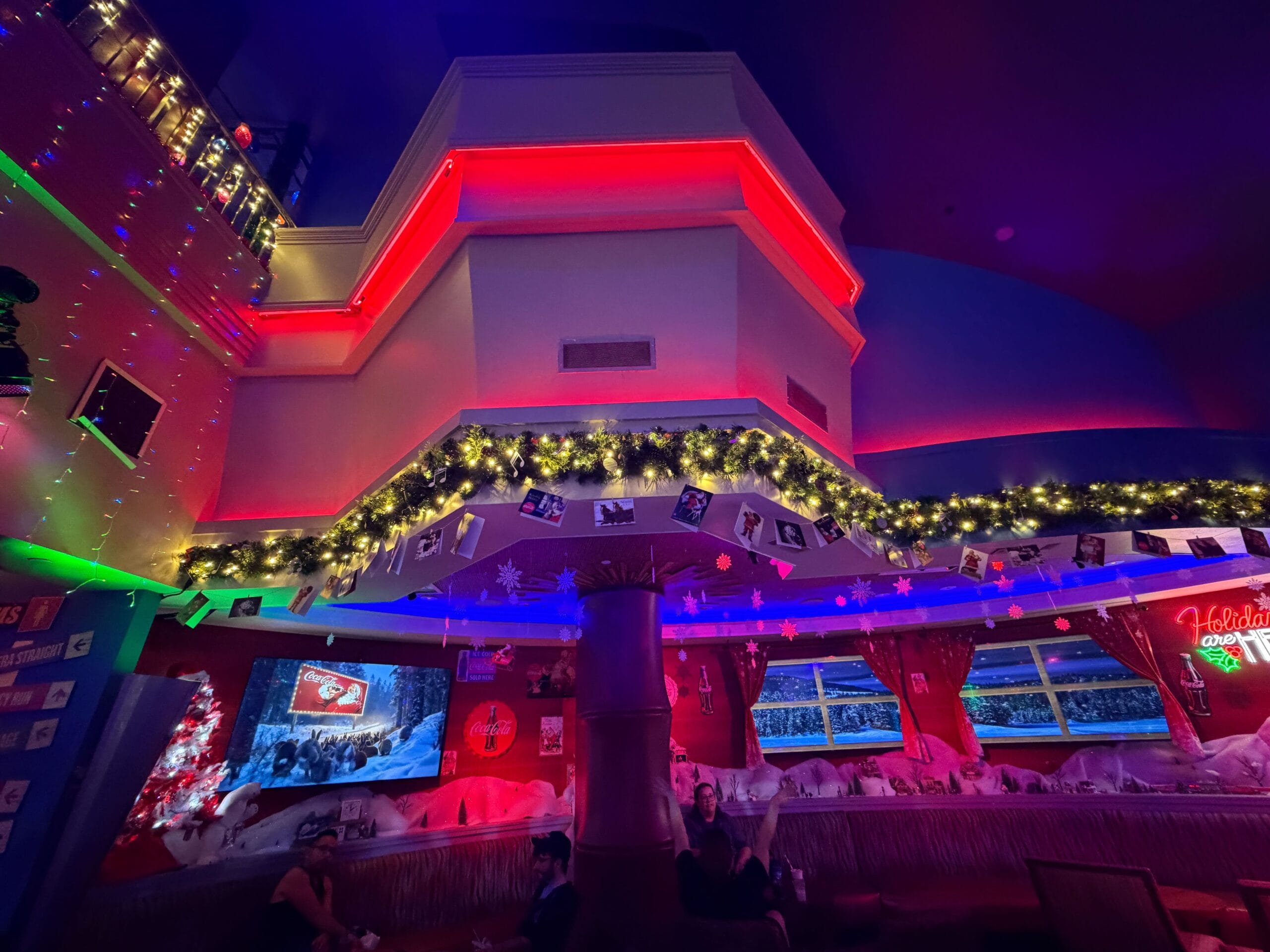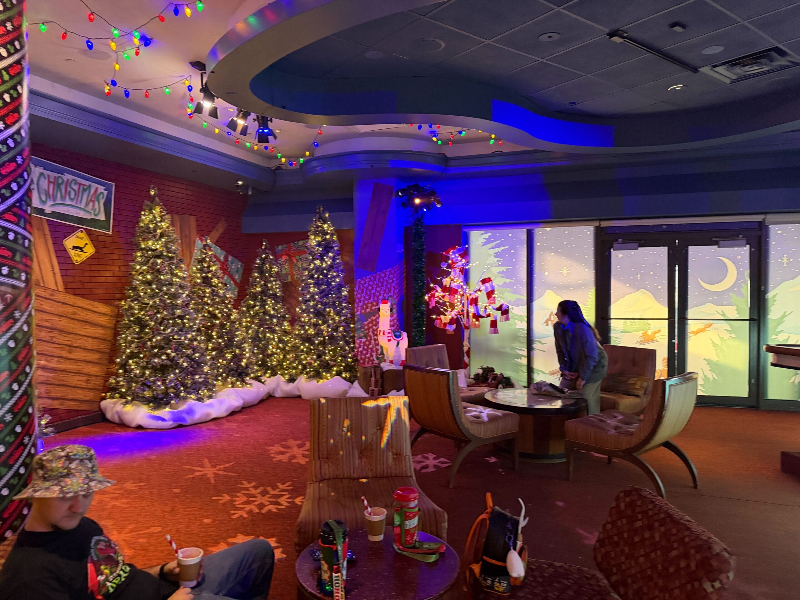 The upstairs seating area is also decorated with snowflakes projected onto the floor, seating, and tables.