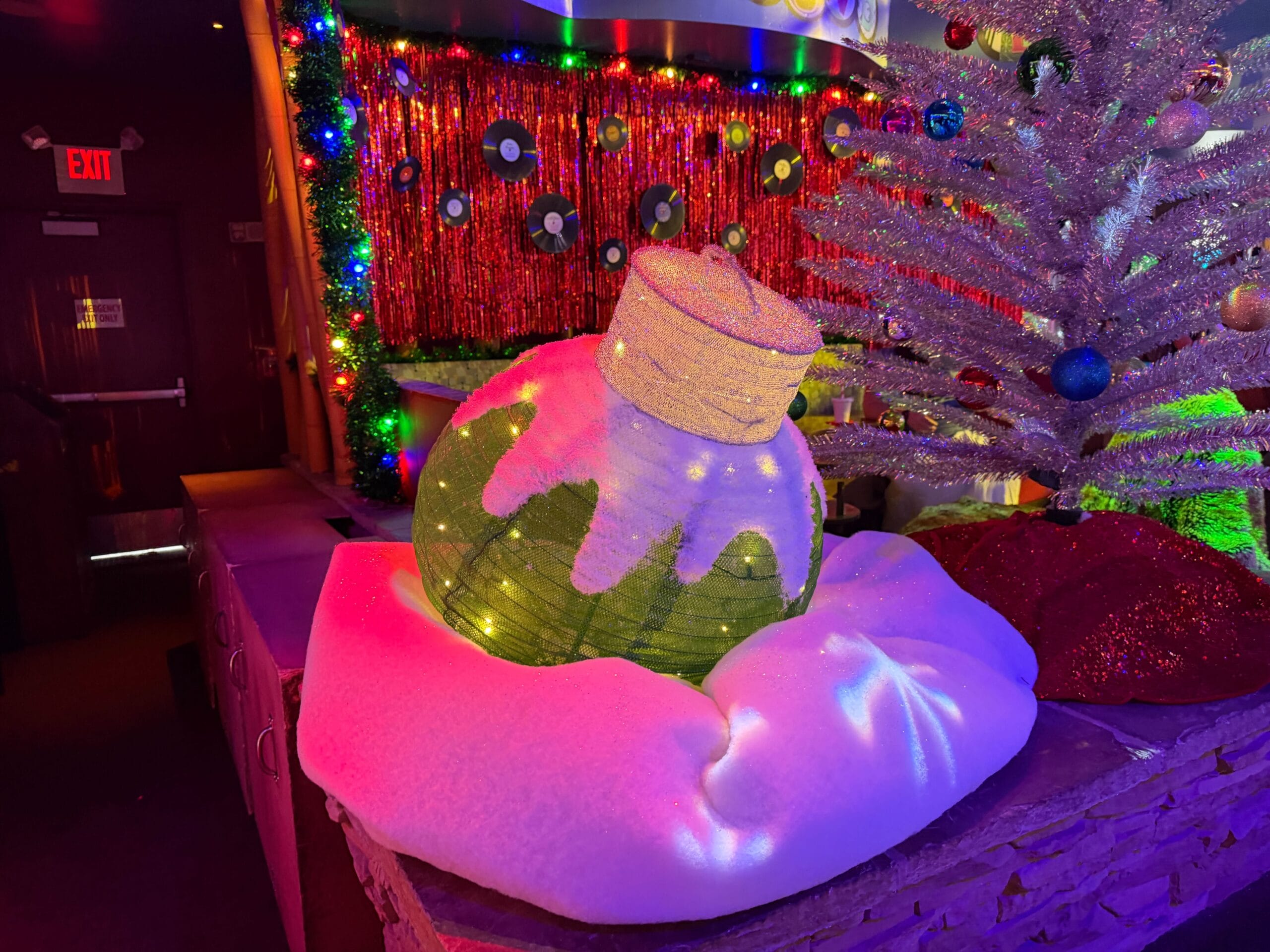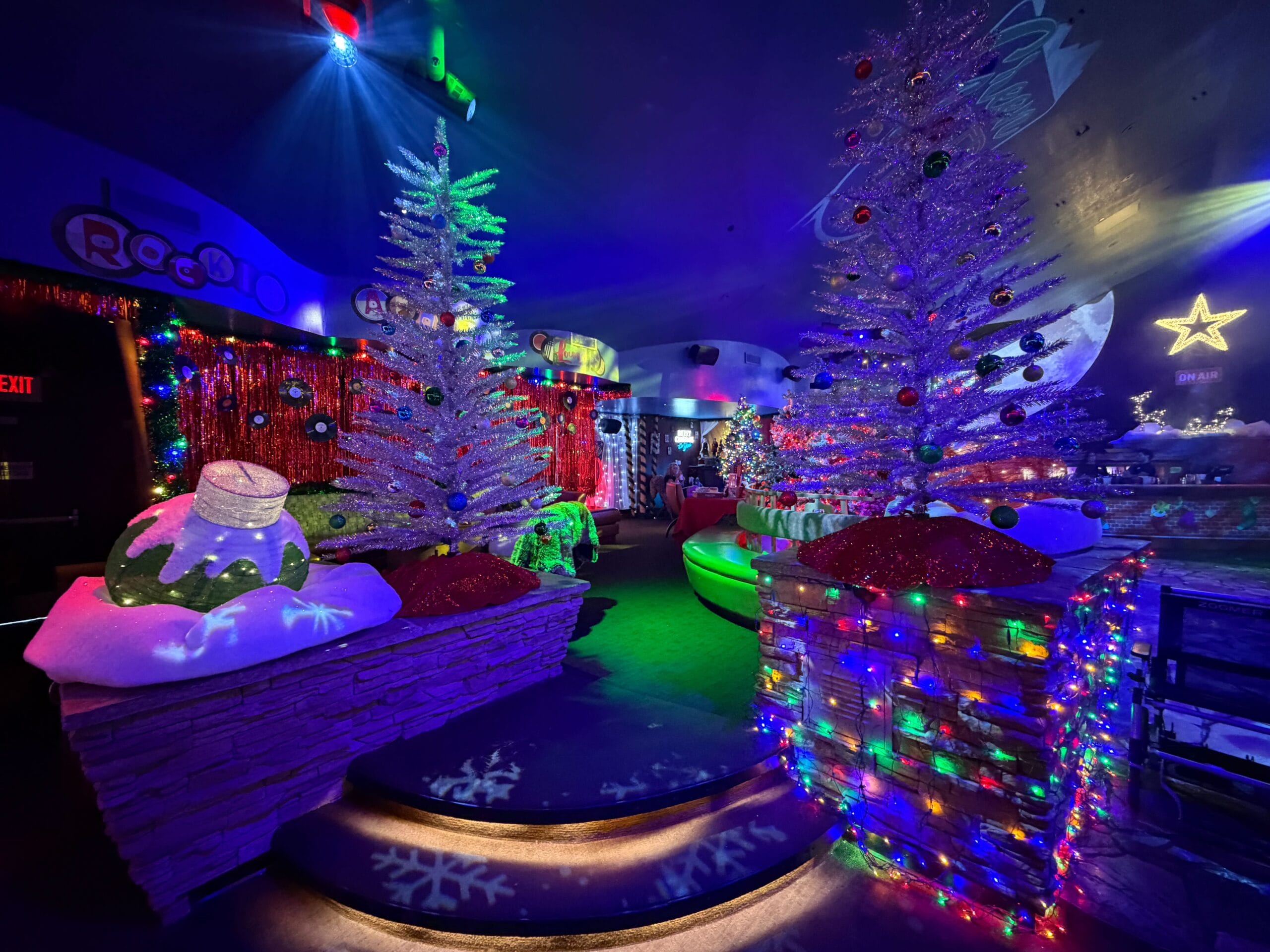 There are several photo-ops, including a snowman prop and a snow globe. The dance floor is illuminated with icy blue light. Green and blue spotlights circle the space.