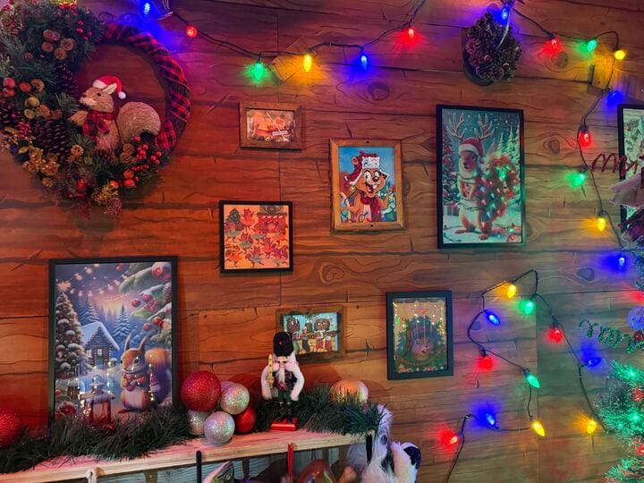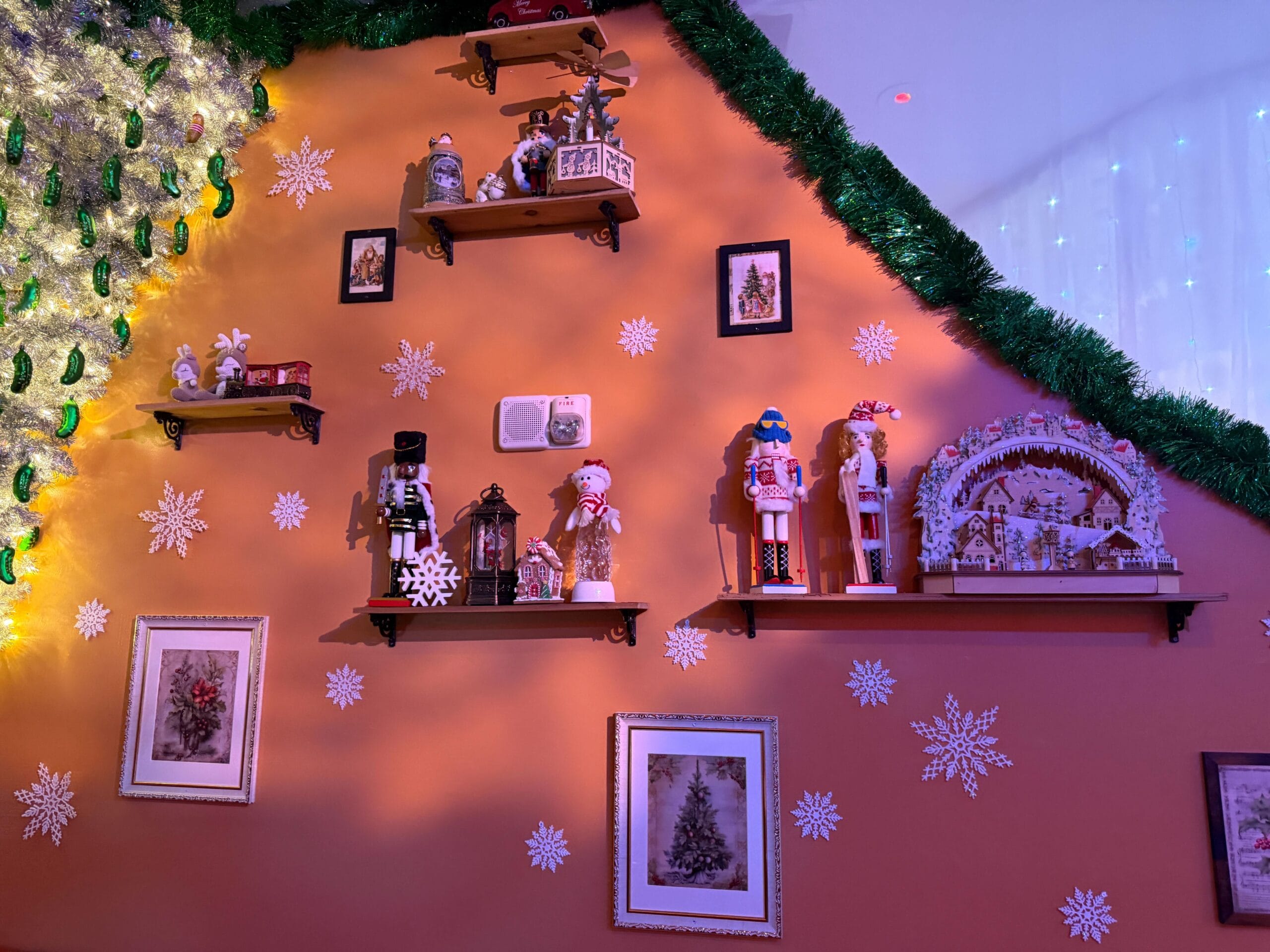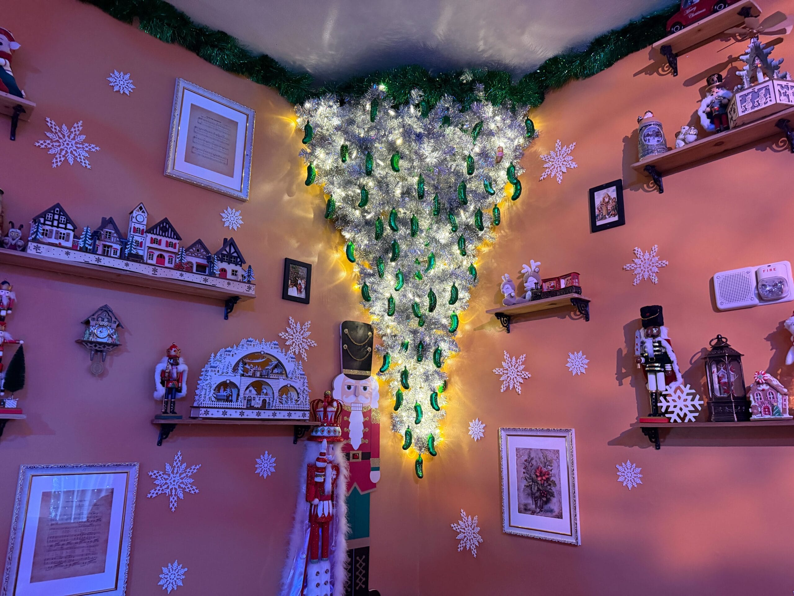 One wall shelf features a Christmas village and a snow globe. Rows of nutcrackers are on other shelves. Paper snowflakes are stuck to the wall. An upside-down Christmas Pickle tree hangs in the seating area.