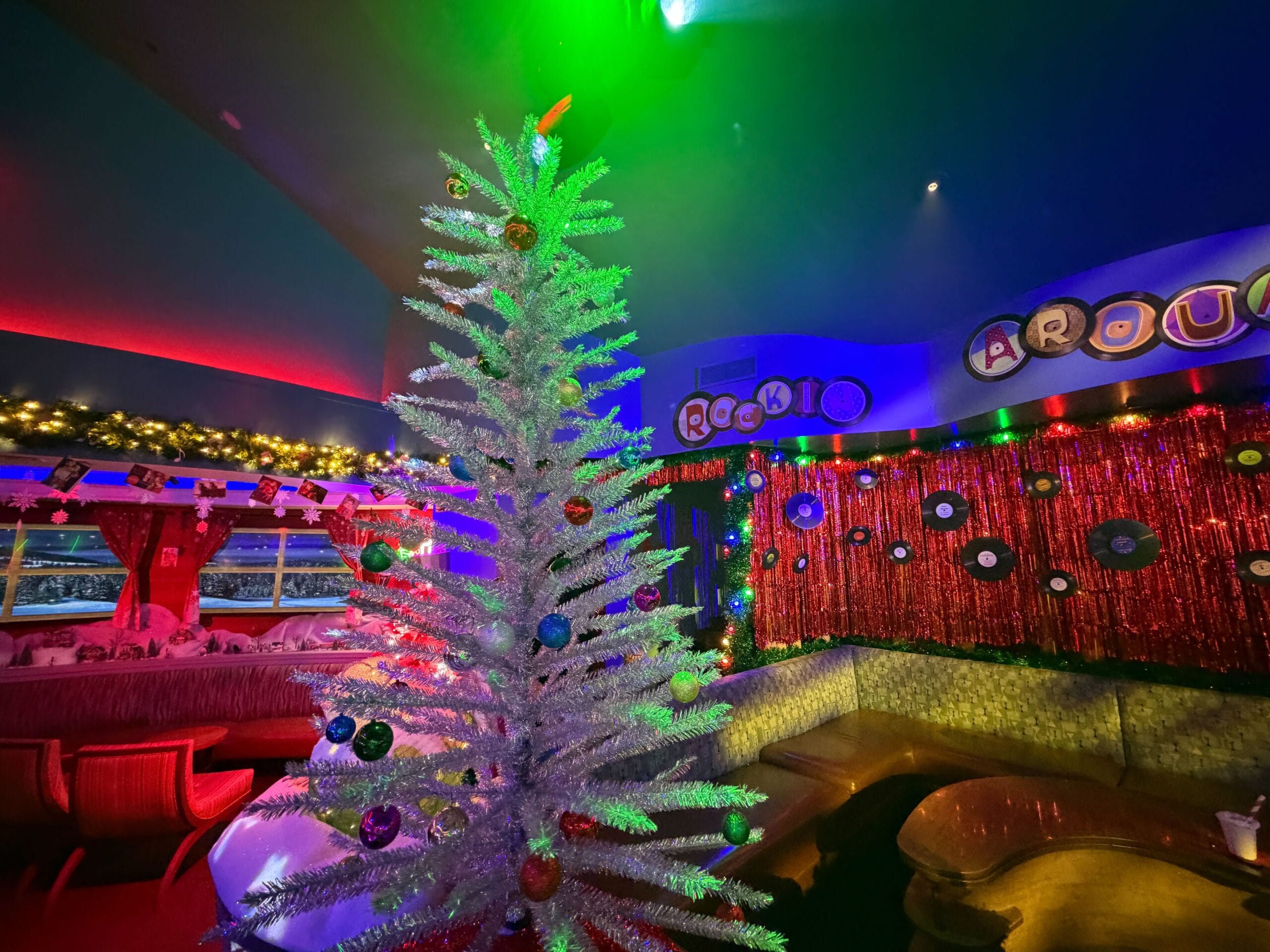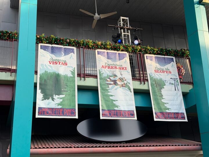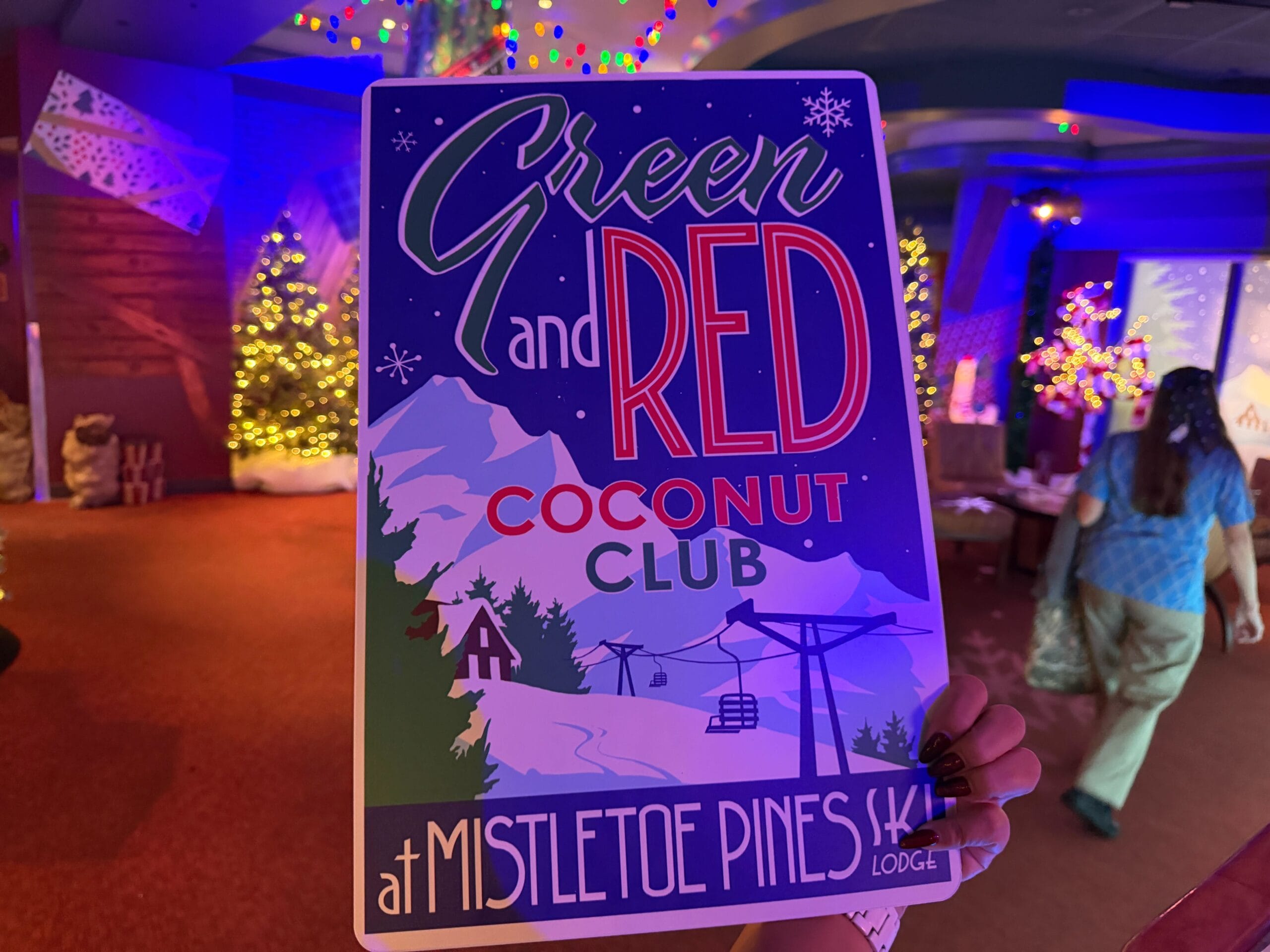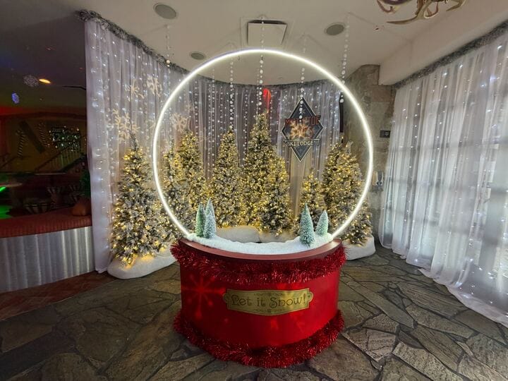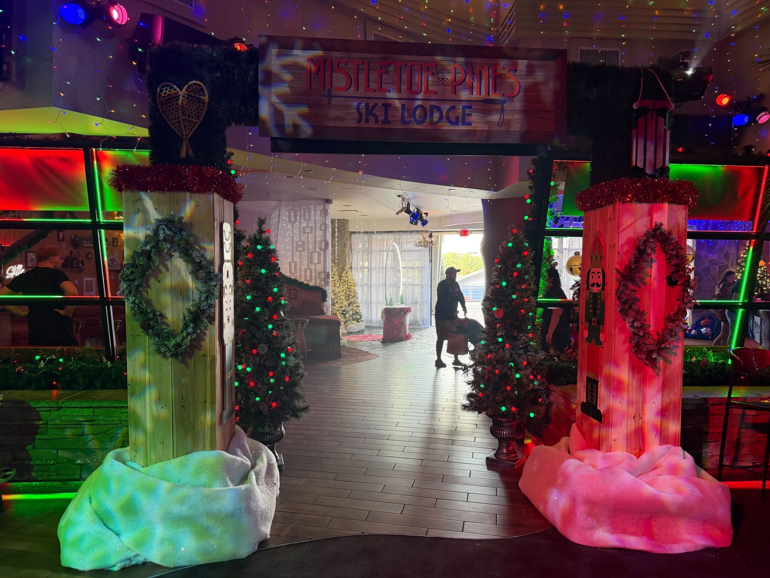 Signs above the dance floor entries read “Mistletoe Pines Ski Lodge.”