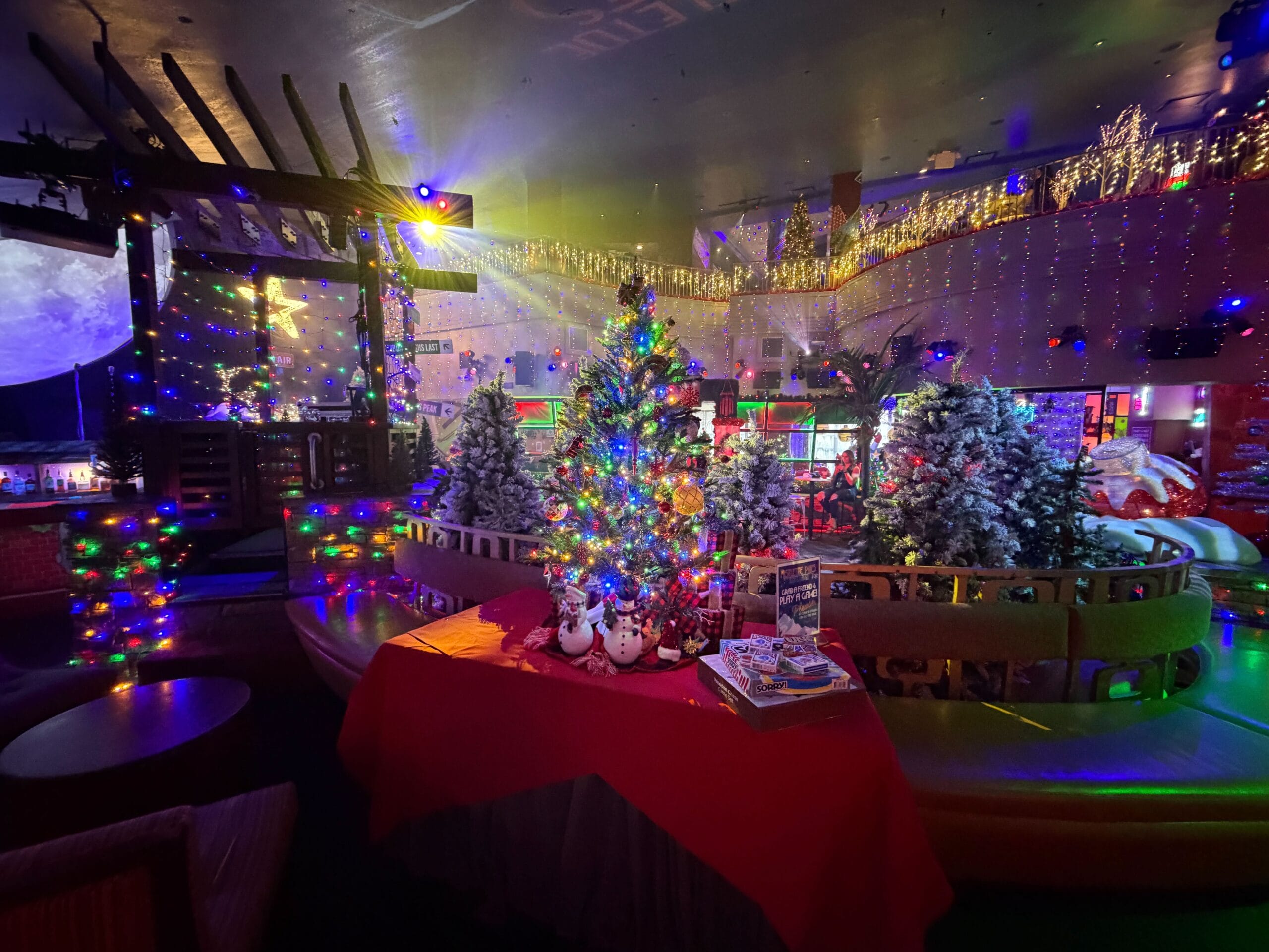 Tables are set up for card and board games available for guests to use. Decorated trees sit around and on top of certain tables.