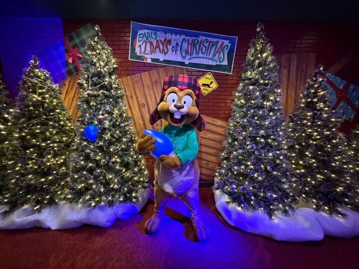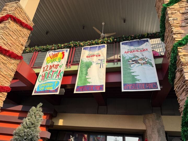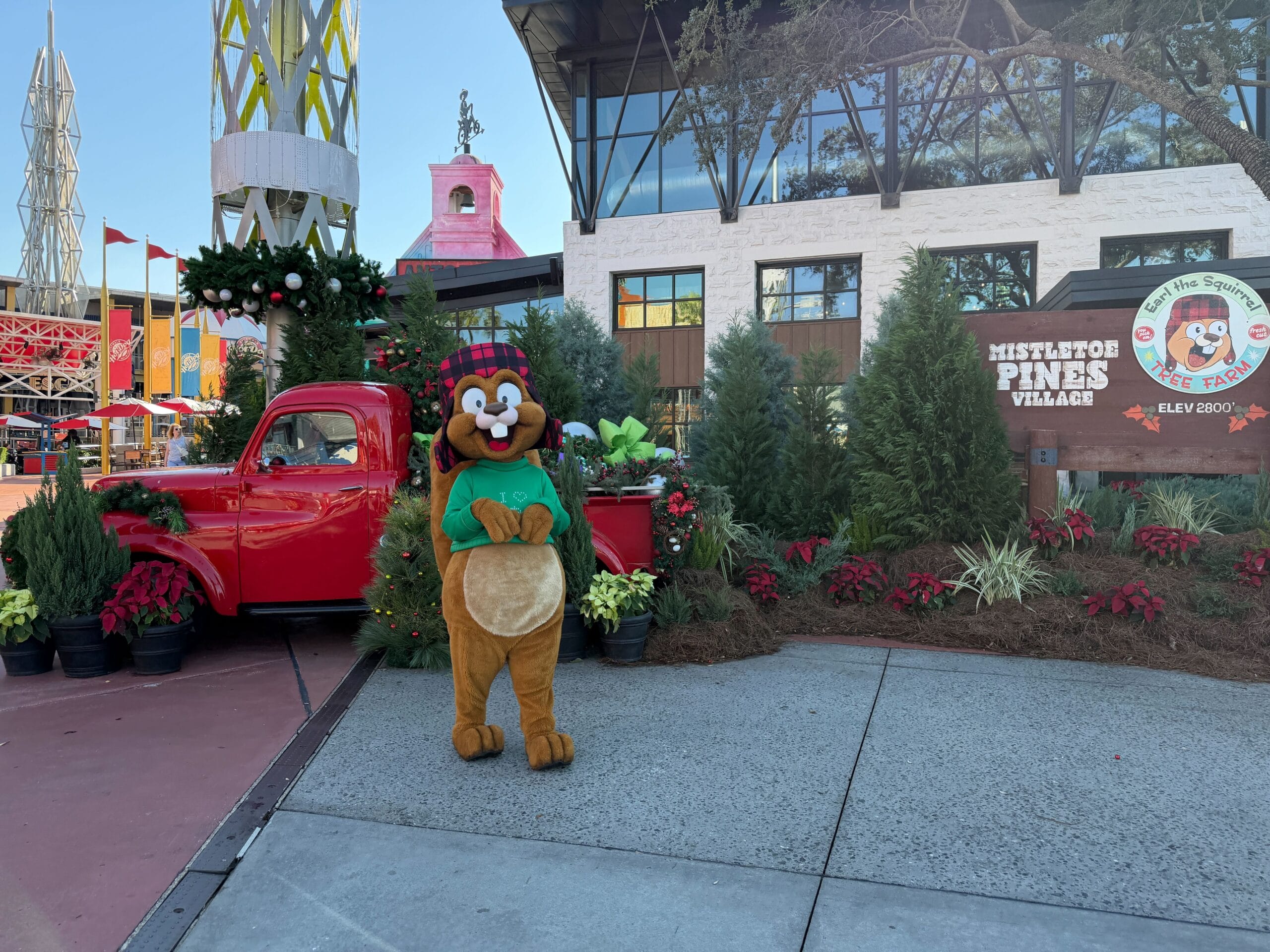 Before you head out, check out Earl’s truck by the Epic Preview Center. The red, vintage pick-up is parked amongst holiday foliage and trees right beside the wooden Mistletoe Pines Village sign.