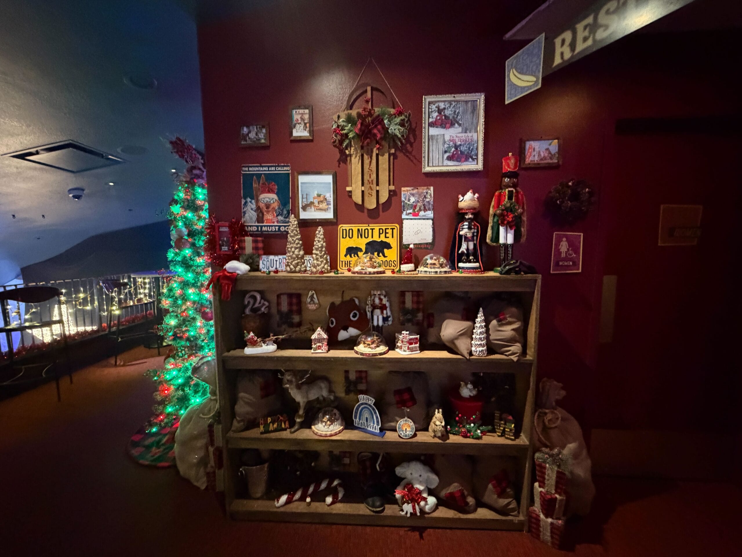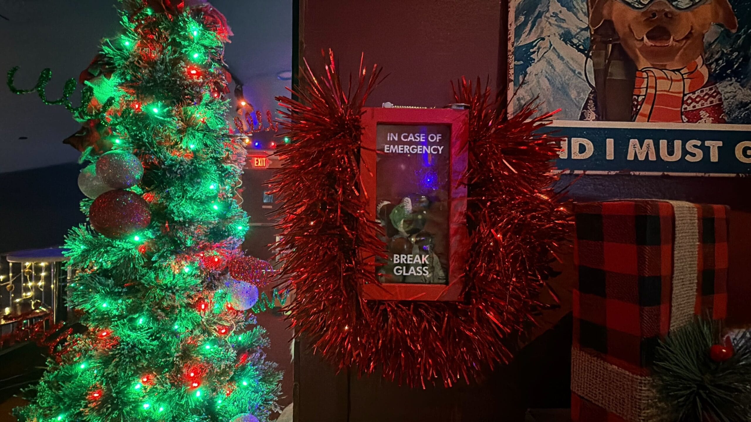 It’s adorned with garland and Mistletoe Pines travel posters.