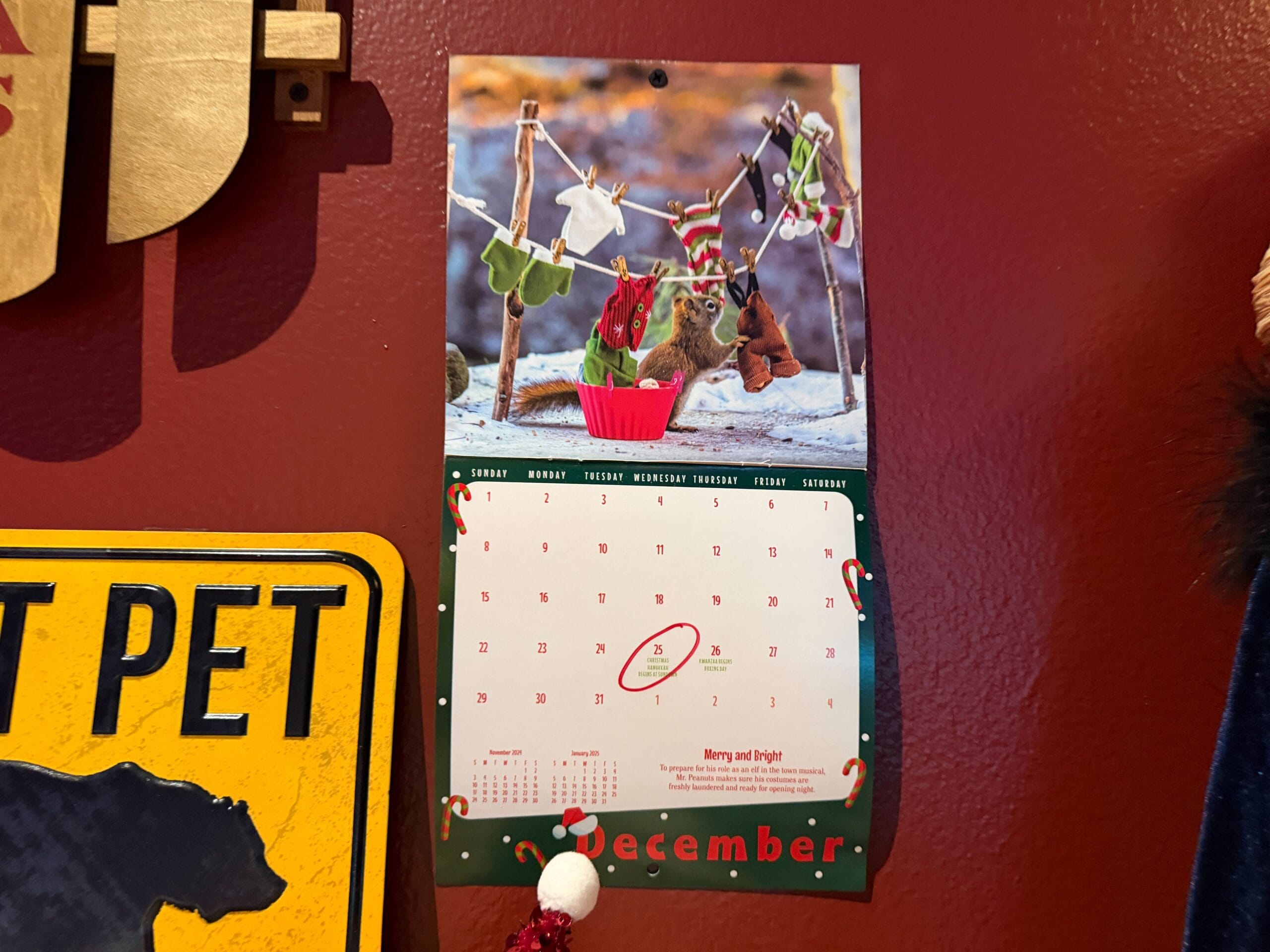 A wreath and acorn garlands are above. Along the wall are various portraits of the squirrel family and a calendar.