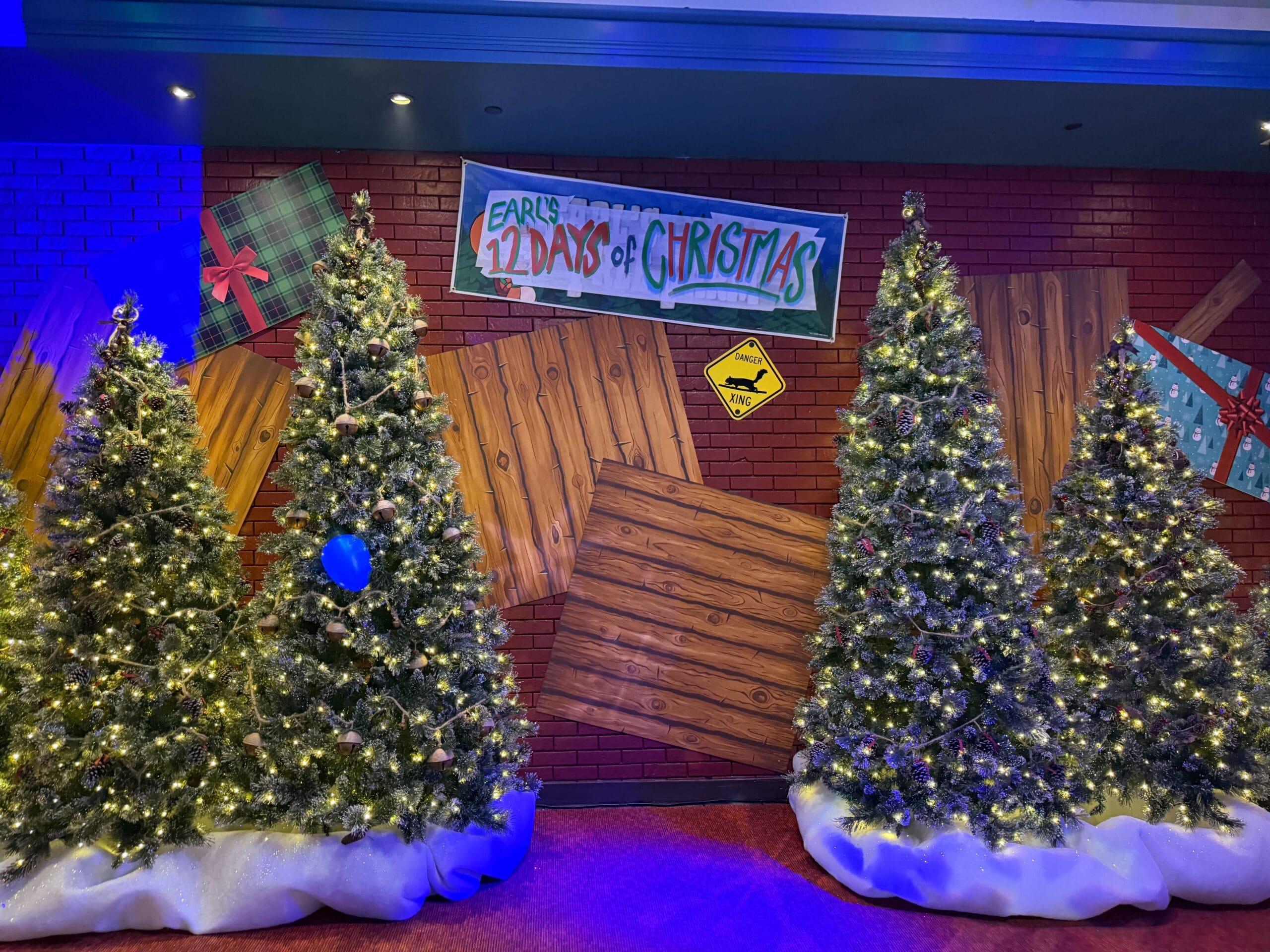 An Earl-style “12 Days of Christmas” list is projected onto the wall with items like “acorns tumbling” and “a blue light to a pine tree.”